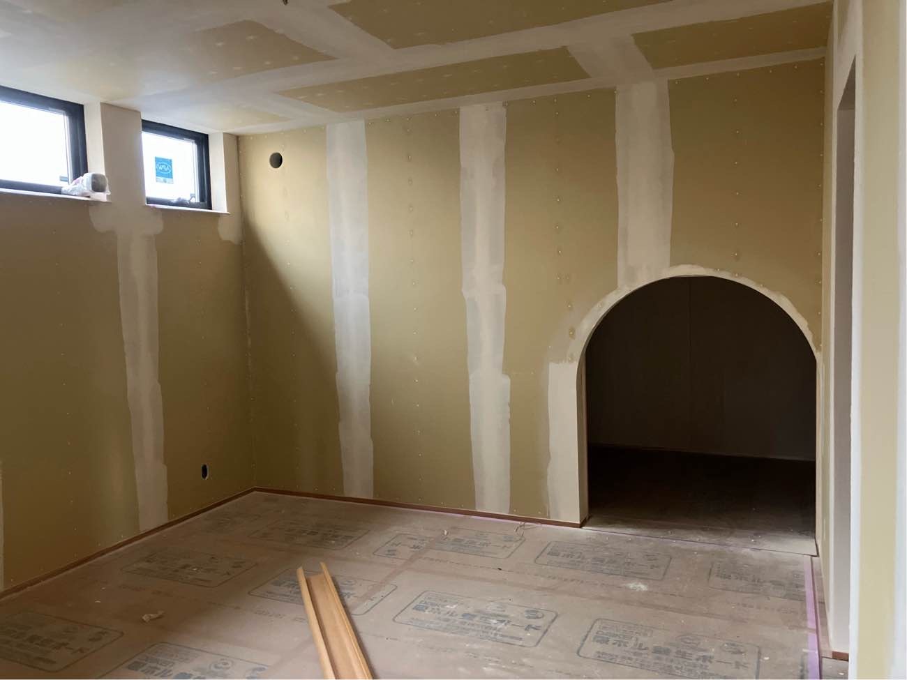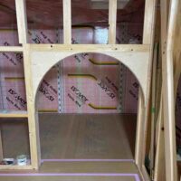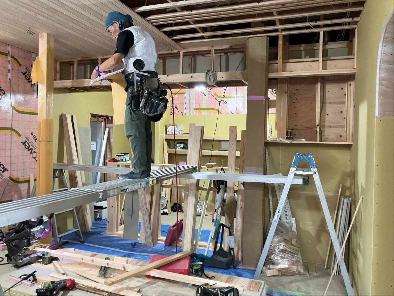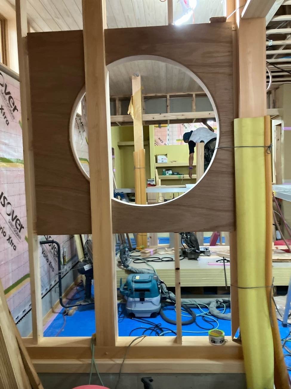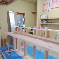 階段の手すり壁や、各所のカウンター下地、アール壁(こちらは洋風)の下地も取り付けられました。k保木大工さんが、こちらにも応援に来てくれています👍