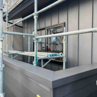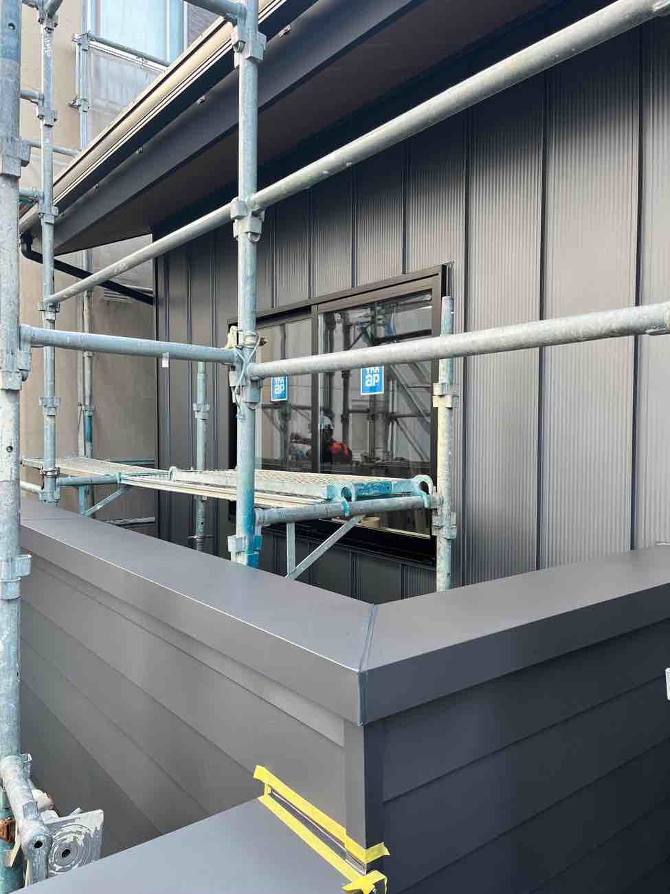 外部もy江板金さんが、最終工事に入っています。「横張りを4方張る事は滅多になく出隅の部分で最後に目地がきれいにあったのでホッとした事や、継ぎ目なく張るために8人掛かりで張って大変だった~材料の搬入で1枚は出来ないと言われる事を期待していたんだけど入れれるならやるしかないもんね~(笑)」と、本当に大変だったと思われる事を楽し気に話していただき、良い職人さんだ~としみじみ思いました。
