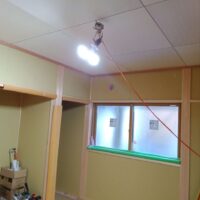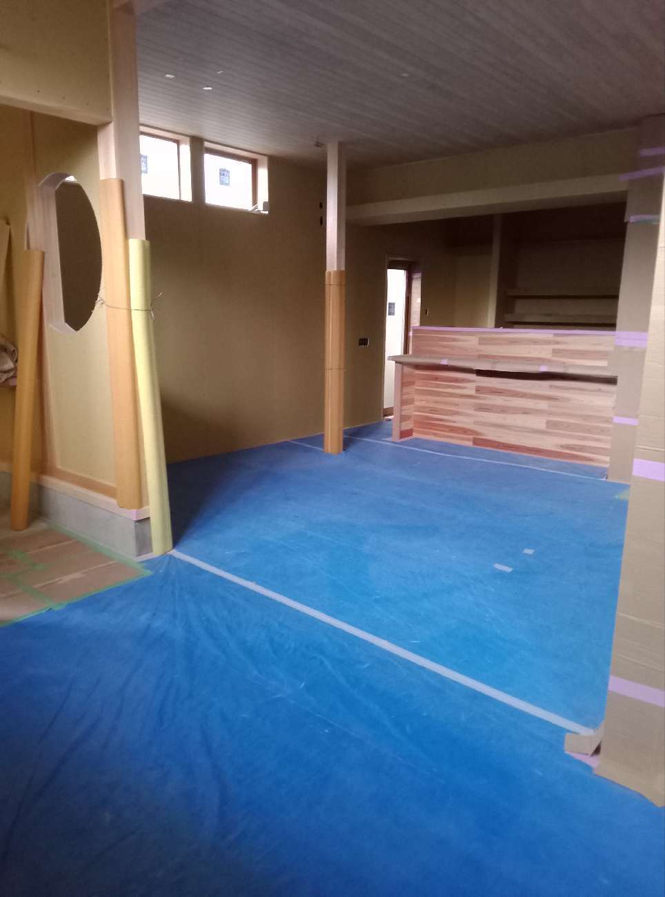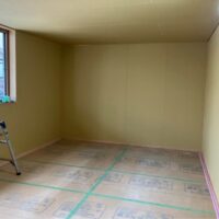 母屋も、内装工事に着手しています。クロス工事前に、Eエスさんが塗装を施した様子です。