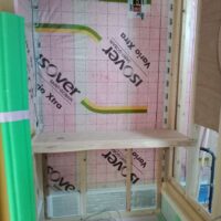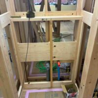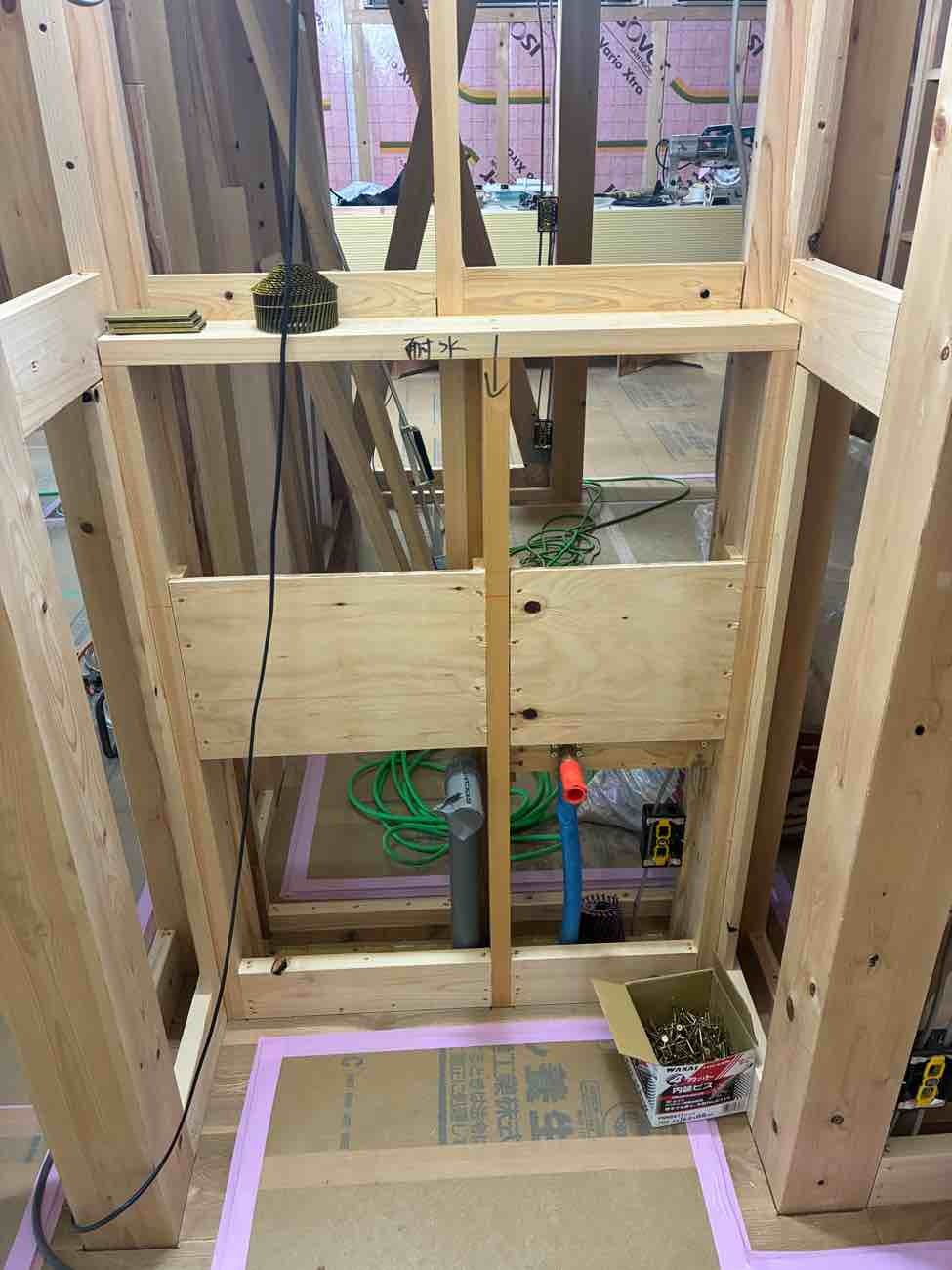 今回洗面は、脱衣室と廊下に1台ずつ設置され、廊下は使う頻度は少ないけれど見栄えを良くしたいという事で、費用対効果でかなり悩まれていましたが、最近出たLIXILさんのカスタムバニティと言う商品が造作風で見た目もオシャレ、お値段もお値打ちに入るという事で採用されました。確かにいろいろ選べる化粧台、いいネーミングです👍フロートタイプで床がみえるので、見た目や掃除のしやすさなどから、壁給水壁排水にしたいという事で、配管用のカウンターを造っています。