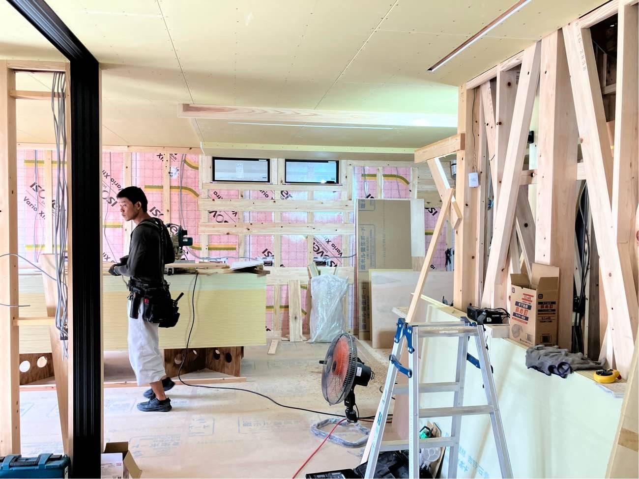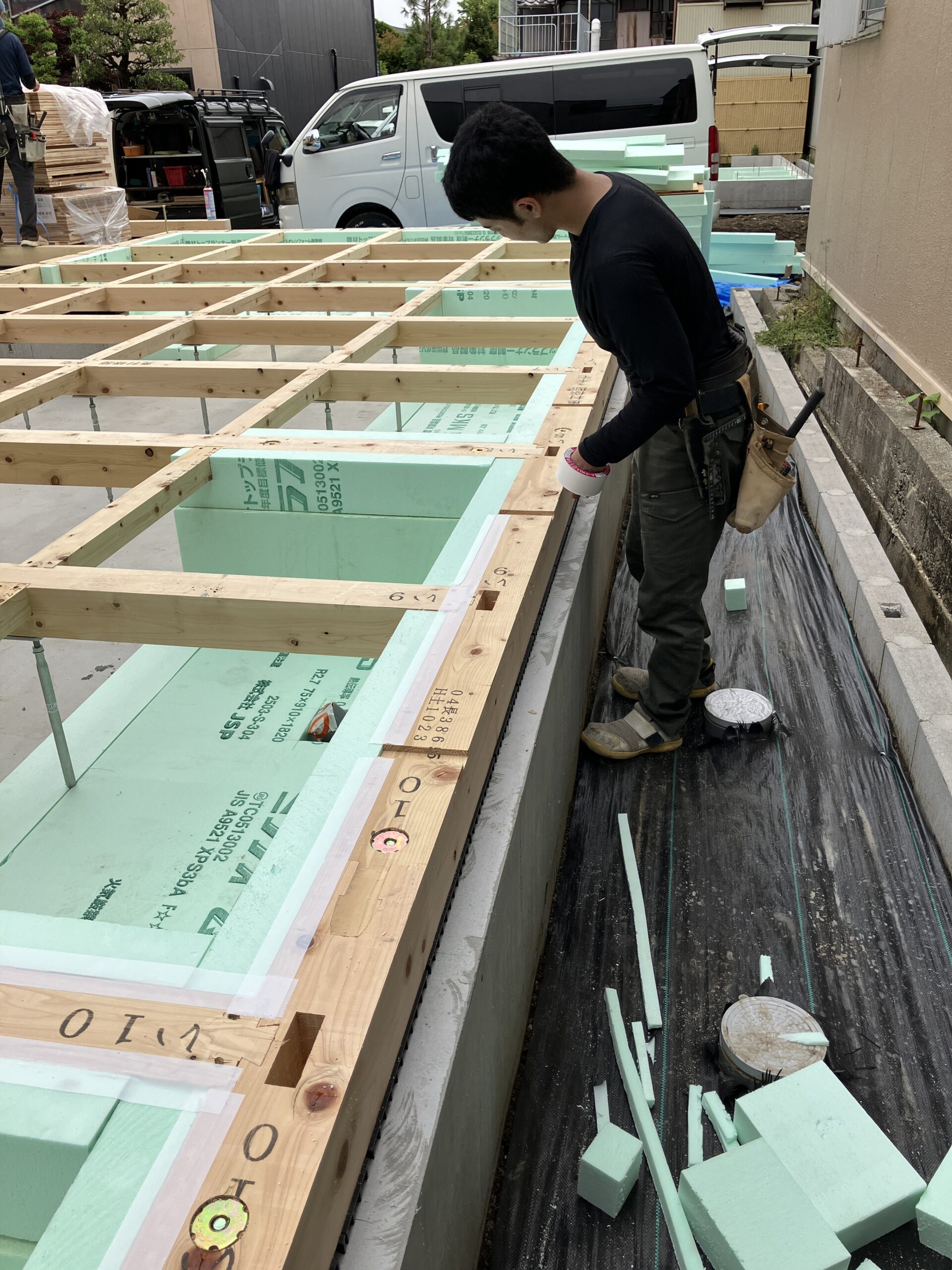 1階も、先日選んでいただいた材料が、キッチン前カウンターとなりました👍外周部の基礎立ち上がり部分に、可能な限り断熱材を施しています。離れは床に断熱材が施されていないので、少しでも足元が冷えないといいなぁと思います。