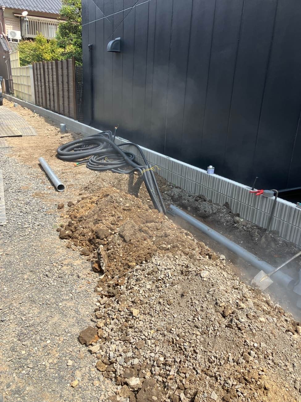 母屋もh典棟梁とk保木大工さんによって、こちらも木工事の終わりが近づいて来ています。足場が外れたので、水道屋さんと電気屋さんが一緒に配管の埋設工事を進めています。日本は電柱がある風景が海外の人に人気との事ですが、何だか変な感じですね電柱は景観を損ねる要素なのに。今回、前面道路が電力等埋設と言う事と、1敷地に2棟のため、空中を電線が渡るのも格好が悪いので敷地内も埋設しています。日本も無電柱化が進むといいですが、財源がなさそうなのでいつの事になるのかなぁ・・・バブル期にやってくれればよかったのに~