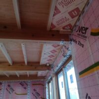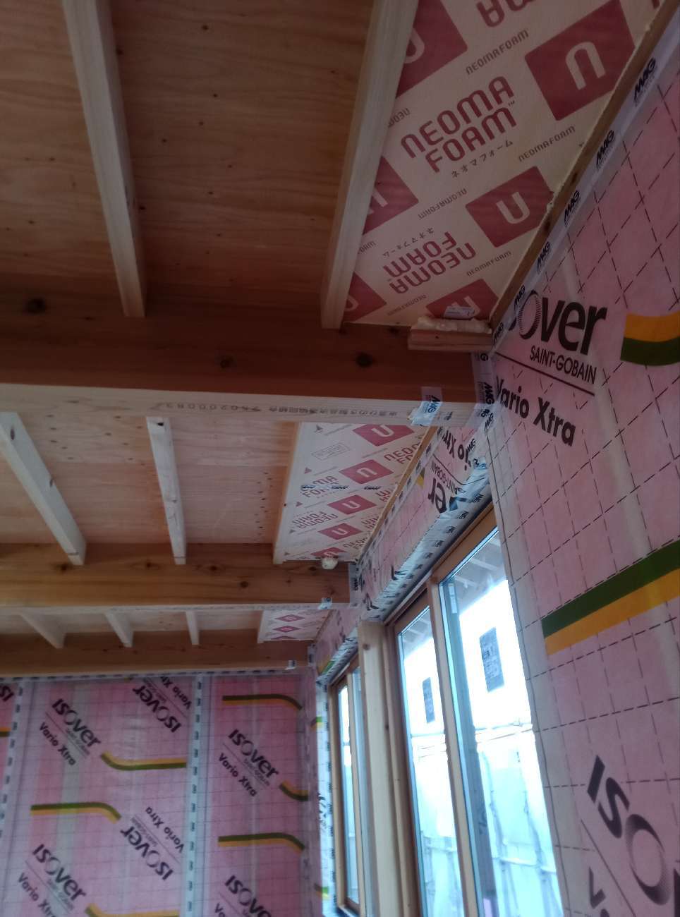 屋根は、桁上断熱が入っていますが、桁部分はどうしても屋根が下がってきて断熱の厚みが取れませんので、下から断熱補強をしています。断熱材は厚みが薄くても断熱性能が高い物を使用し補っています。