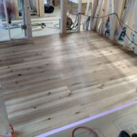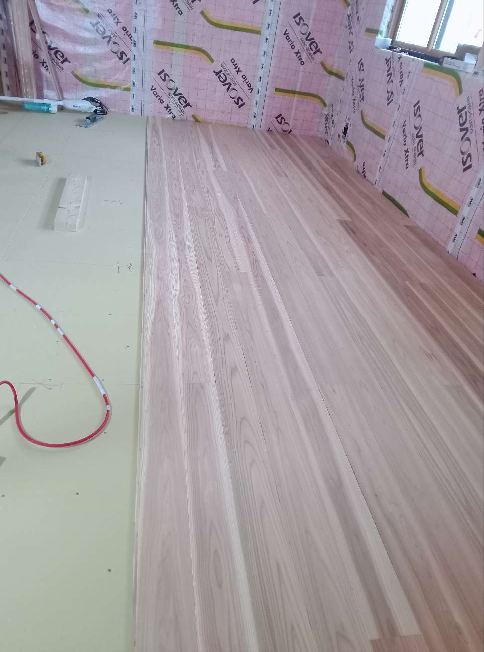 離れの2階は、天井の下地組を終えて、無垢の杉フローリングも張り終えています。補助金の金額分で節ありから節無しにグレードUPです👍