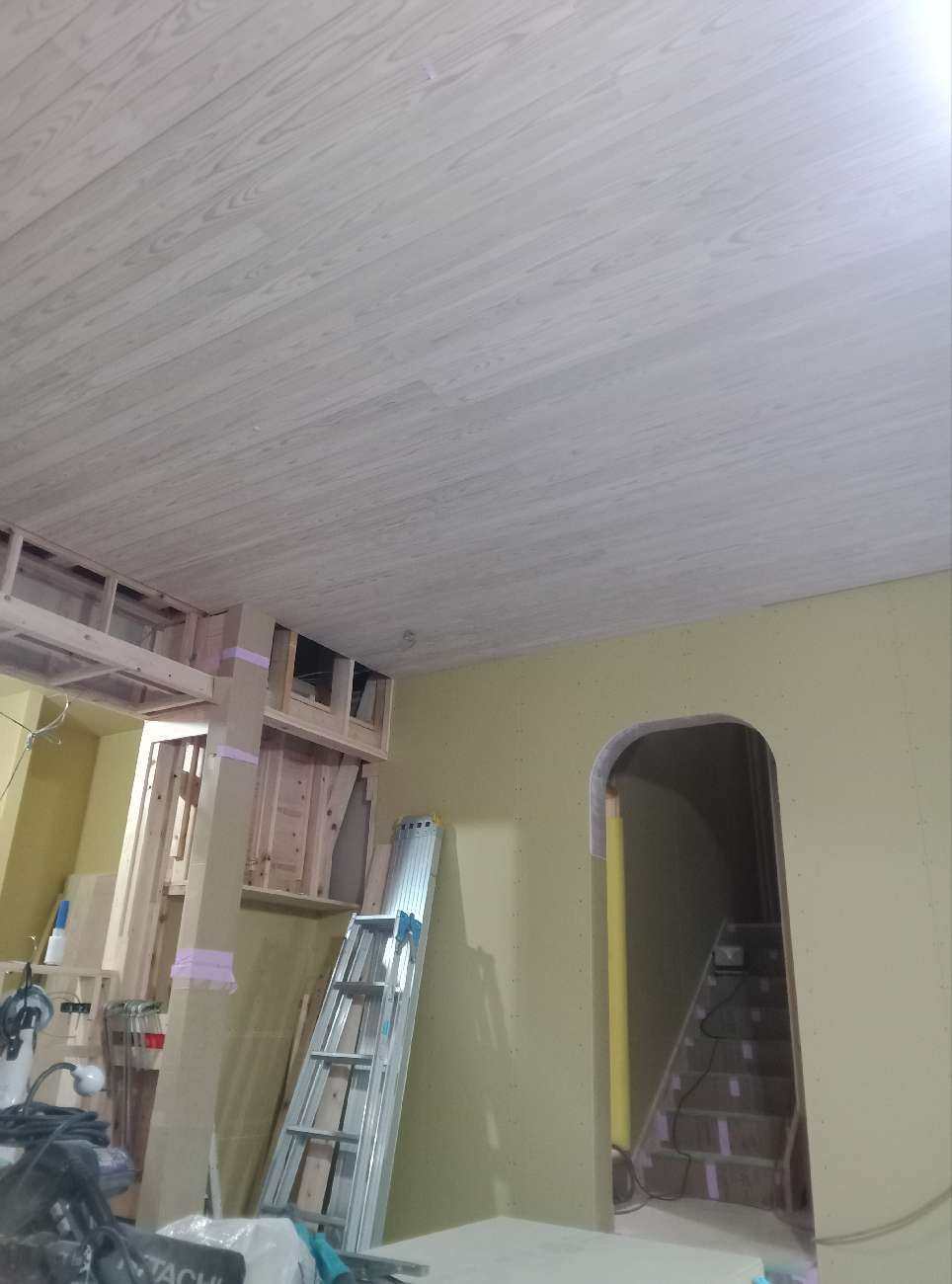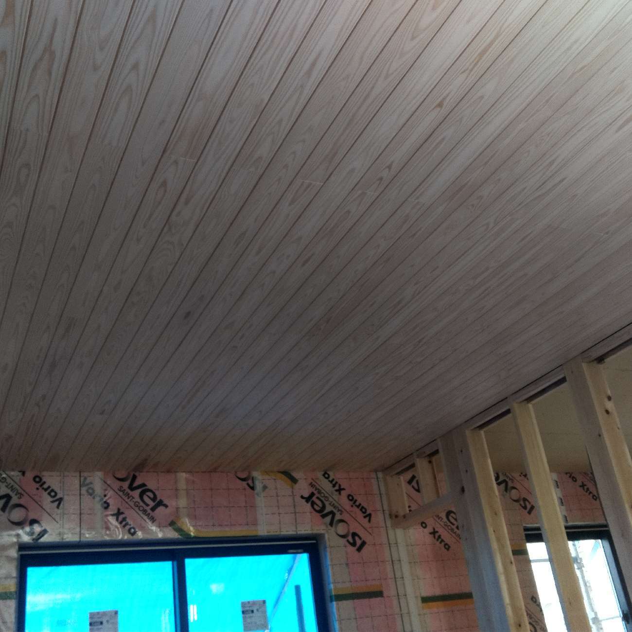 木工事(大工さんの工事)も終盤に差し掛かってきています。k池大棟梁が、ダイニングスペースの天井羽目板を張っている様子です。杉の羽目板ですが、赤身がほとんどない白身の部分なので、経年変化で色が焼けてくると桧と変わらない表情になってきます。