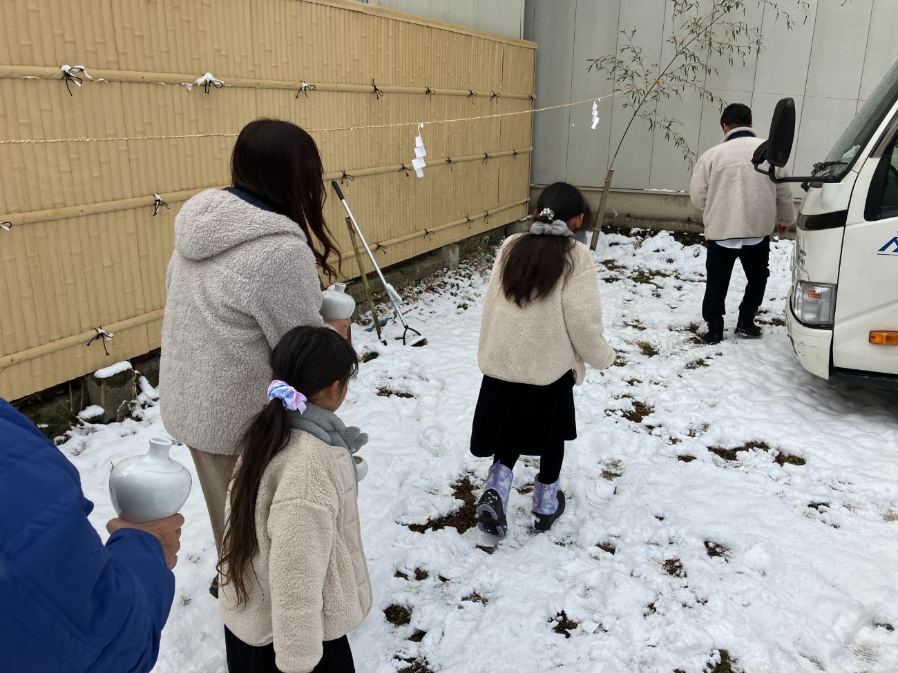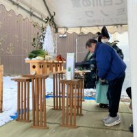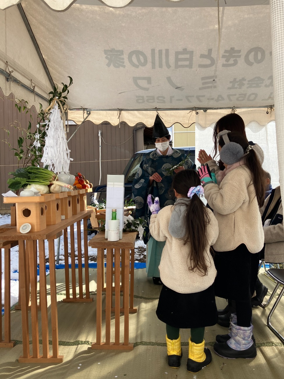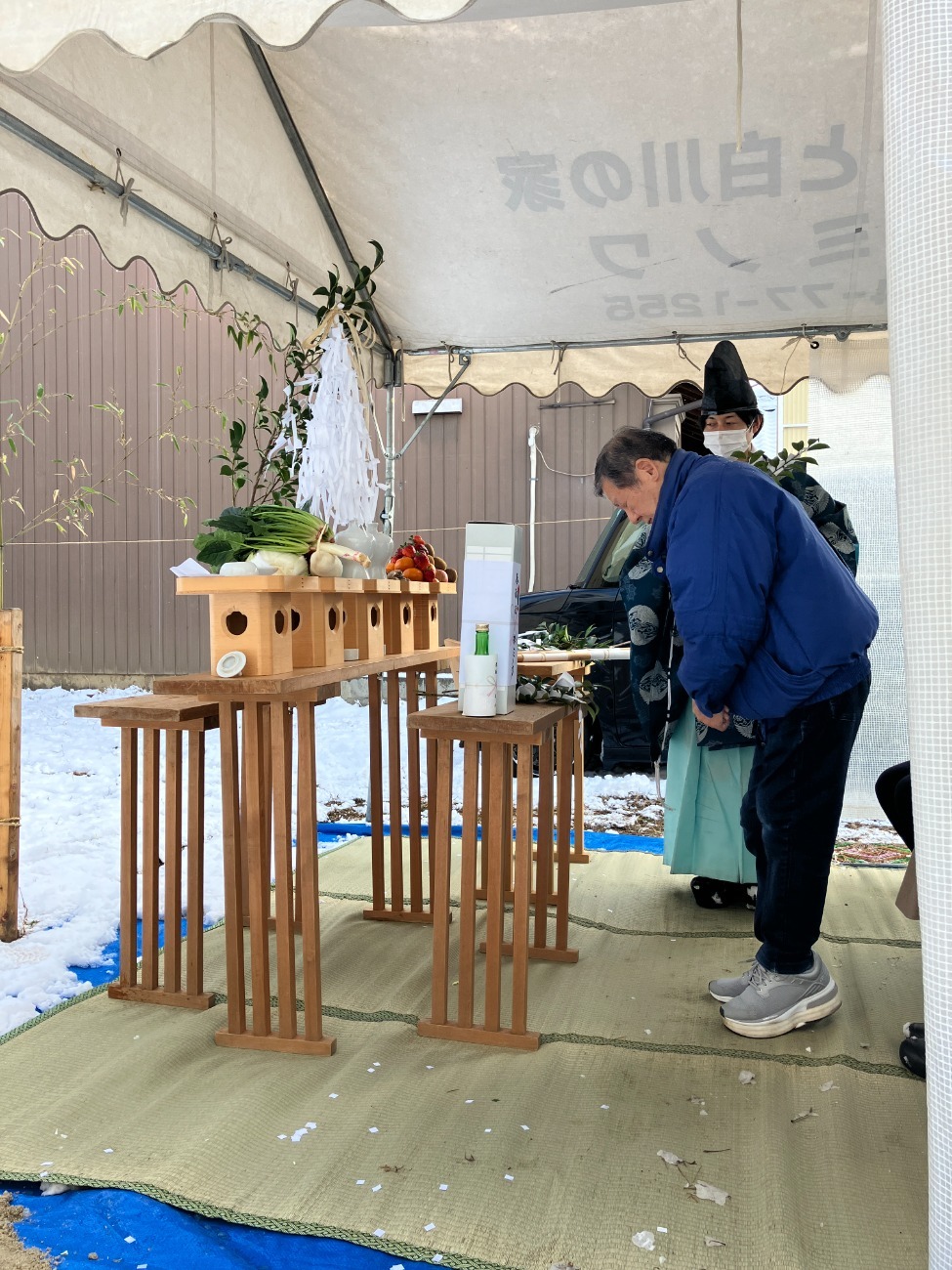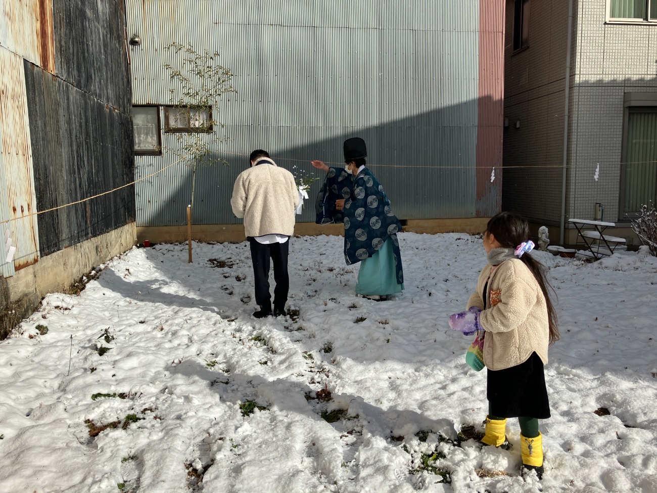 地鎮祭は、ドカ雪が降り一夜にしてこんな雪景色。せっかくの地縄は確認できず💦でしたが、無事に地鎮祭を行う事ができました。近隣挨拶の際に、私はタイルのアプローチのお宅で尻餅をつきましたが無傷でした。お尻の肉の大切さを痛感しました。そんな私が言うのもなんですが、最後まで無事にo様にとって良い家が建てれますように。