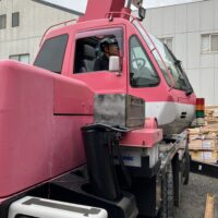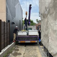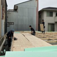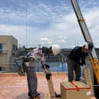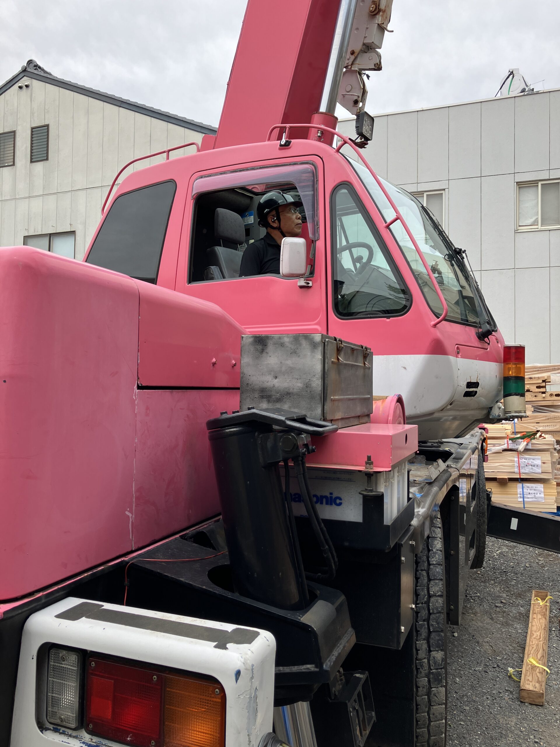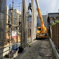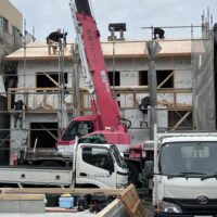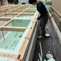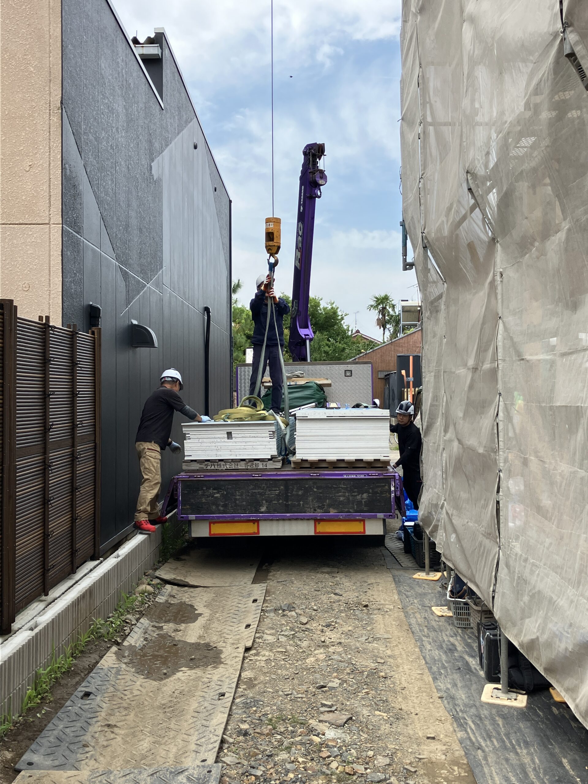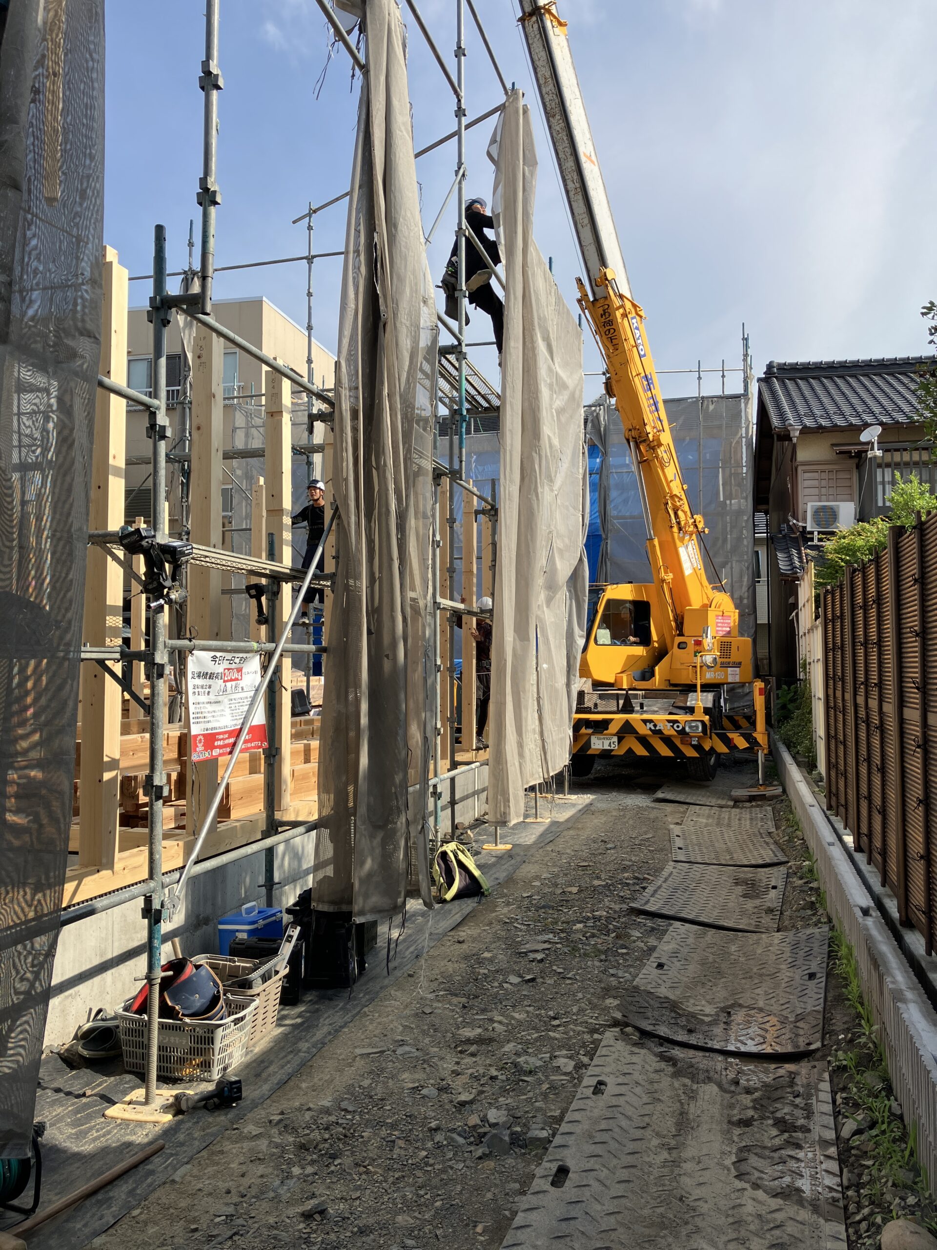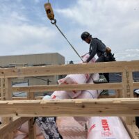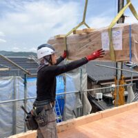 母屋と同じく、小屋裏空間で気密と断熱を取るため、建て方の際に張り上に敷かれた剛床に気密シートを張り、案外重たい断熱材もレッカーさんの力を借りて小屋裏空間に荷揚げしておきます👍