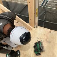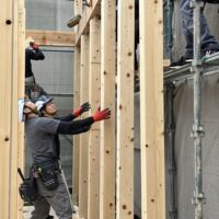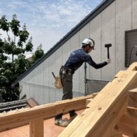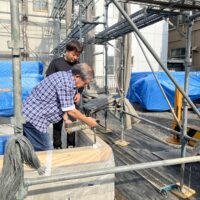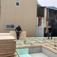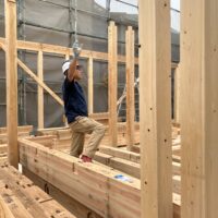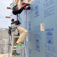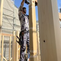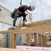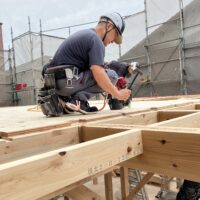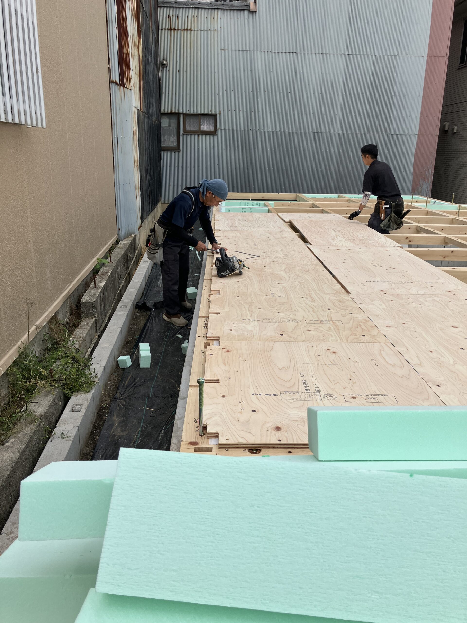 離れは平屋の部分がありますので、小屋組みを組む前に耐力面材を施工している様子と、h喜さんとf志君そっくり親子の共同作業風景です👍