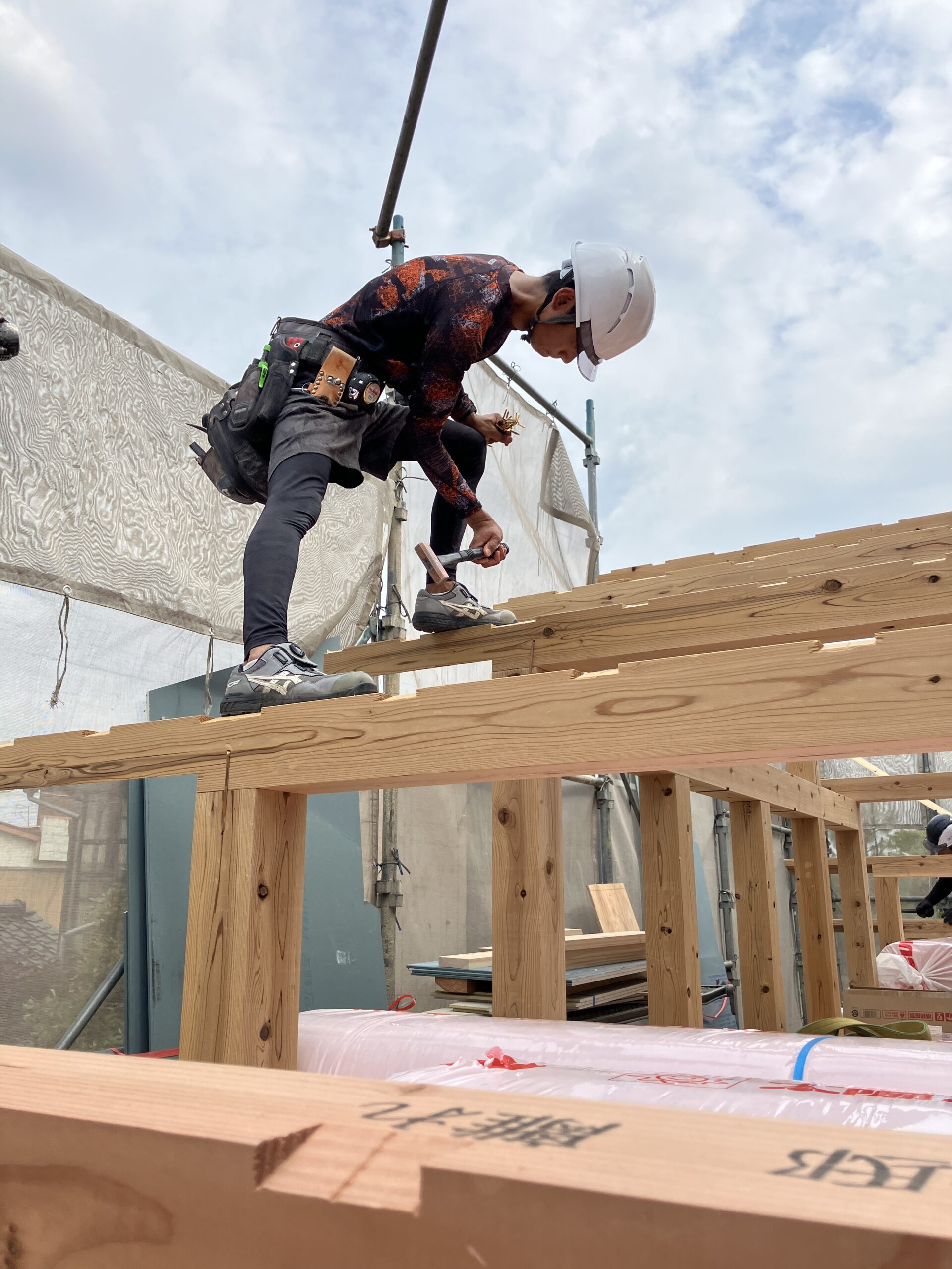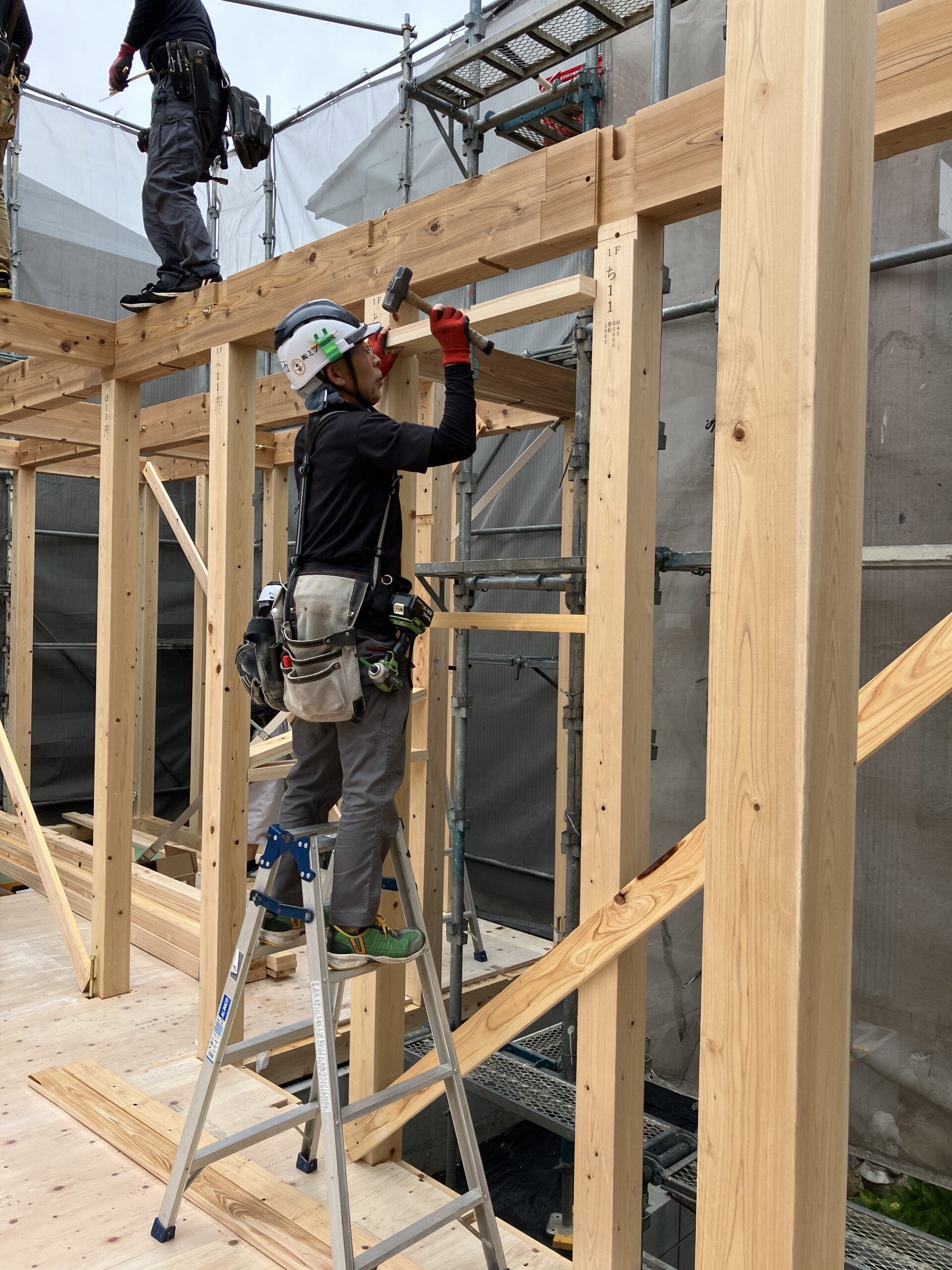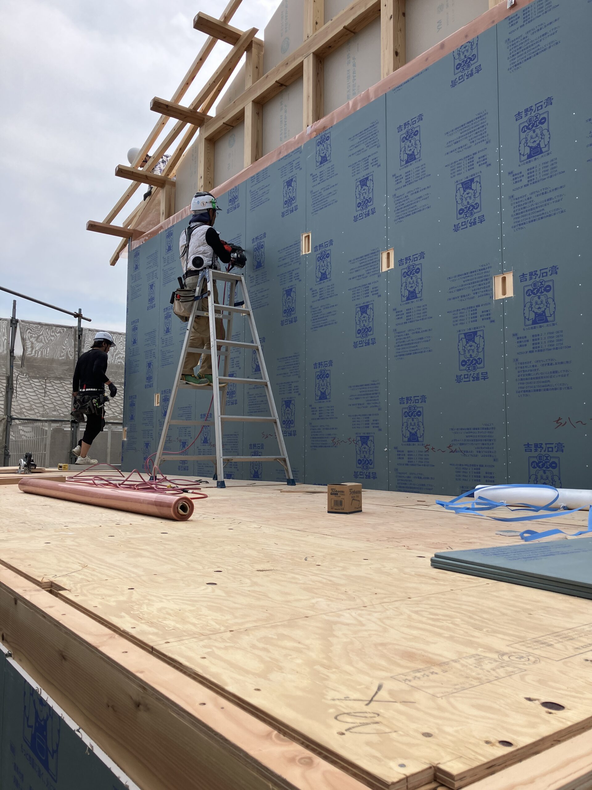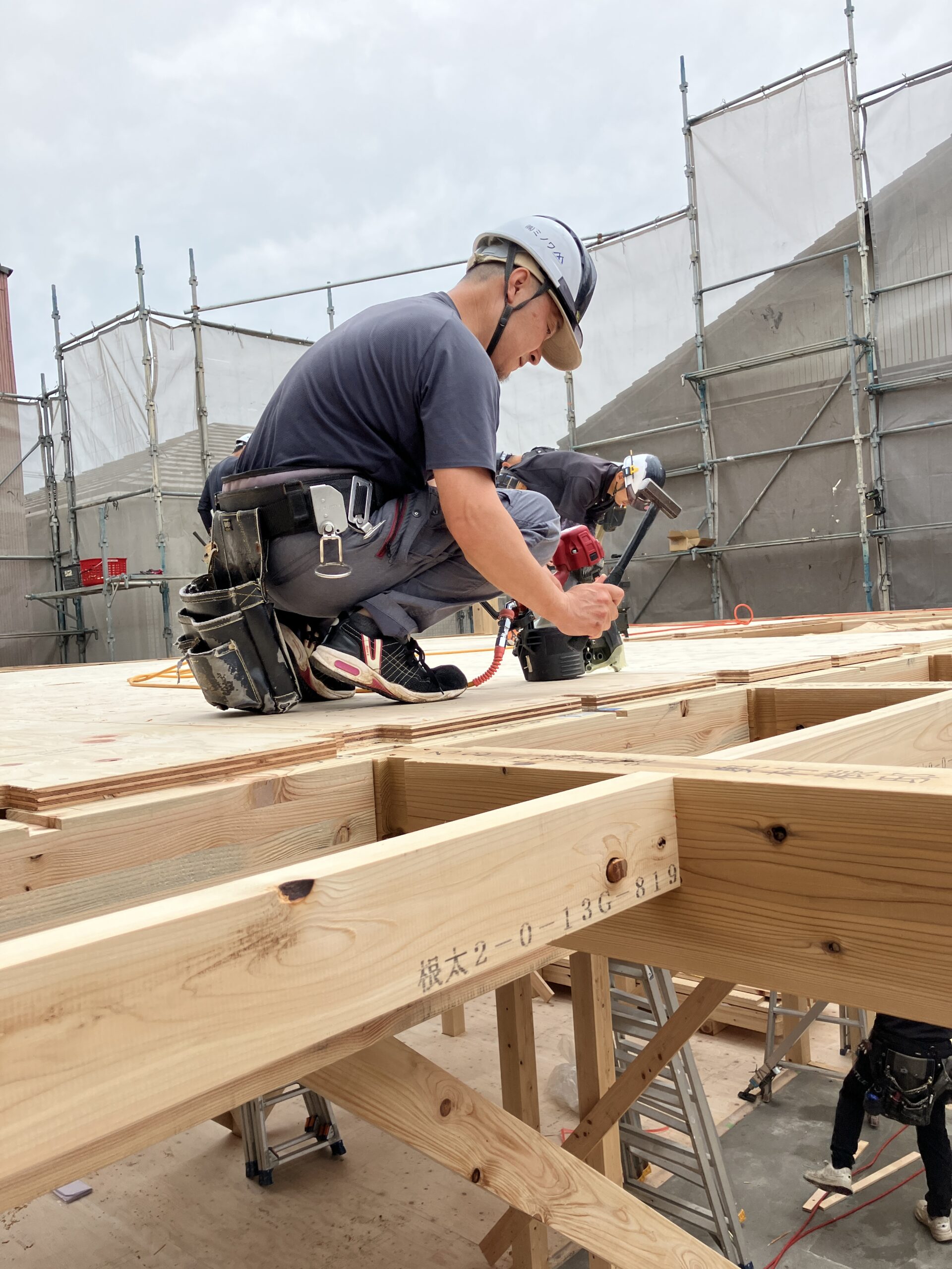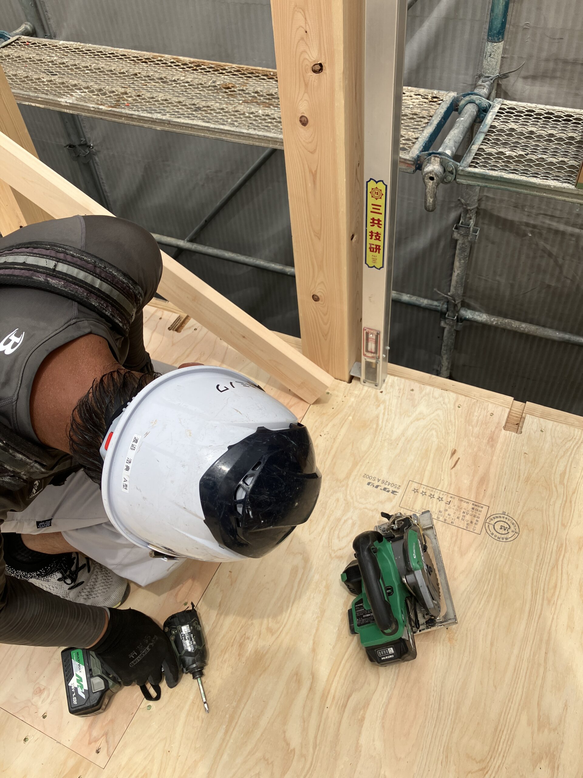育休明けのo本も、k池大棟梁と一緒に重たい(1枚およそ30kg)耐力面材を仮留めしました。4週連続の棟上げで4㎏くらいは痩せれそうでしょうか?