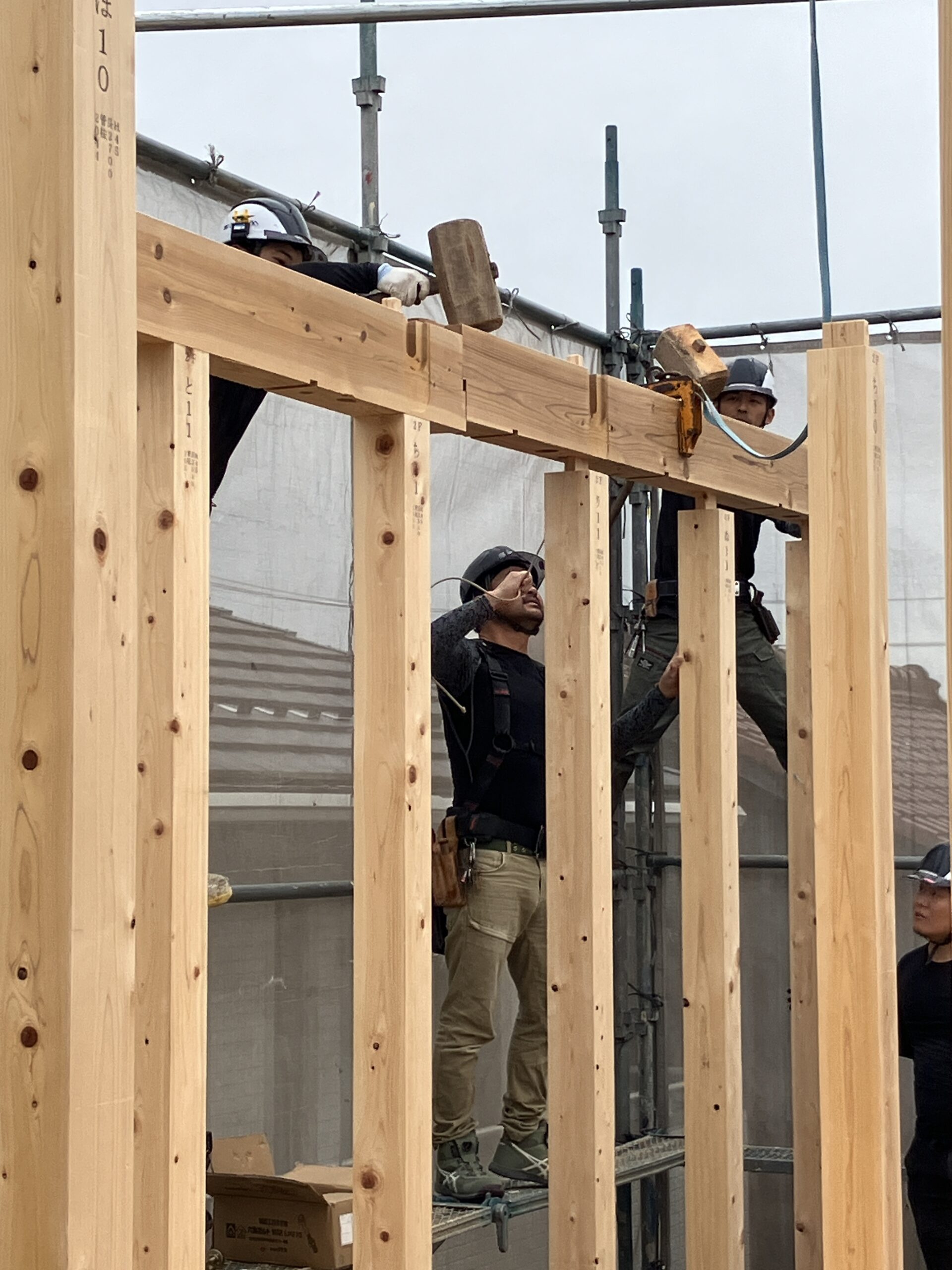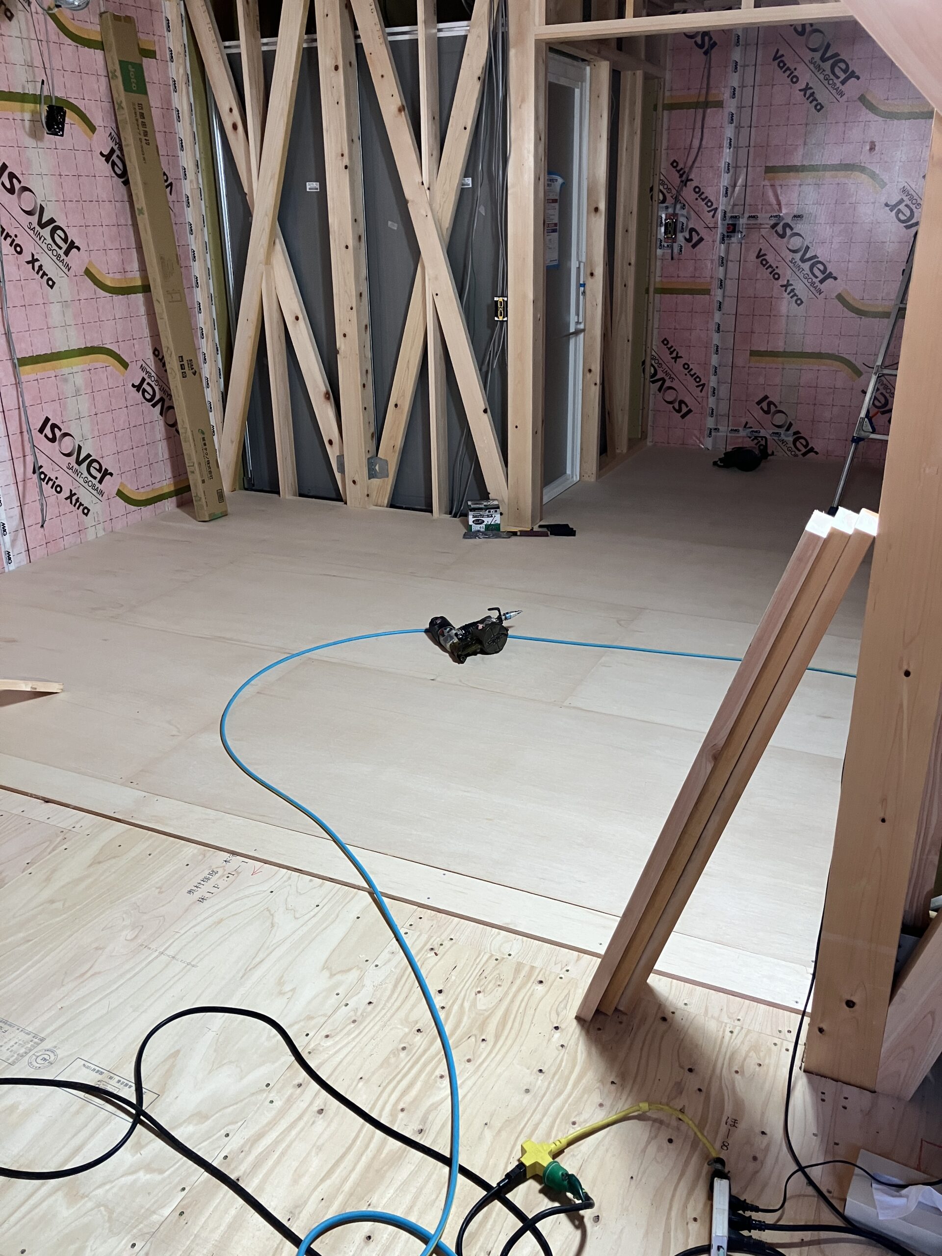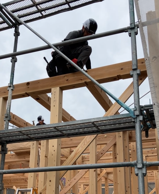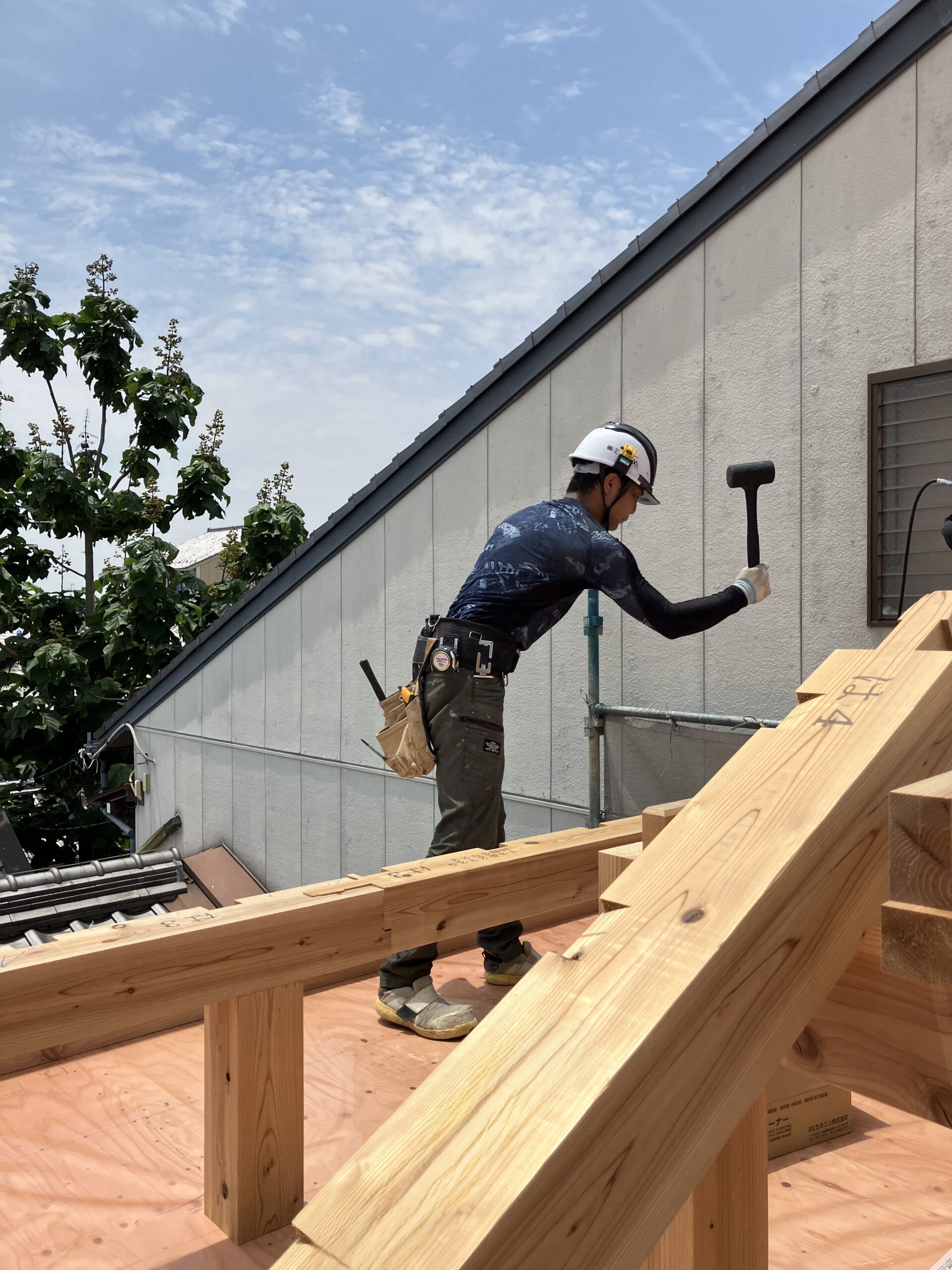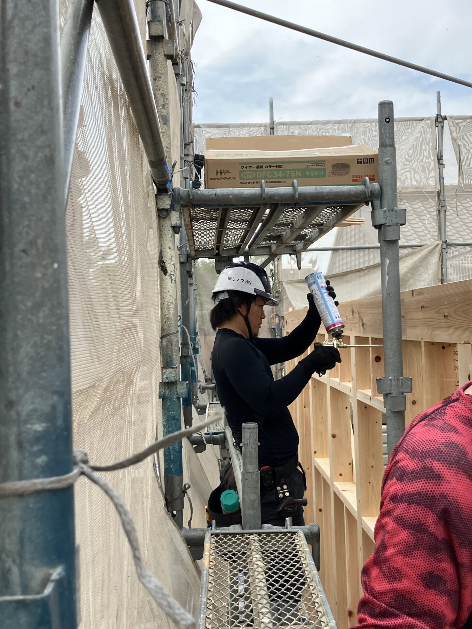育休明けのo本も、k池大棟梁と一緒に重たい(1枚およそ30kg)耐力面材を仮留めしました。4週連続の棟上げで4㎏くらいは痩せれそうでしょうか?