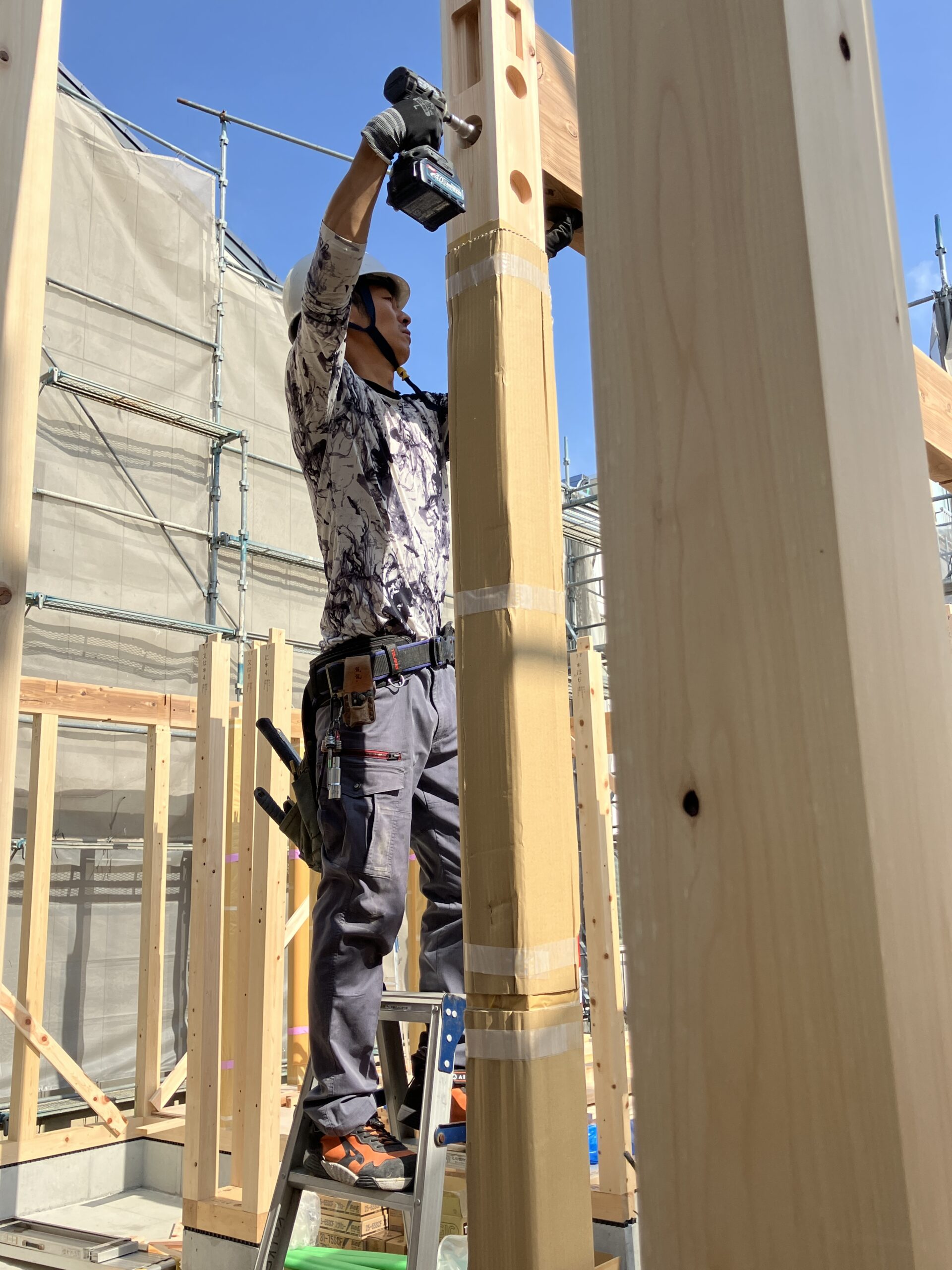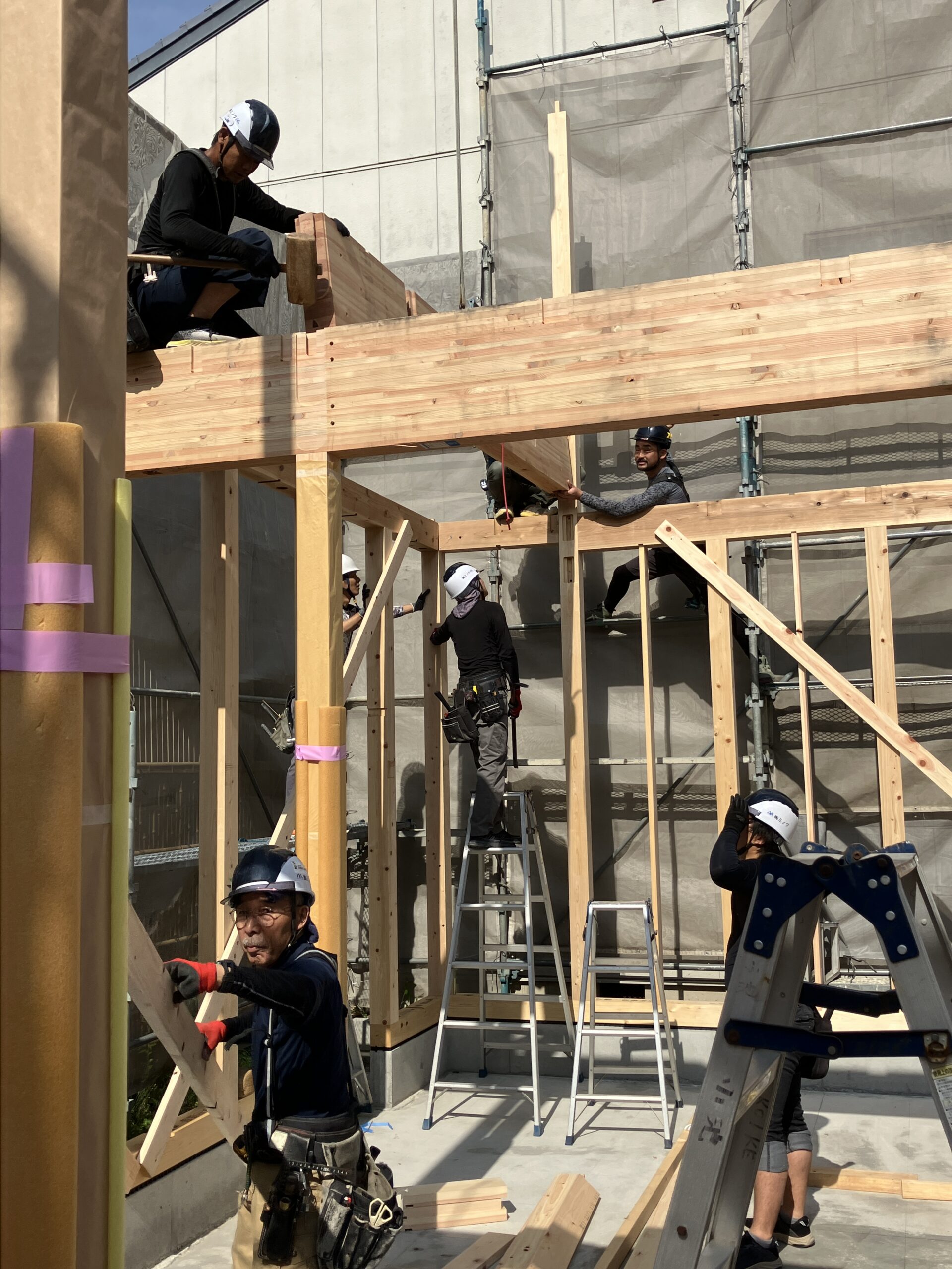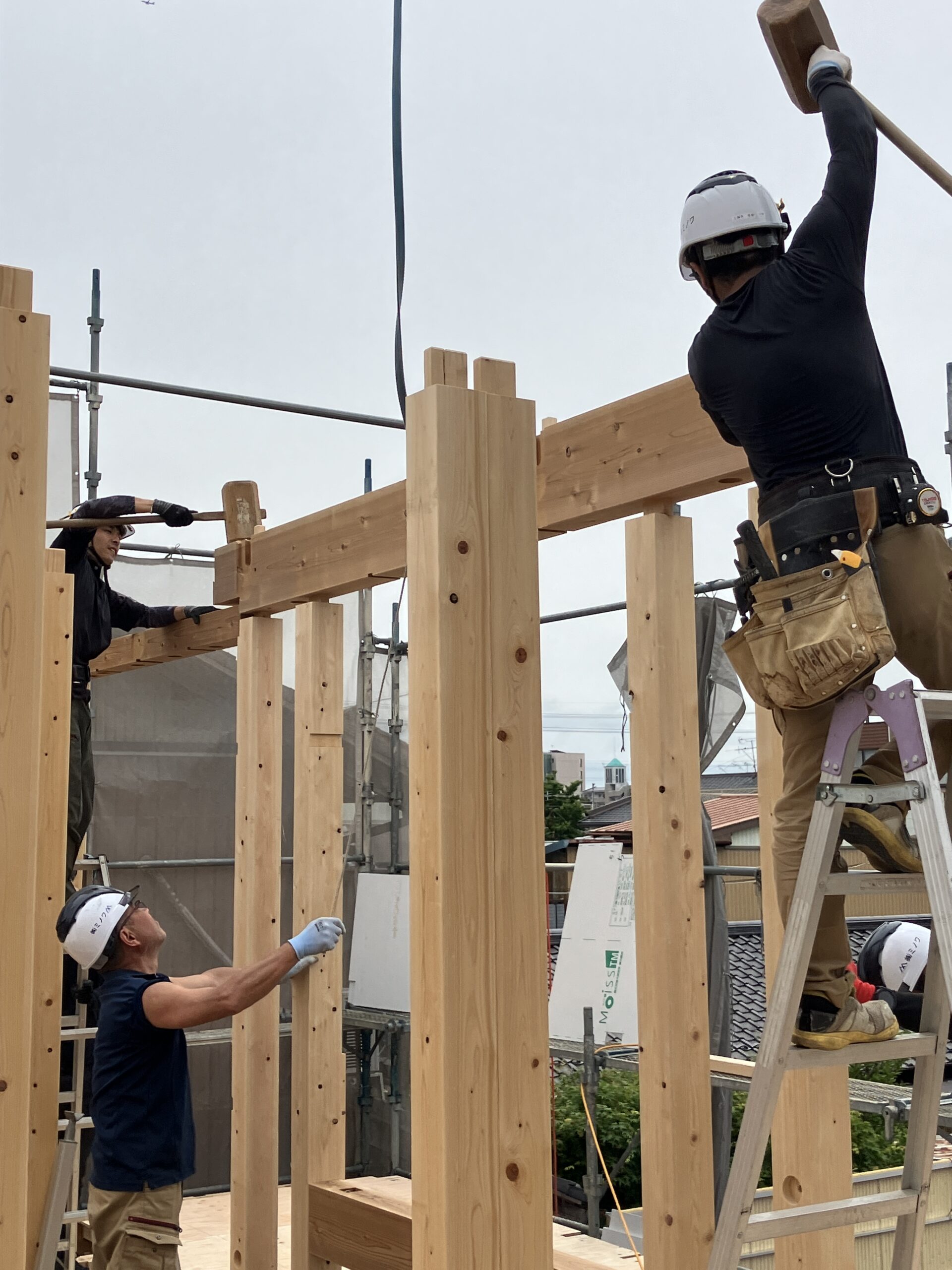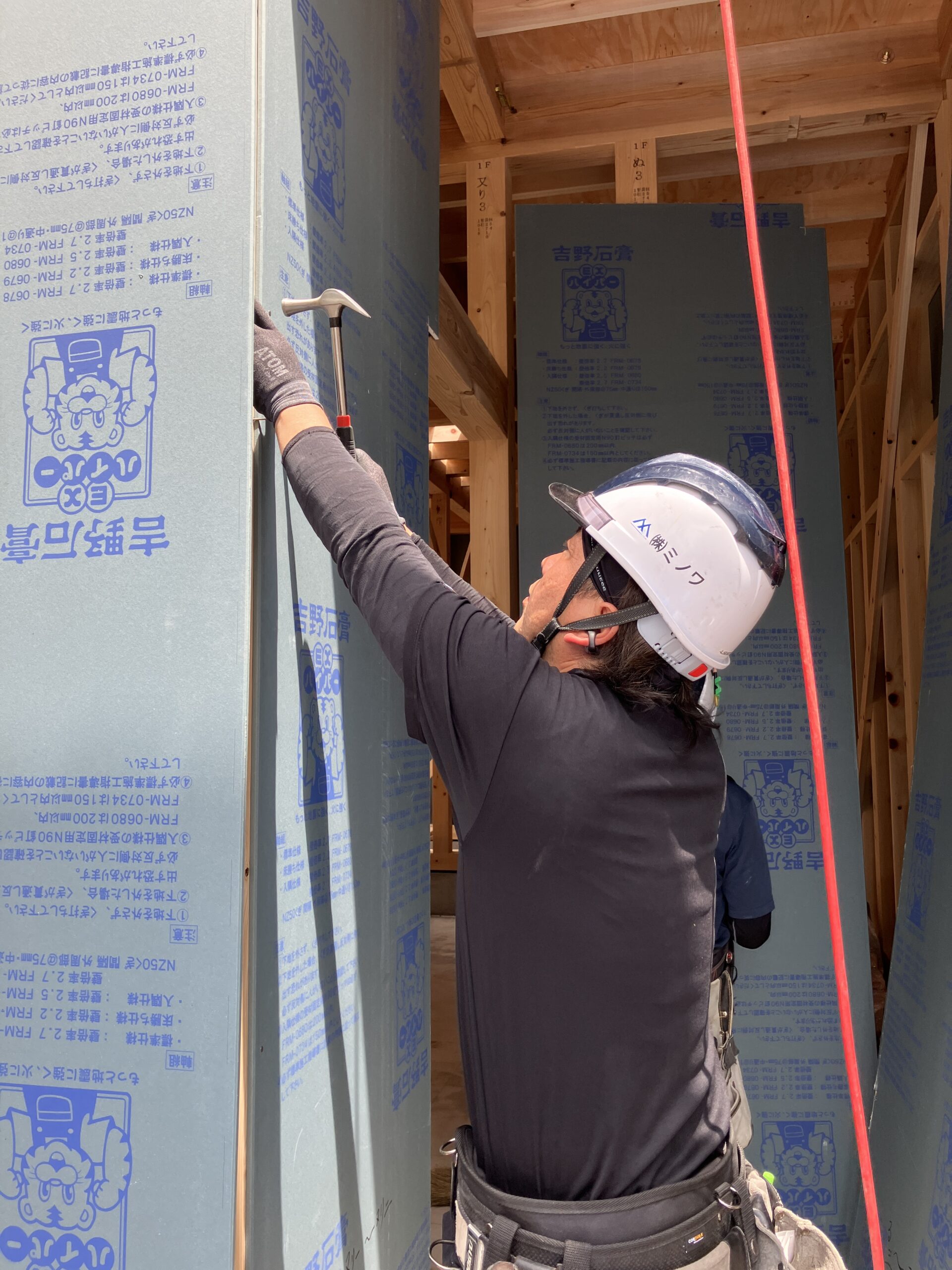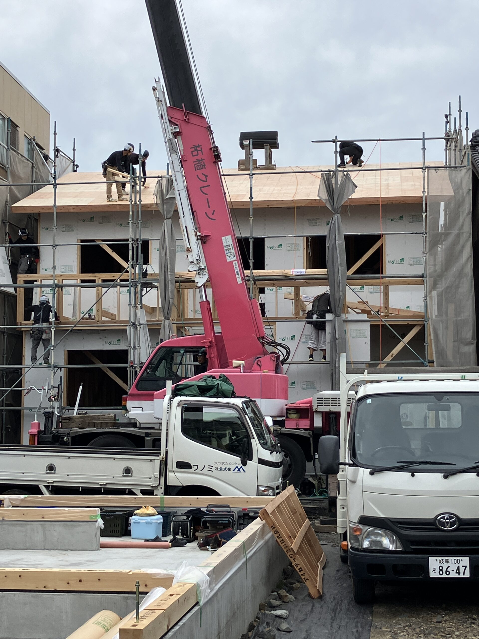 育休明けのo本も、k池大棟梁と一緒に重たい(1枚およそ30kg)耐力面材を仮留めしました。4週連続の棟上げで4㎏くらいは痩せれそうでしょうか?