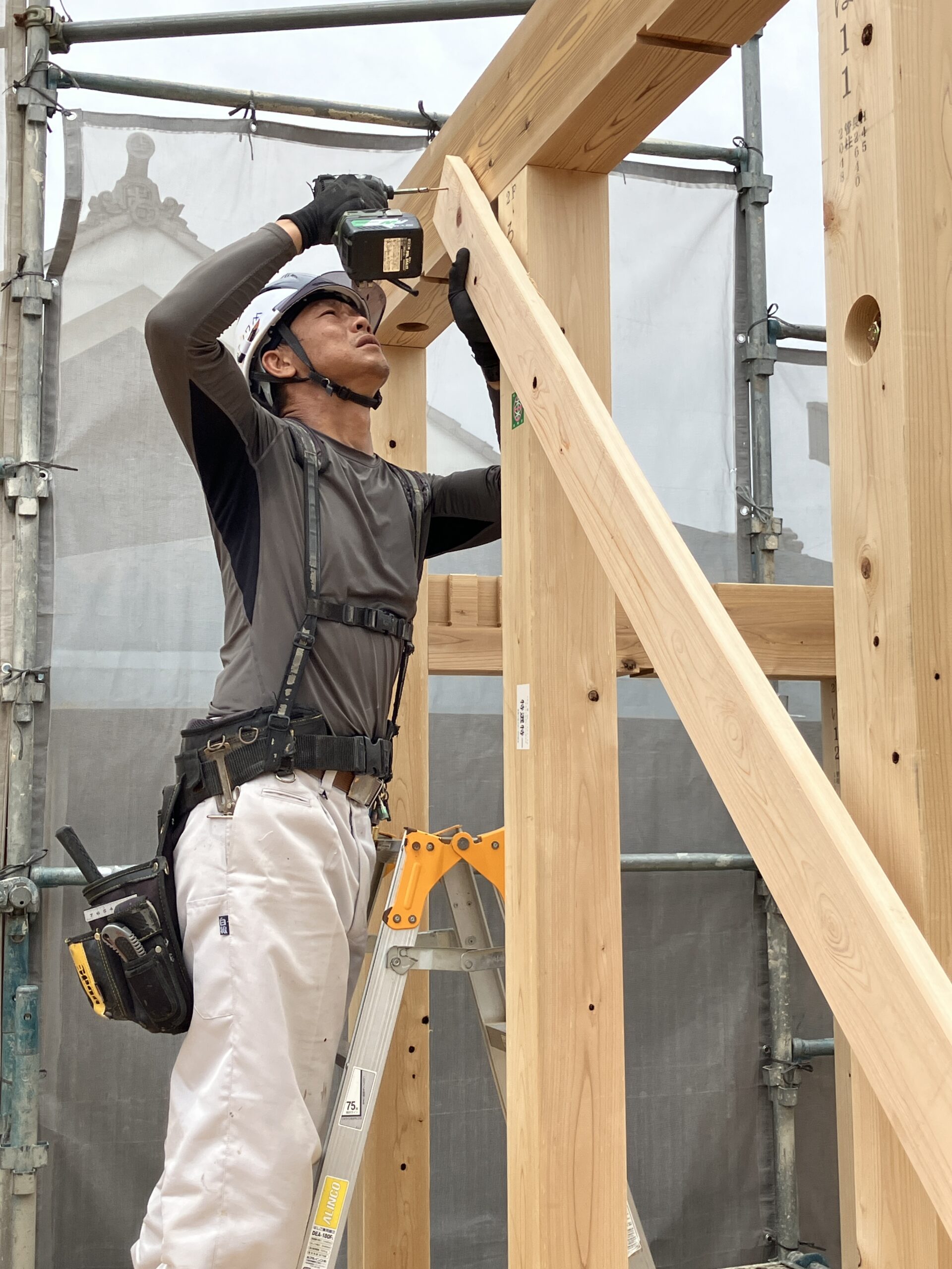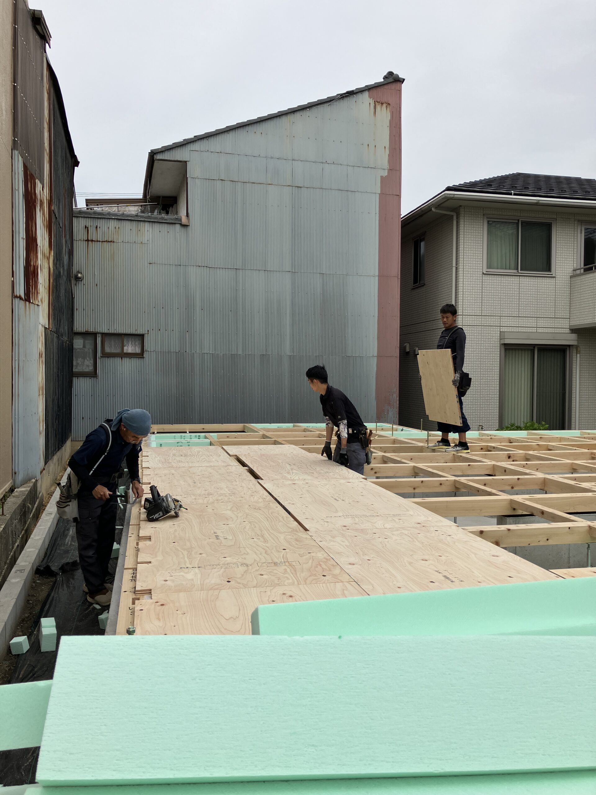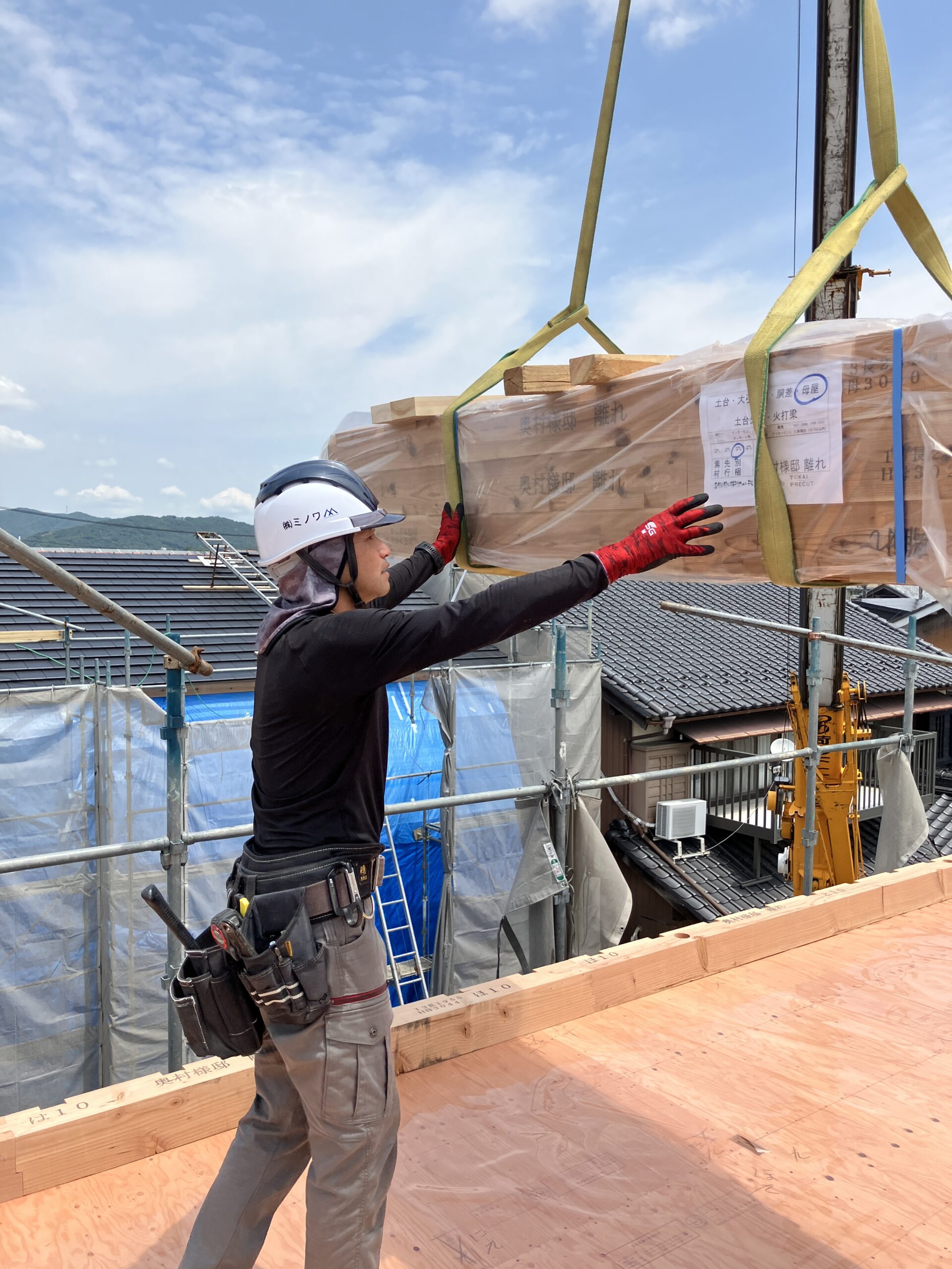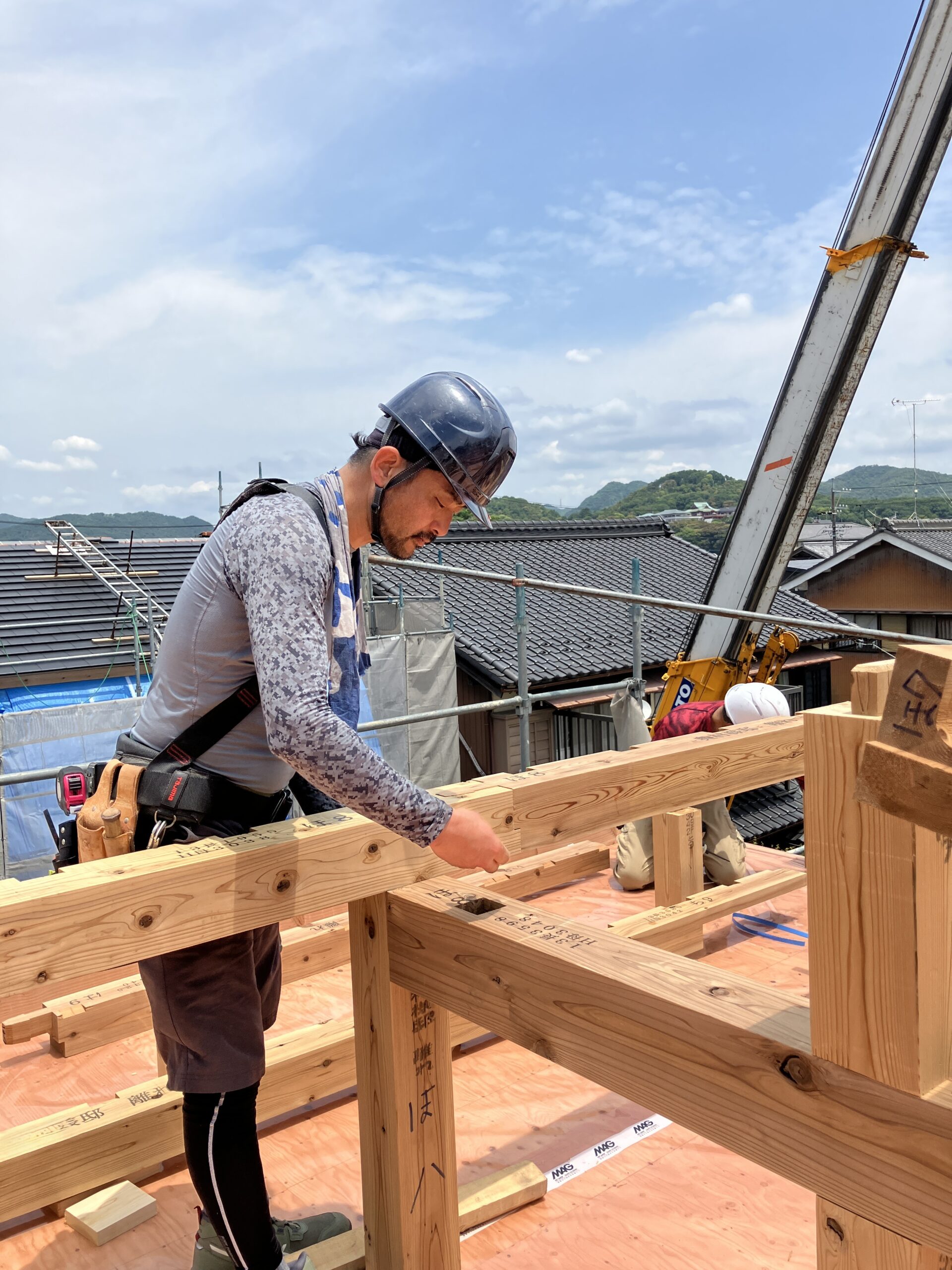 育休明けのo本も、k池大棟梁と一緒に重たい(1枚およそ30kg)耐力面材を仮留めしました。4週連続の棟上げで4㎏くらいは痩せれそうでしょうか?