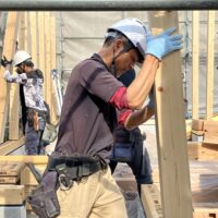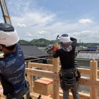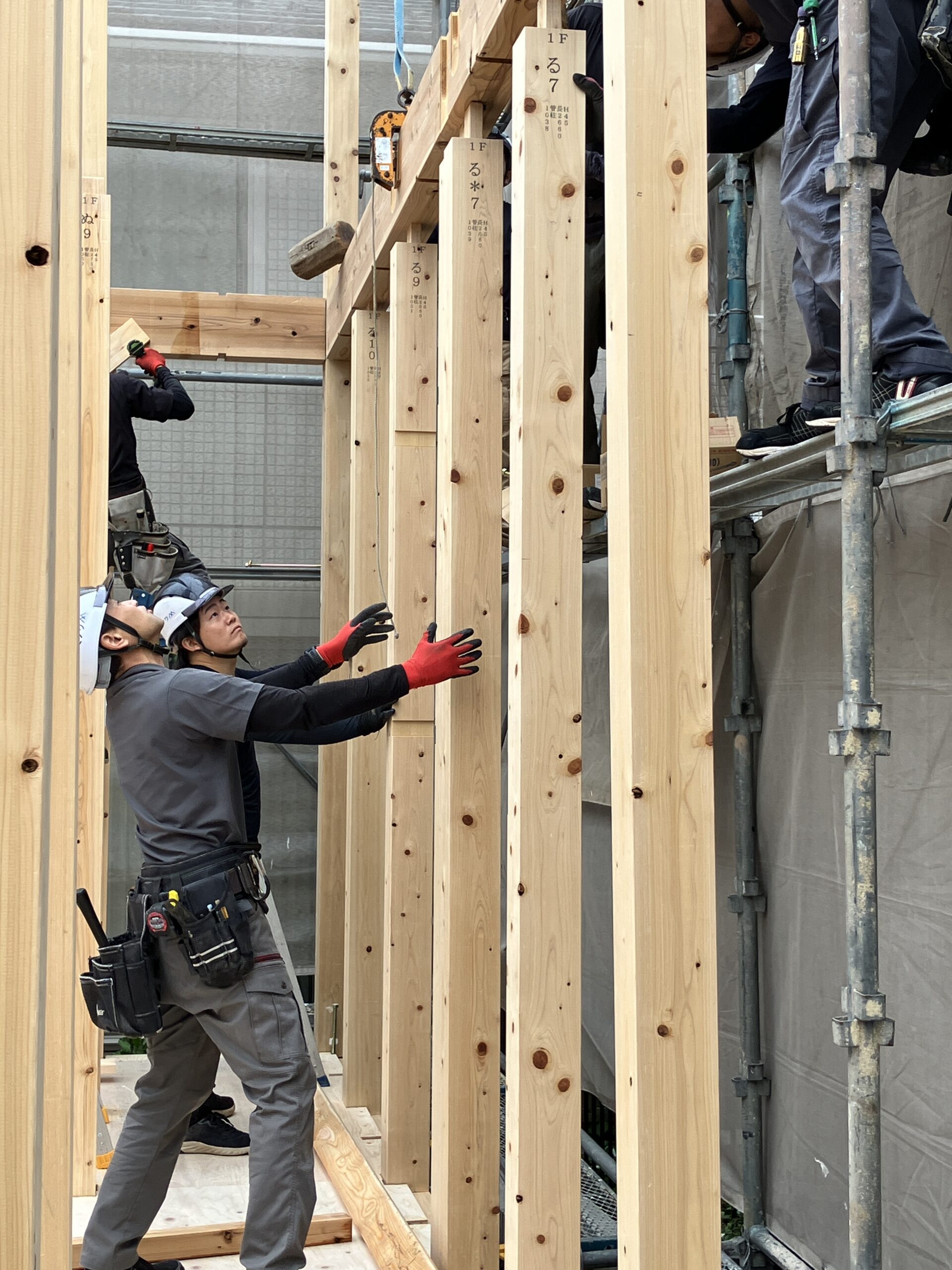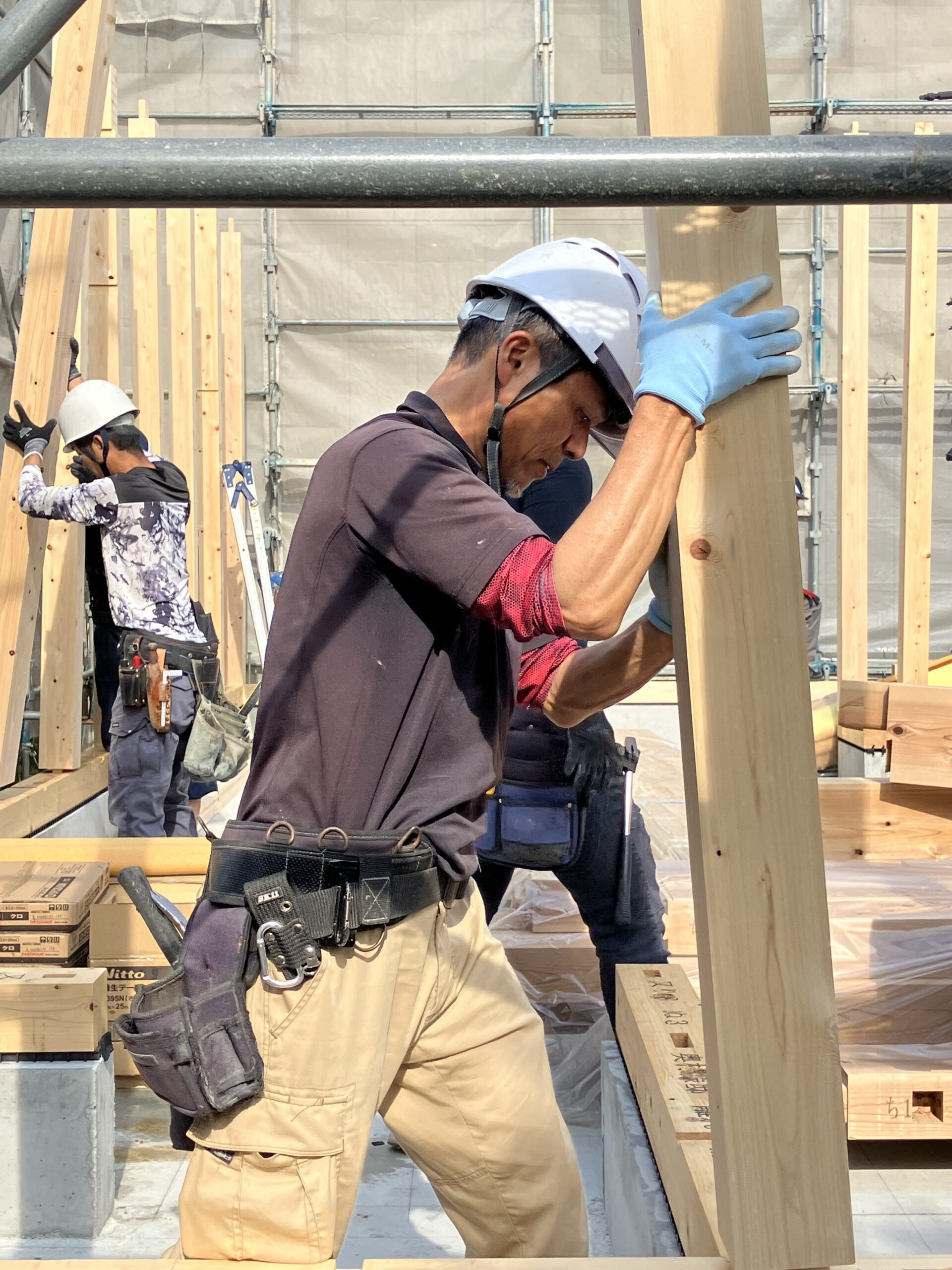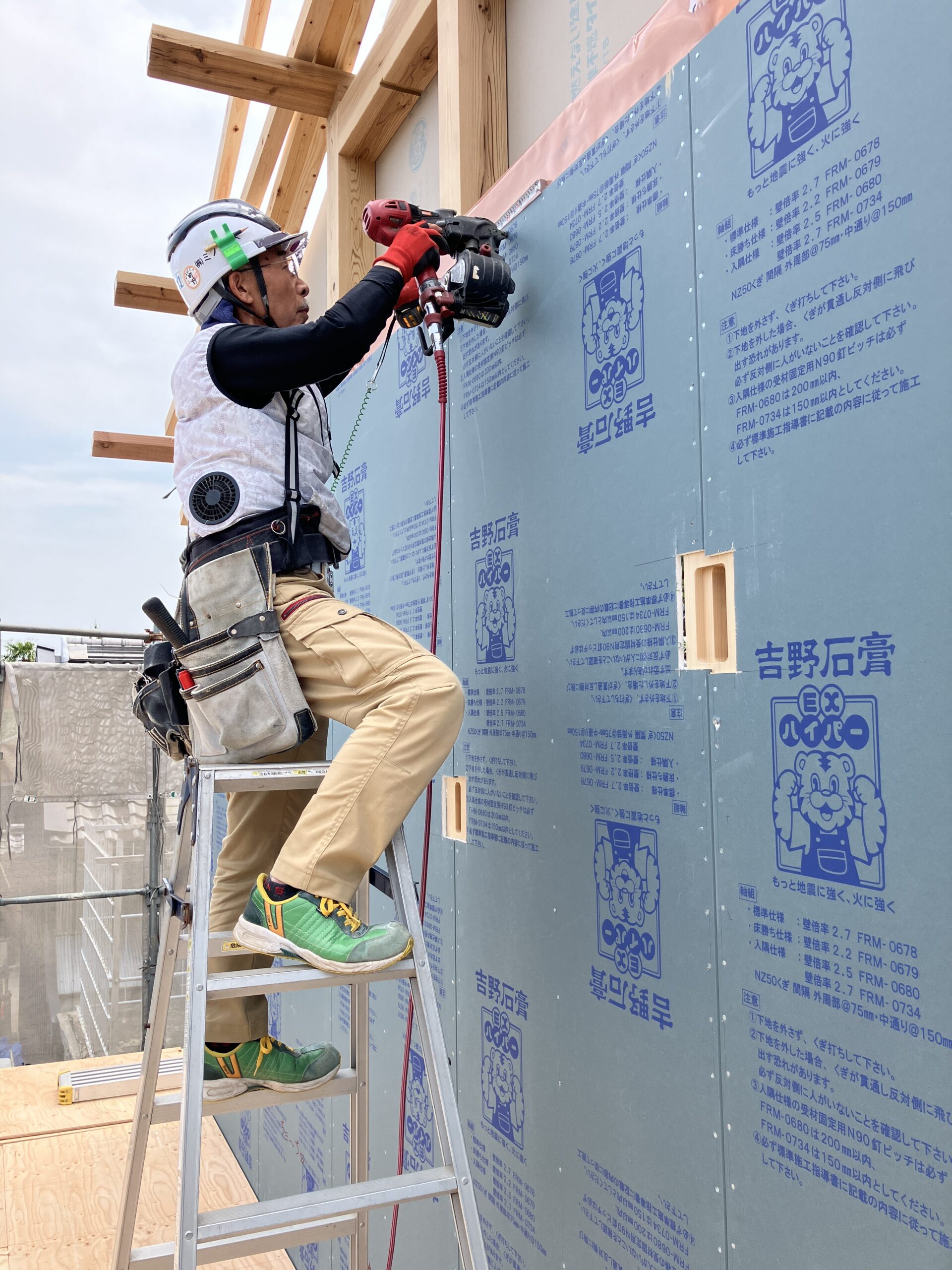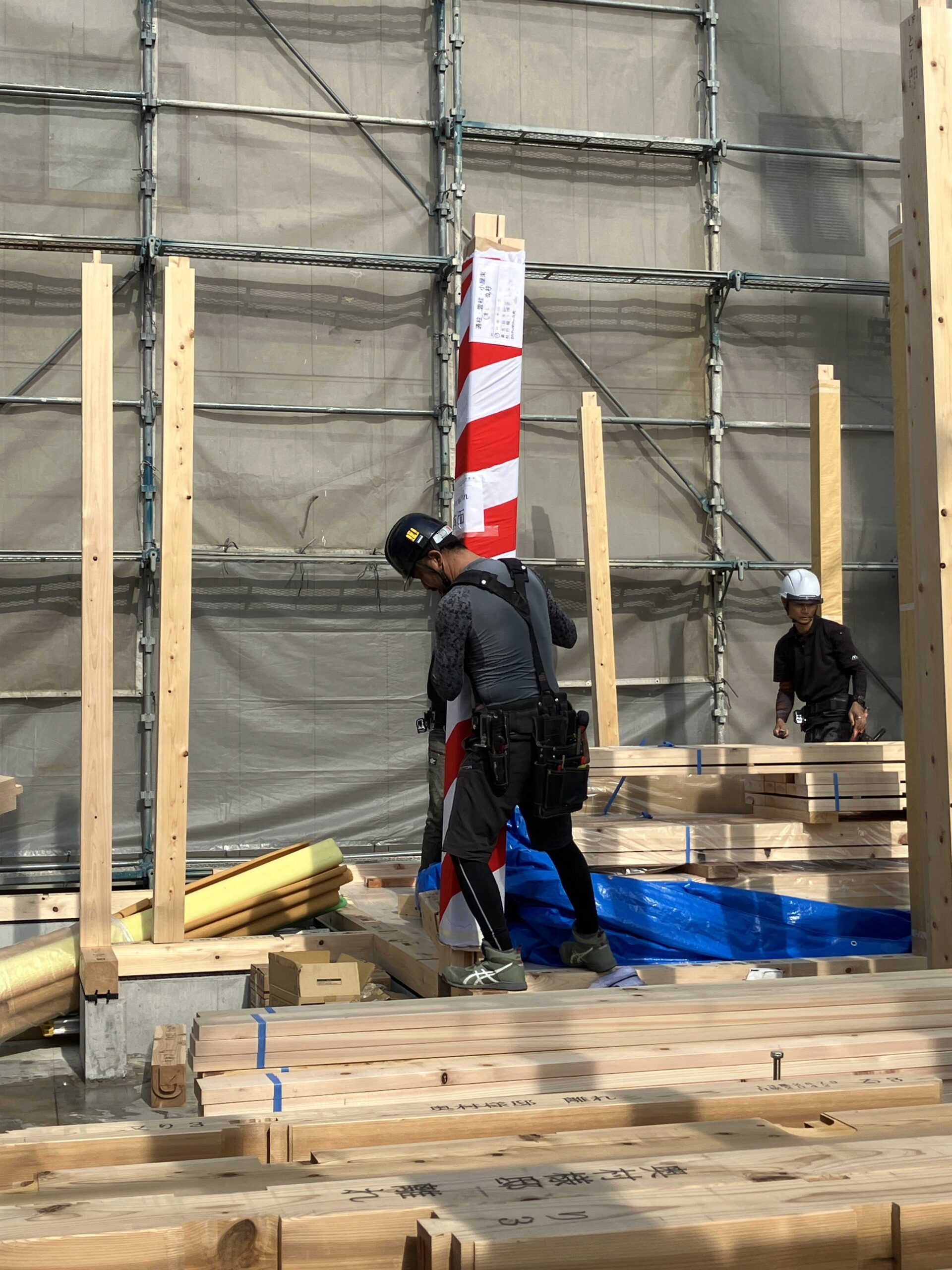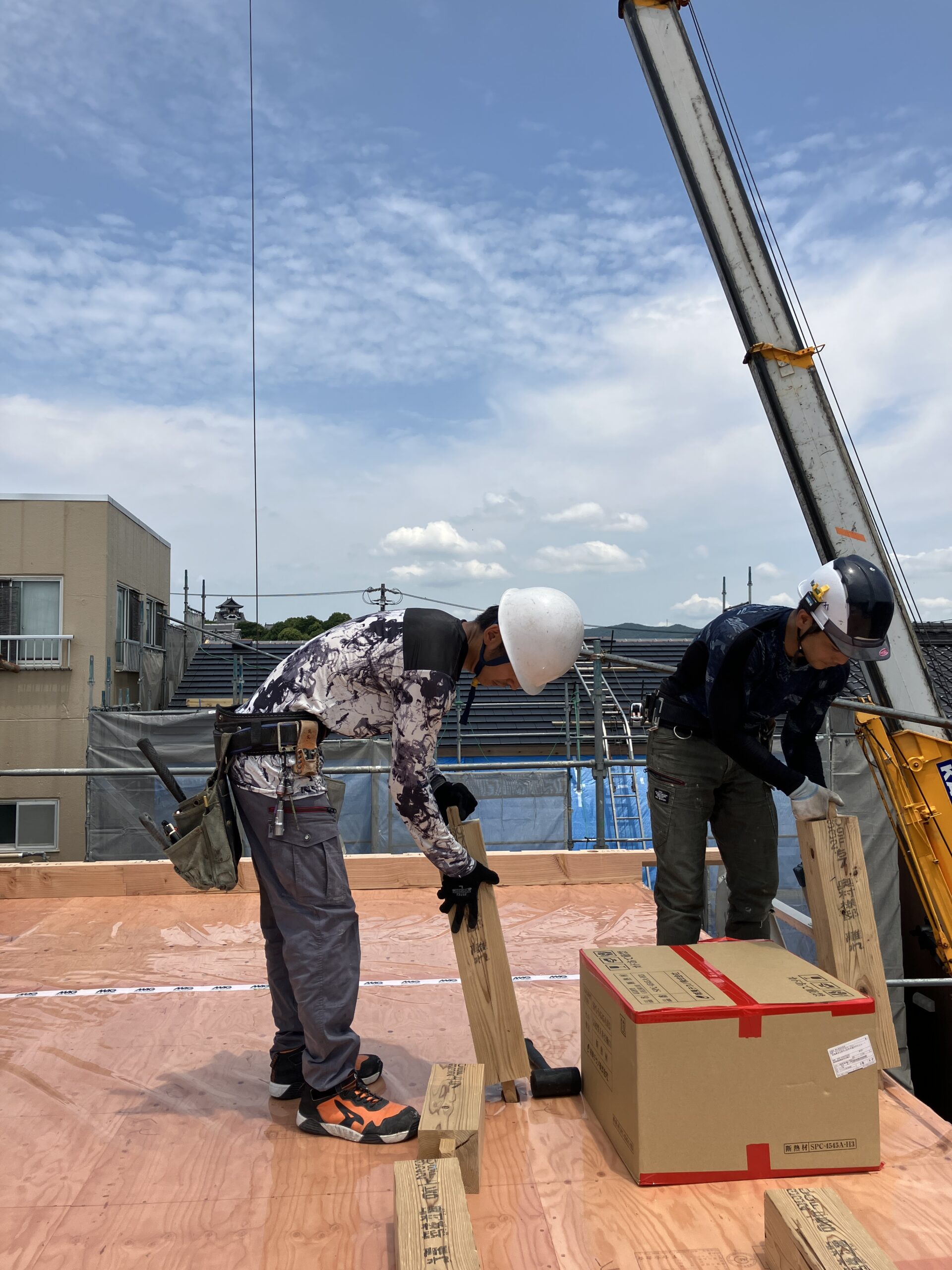 育休明けのo本も、k池大棟梁と一緒に重たい(1枚およそ30kg)耐力面材を仮留めしました。4週連続の棟上げで4㎏くらいは痩せれそうでしょうか?