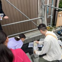 外では、炎天下の中、y江板金さんが屋根との取り合い水切などを施工しています。