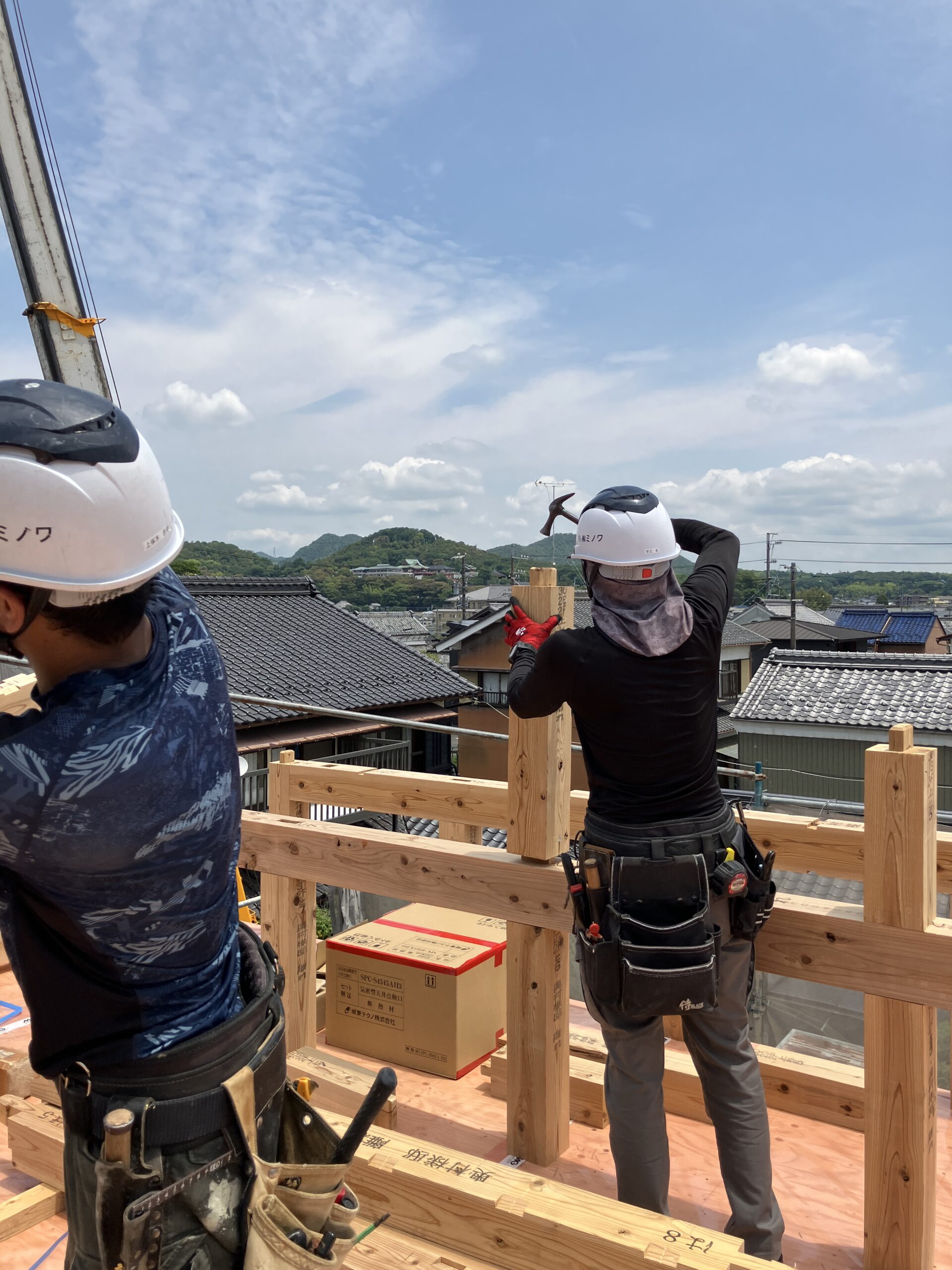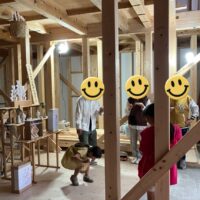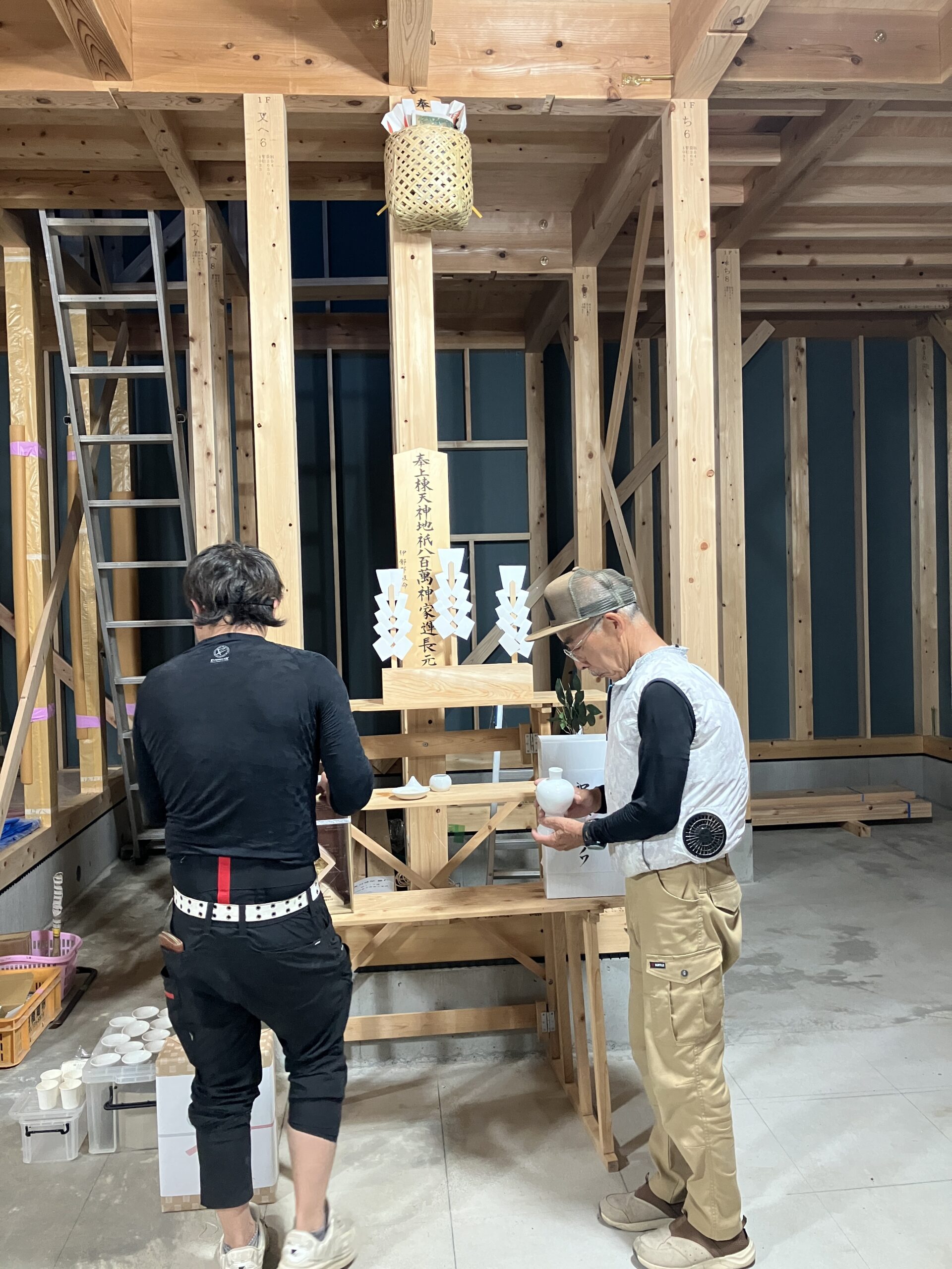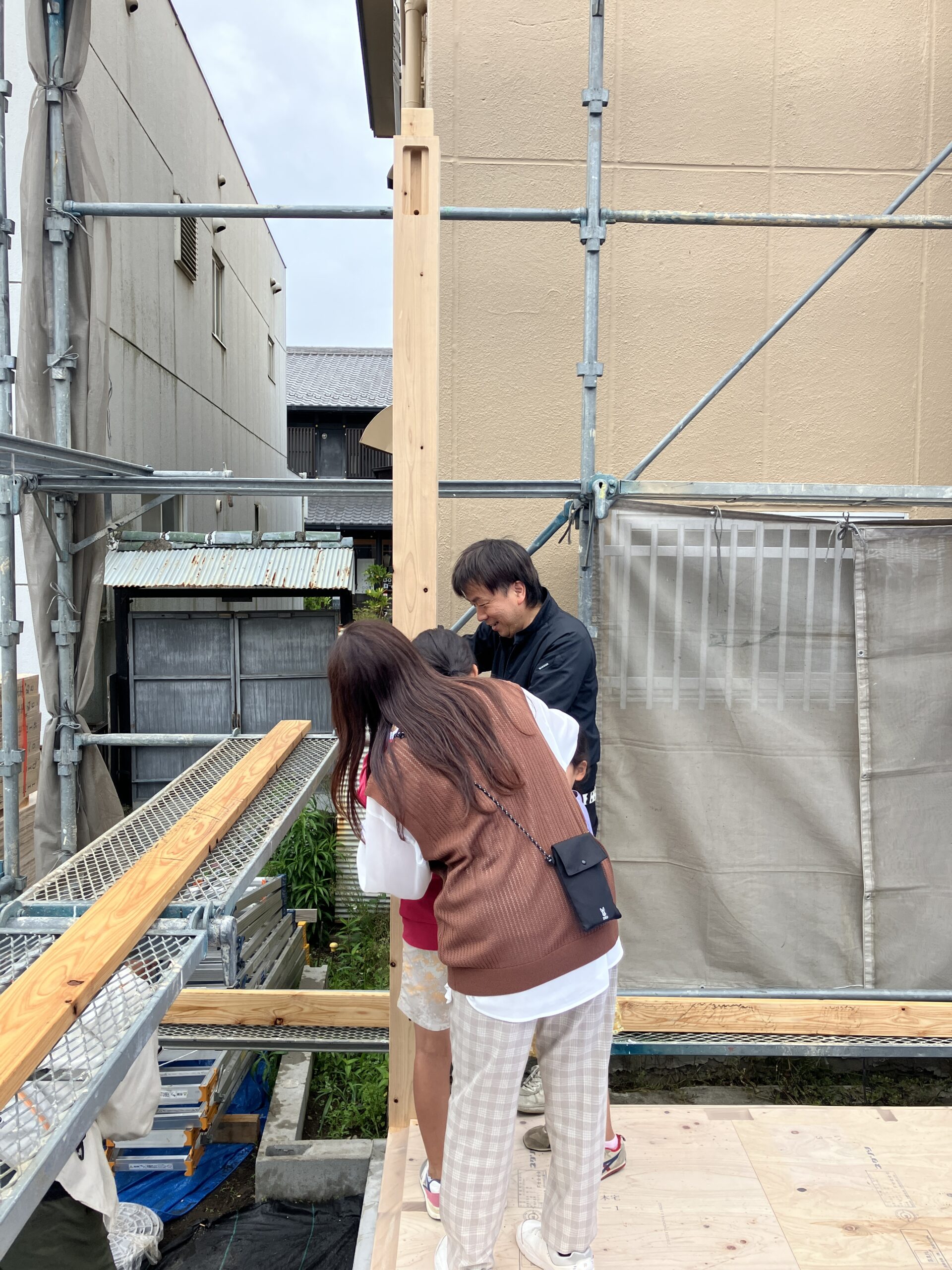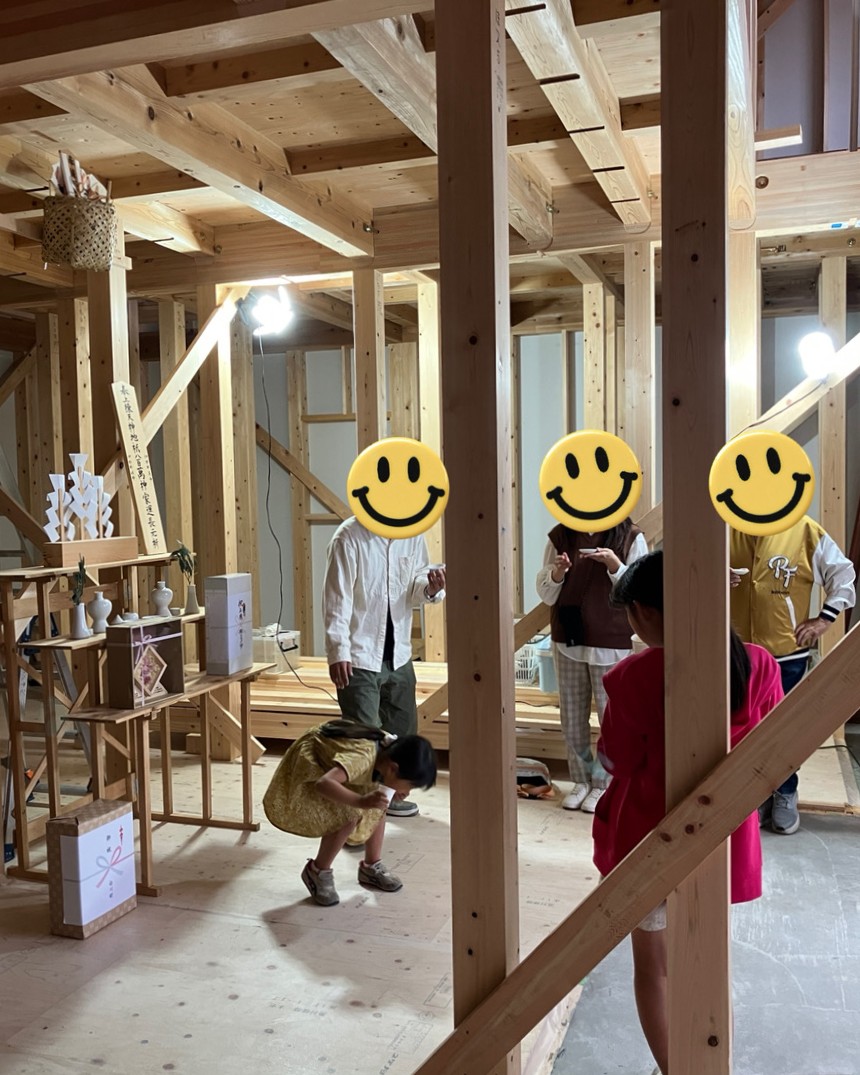 昨日、無事に母屋の建て方が行われました。お天気は、皆が願っていた雨が降らない曇り👍非常に作業のしやすい絶好の棟上げ日和でした。建物の四隅にお神酒と清めの塩をまき、hinataちゃん、hiyoriちゃんも登校前に柱を一本立てました。にっこり記念撮影📸二人とも可愛く撮れたかな?開始前に皆でお神酒をいただき作業開始です。