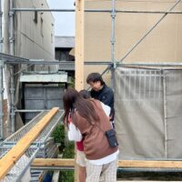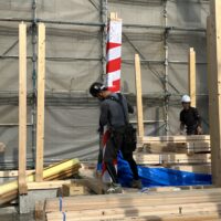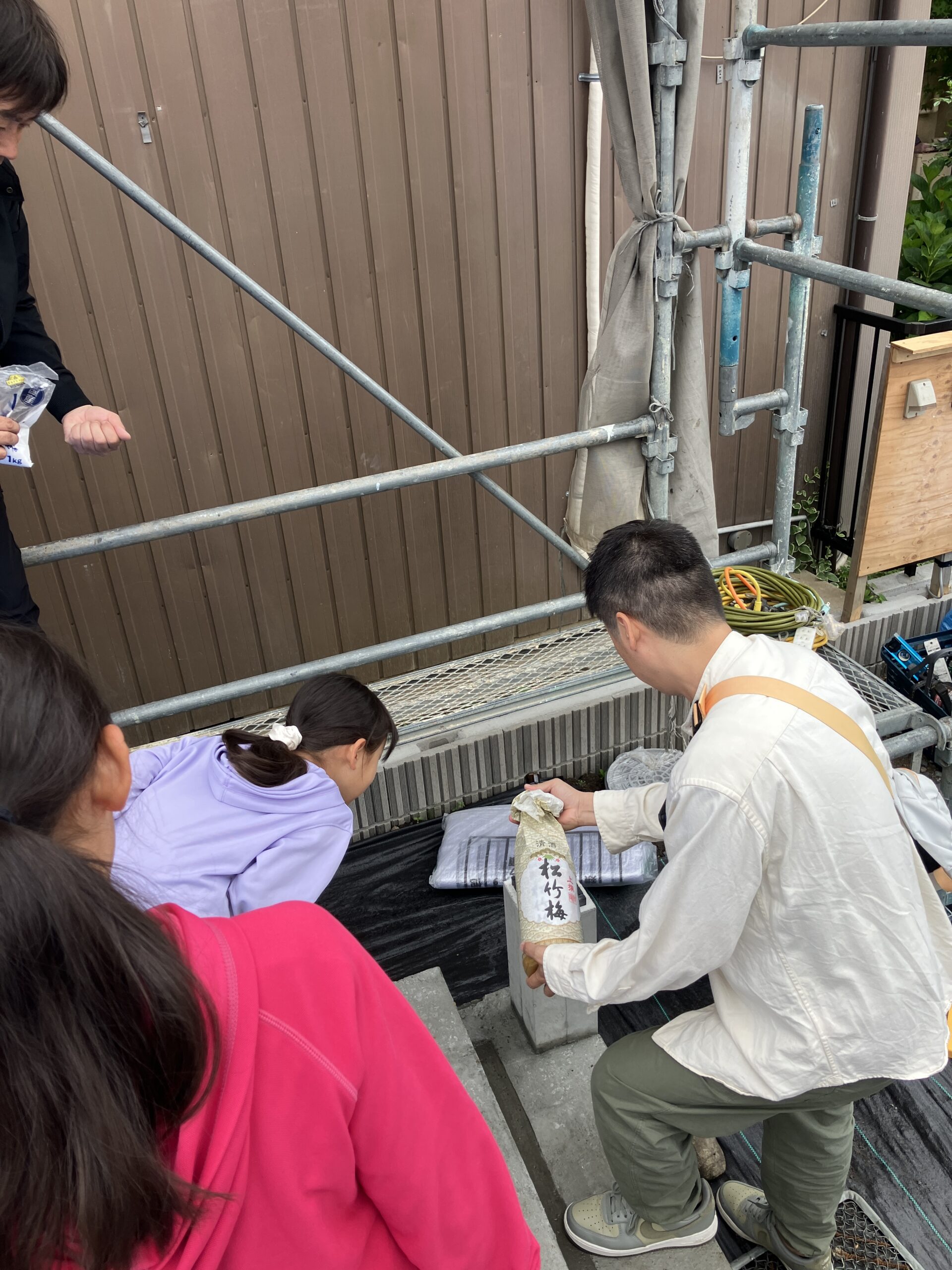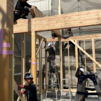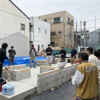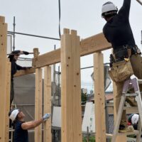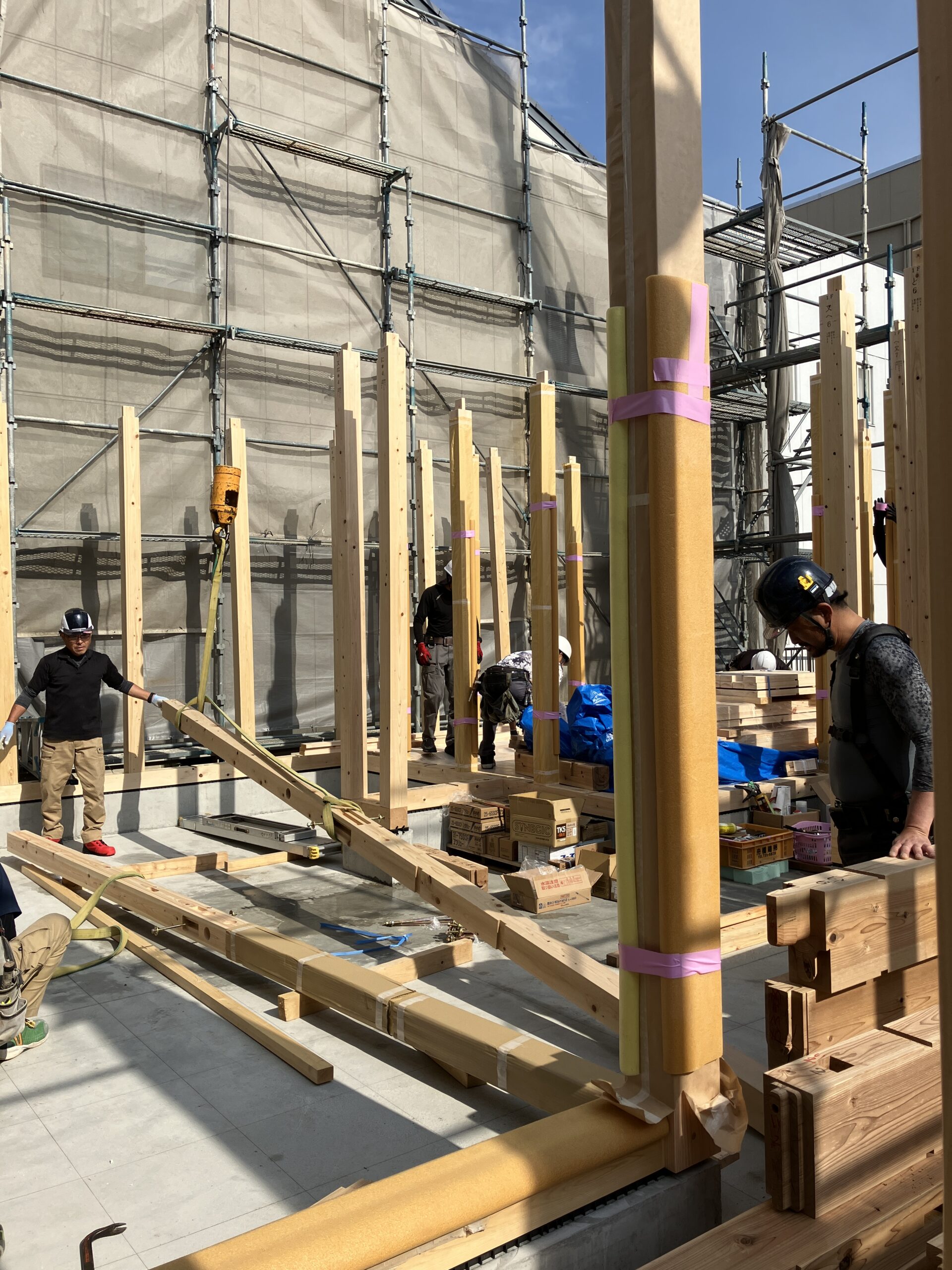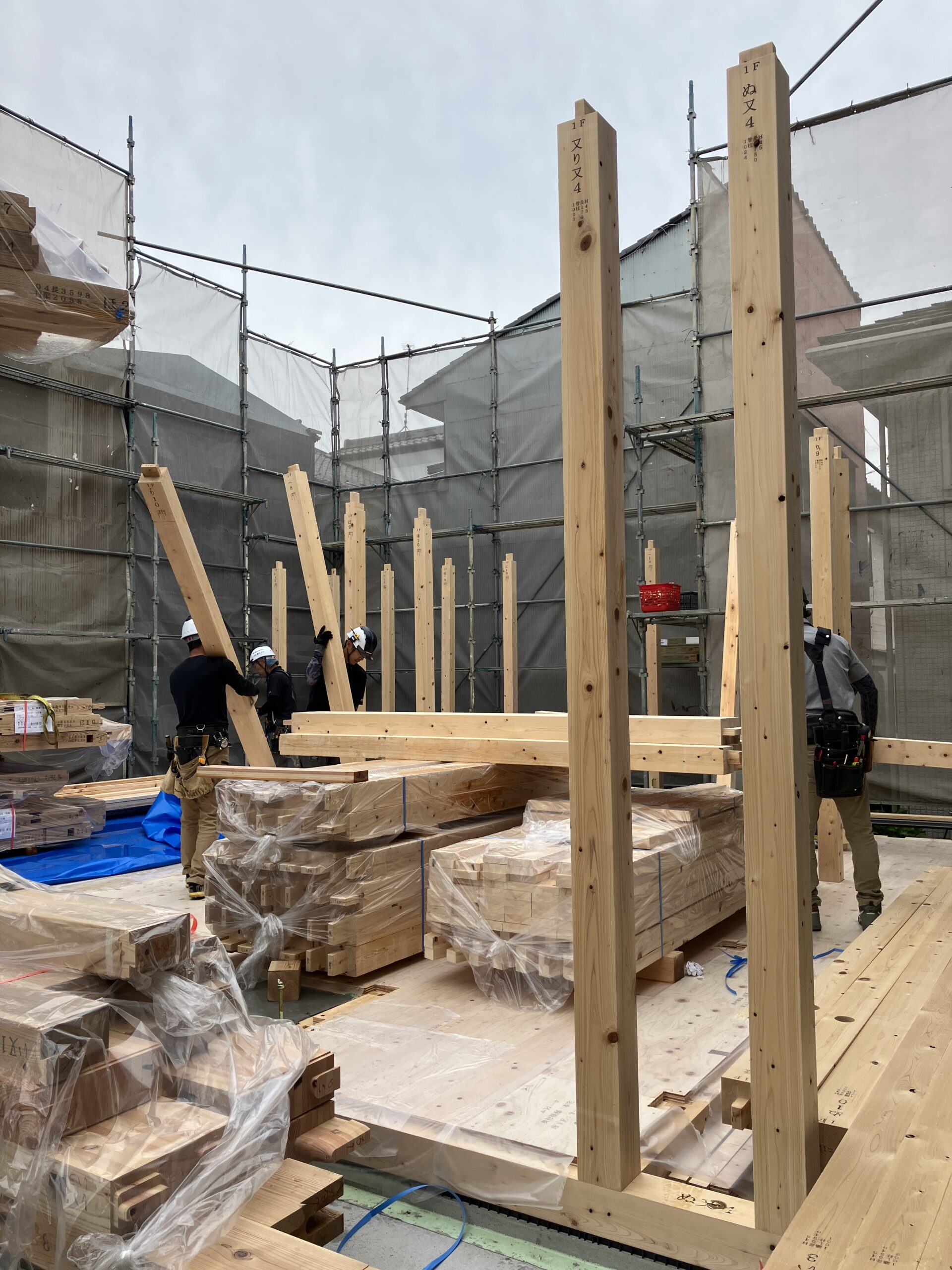 昨日、無事に母屋の建て方が行われました。お天気は、皆が願っていた雨が降らない曇り👍非常に作業のしやすい絶好の棟上げ日和でした。建物の四隅にお神酒と清めの塩をまき、hinataちゃん、hiyoriちゃんも登校前に柱を一本立てました。にっこり記念撮影📸二人とも可愛く撮れたかな?開始前に皆でお神酒をいただき作業開始です。