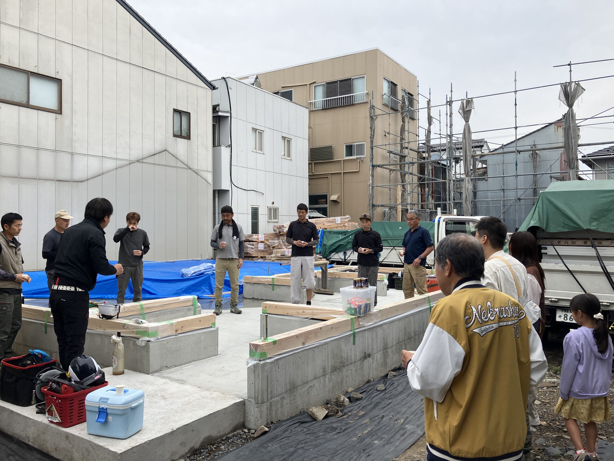 お父様に清めのお酒を建物の四方にまいていただき、みんな揃ってお神酒をいただき、建て方スタートです。