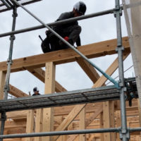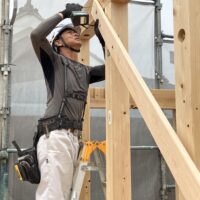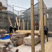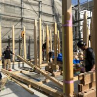 h典棟梁は、さげふりと言う道具で建物の矩を確認しながら、柱や梁を仮固定している様子です。