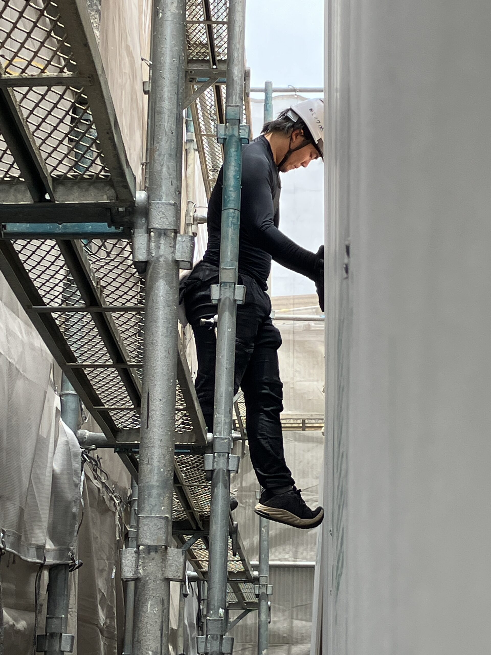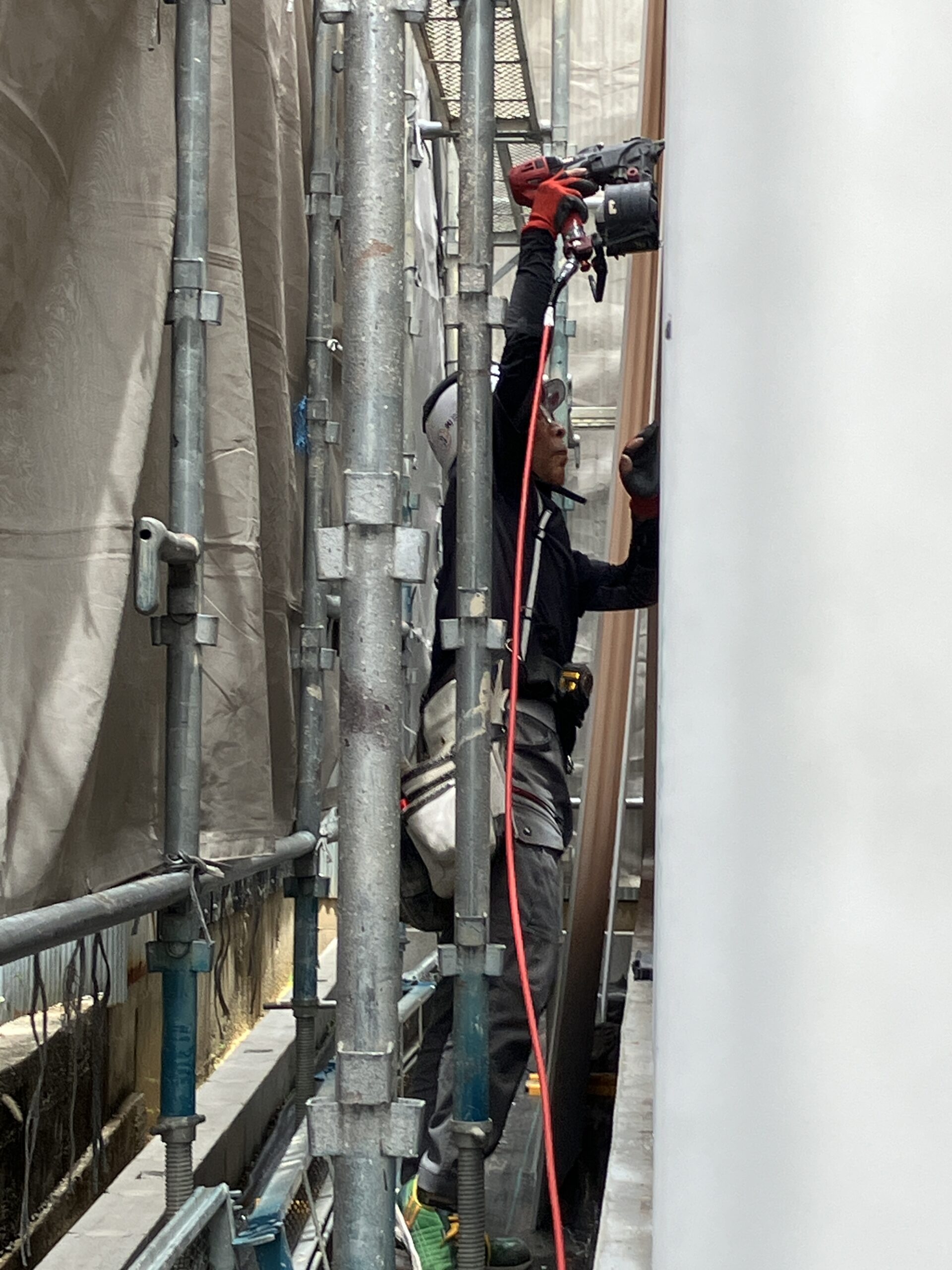 sサッシのs君が、外壁工事が終わったので、シャッターを取り付けに来てくれました👍足場バラシの日が近づいて来ています。