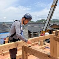 メンバー交代で、i井大工さんに替わって、h喜さんとf志君が加わりましたが、母屋に続き阿吽の呼吸で粛々と建て方が進められていきます。不思議~私の中では「目配り、気配り、心配り」が出来る大工さん達だから、良い建物が出来るんだなぁと言う答えに辿り着きました。