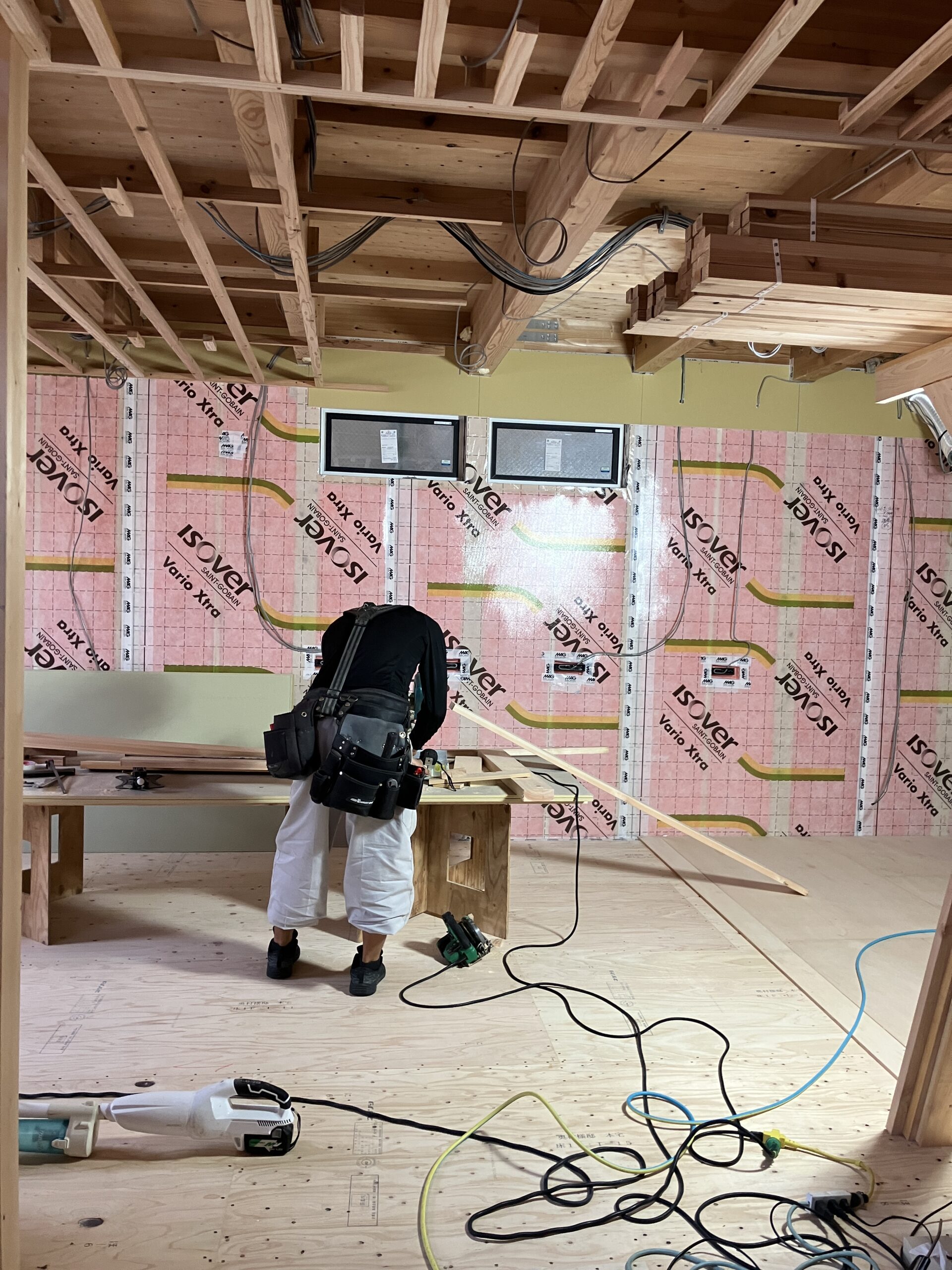 離れは、1階の床下地(フリーフロア)を張り終えました。k池大棟梁、お疲れ様です。現在は、天井の下地組を行っています。