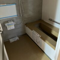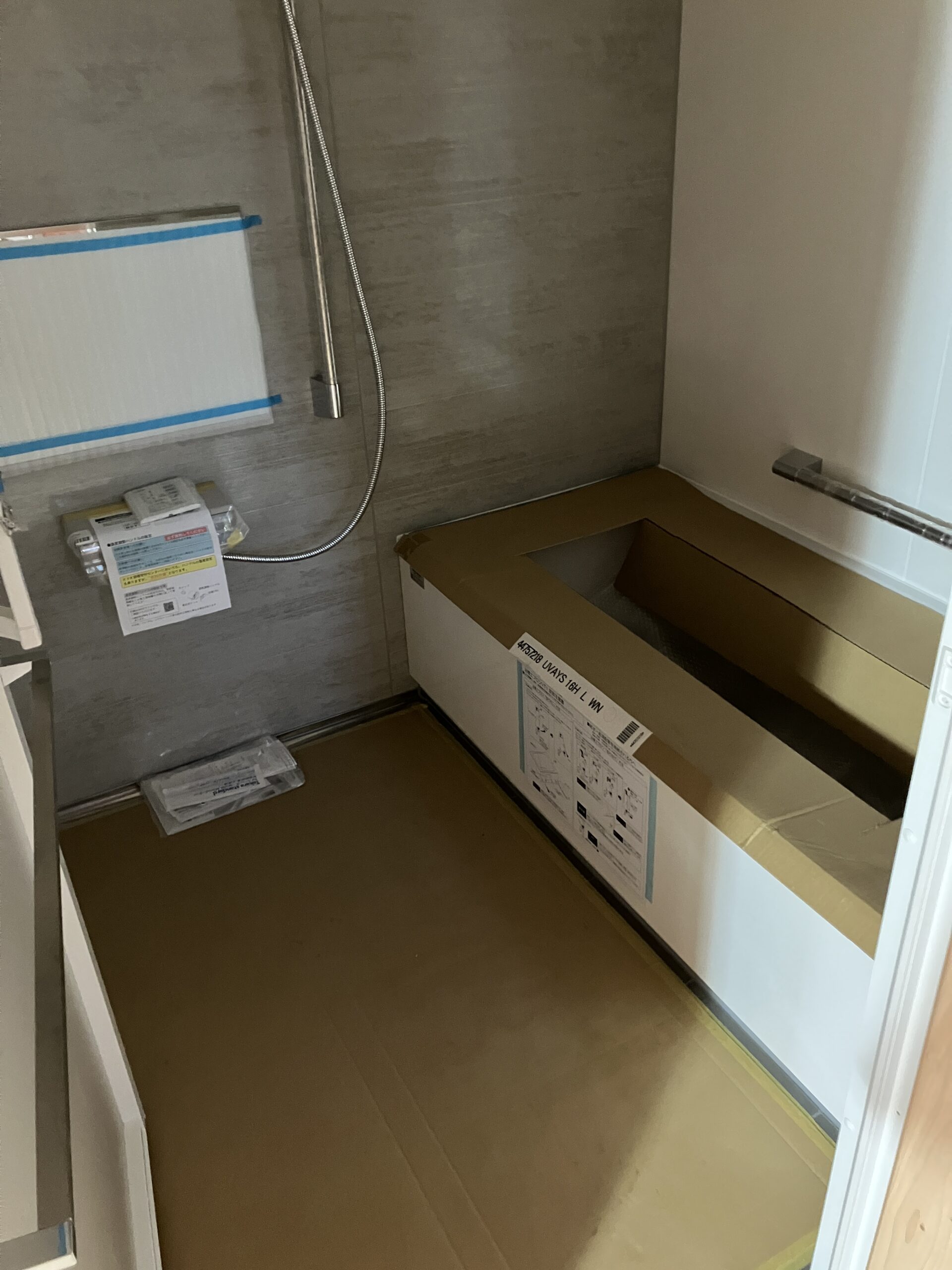 ユニットバスの写真を忘れていました。7月2日に施工されております💦ユニットバスは、大工さんの造作工事が進んでいく割と早い段階で、設置されます。設備品として一番最初に取り付けられますので、上棟の際には色なども最終決定されていることが多い商品です。