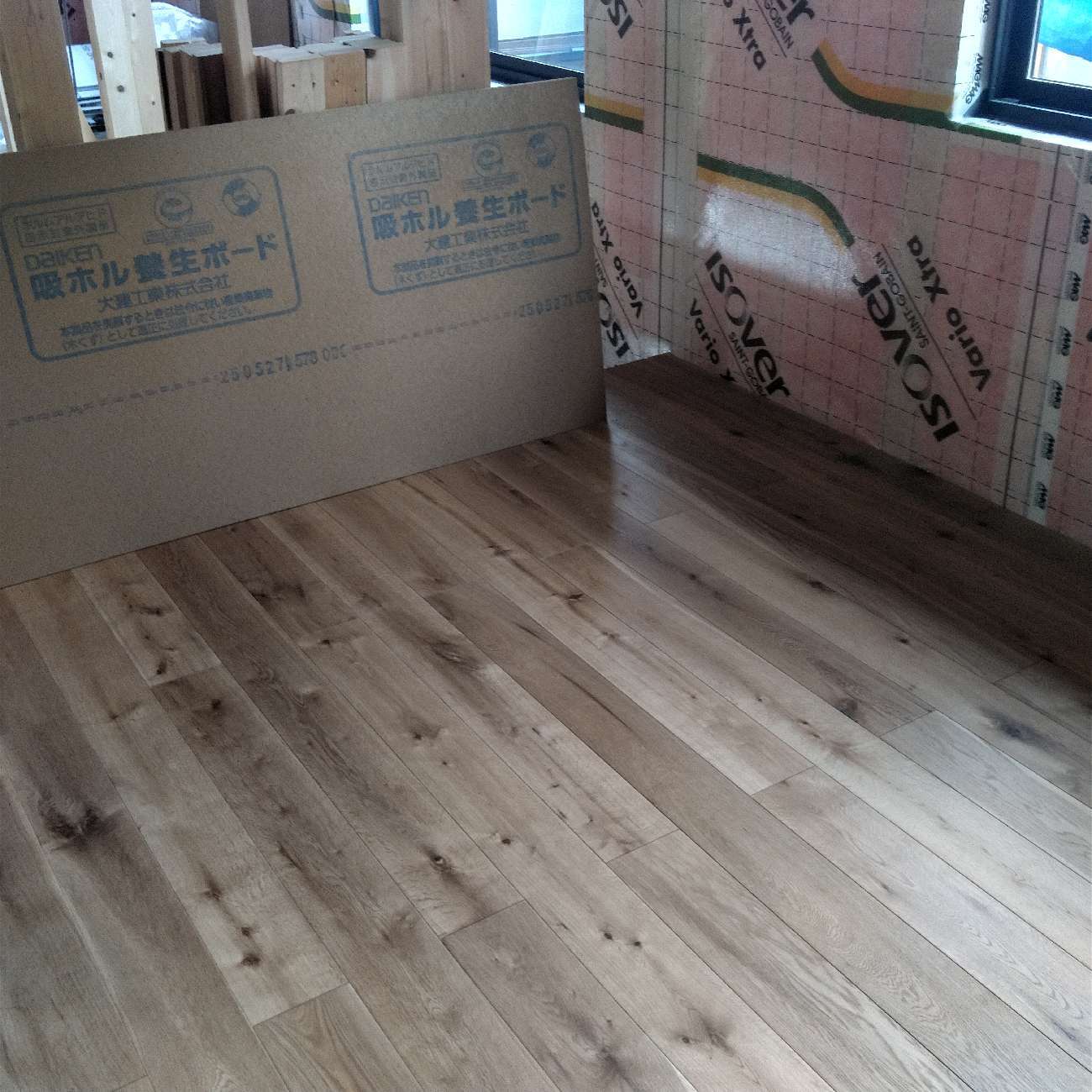 内部は、o様のお友達でもあるs木材さんのs合さんが、フローリングを搬入してくれました。今回は、いろいろ迷われて、3㎜の突板が張ってあるオーク材複合フローリングにされました。150㎜の幅広の床材で、ユニのように継ぎ目が無いところが気に入られたそうです。張り方もヘリンボーン風に突き合わせたいとの事です。h典棟梁は大変ですが(笑)どんな仕上がりになるのか楽しみです。