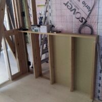 離れは、k池大棟梁によって先週加工された材料達が運び込まれ、窓枠の取付などを行っています。既製品の建具枠が未だ入ってこないので、プラスターボード達が、出番を待っております。