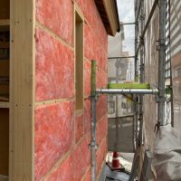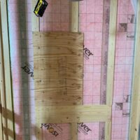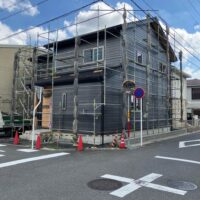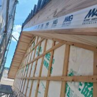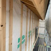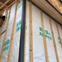 先週に引き続き、外壁の下地材を施工中の様子です。n様邸は、通りから見えるところは、ガルバリウム鋼板の横張り、見えないところは縦張りです。先週は縦張り部分でしたので横下地が必要でしたが、横張の部分は通気胴縁を兼ねた縦下地のみでOKです。玄関まわりは、ジョリパッド仕上げの為、モルタル下地用に木下地を入れています。