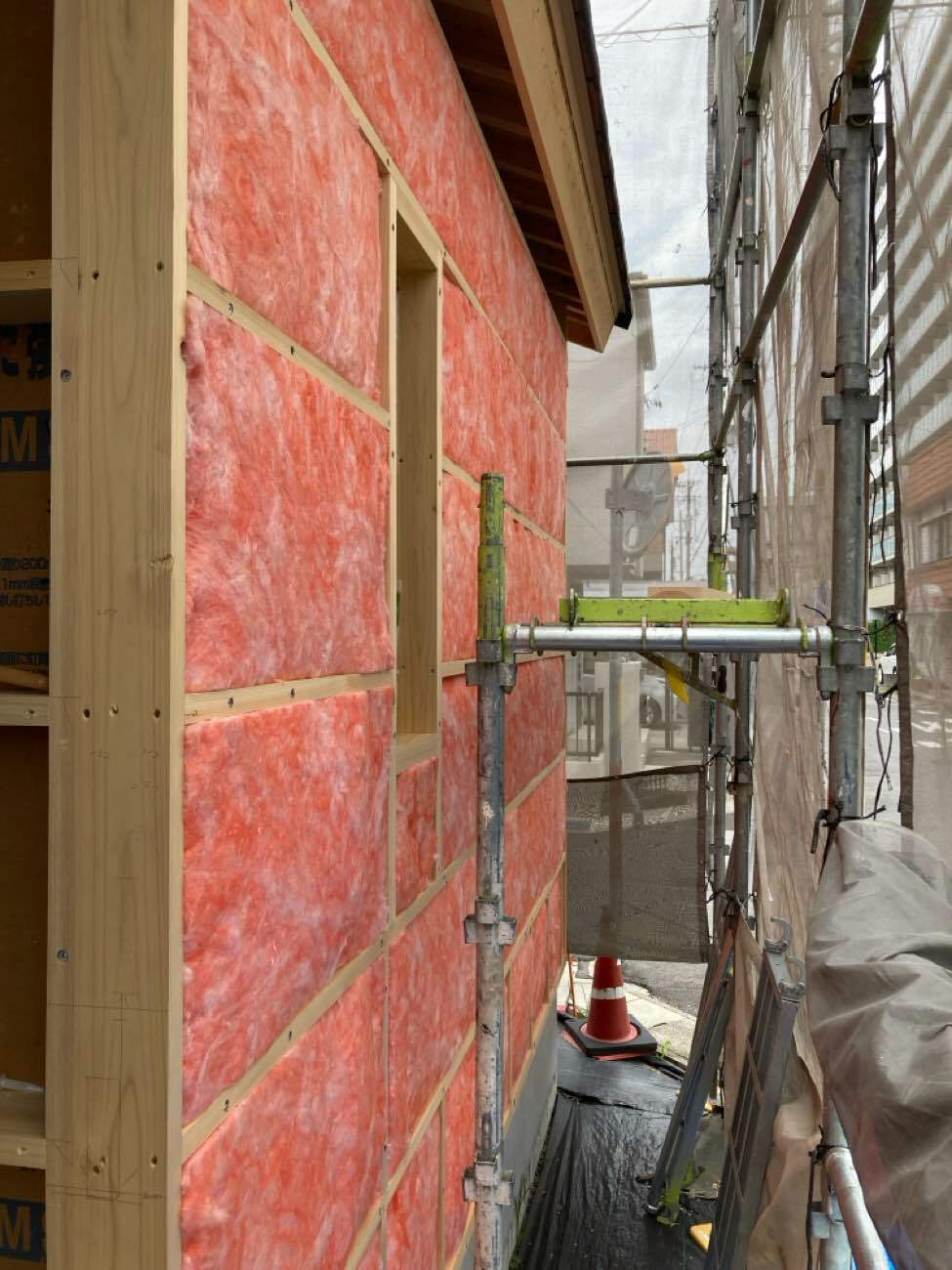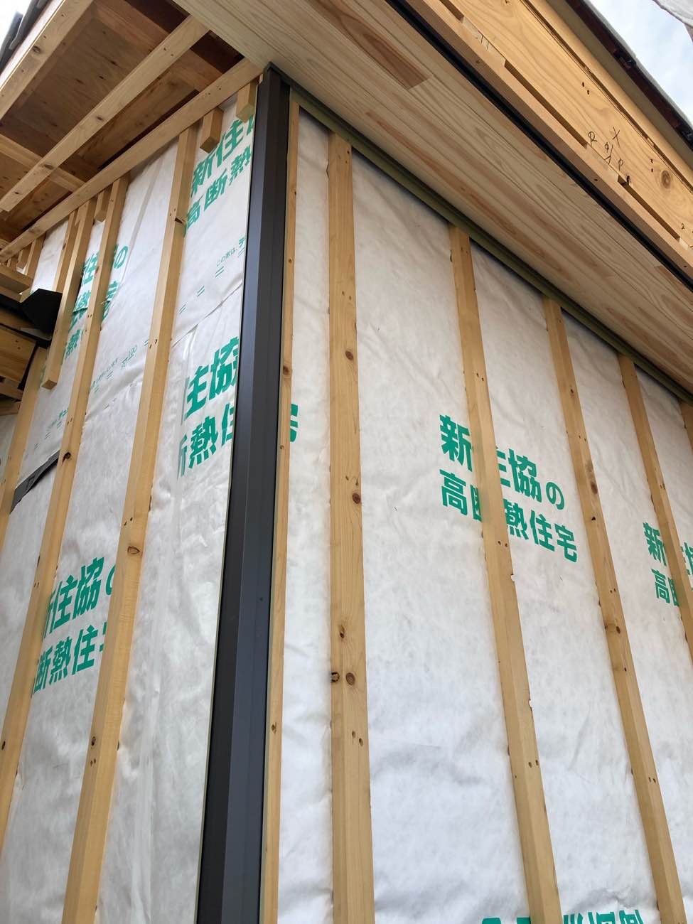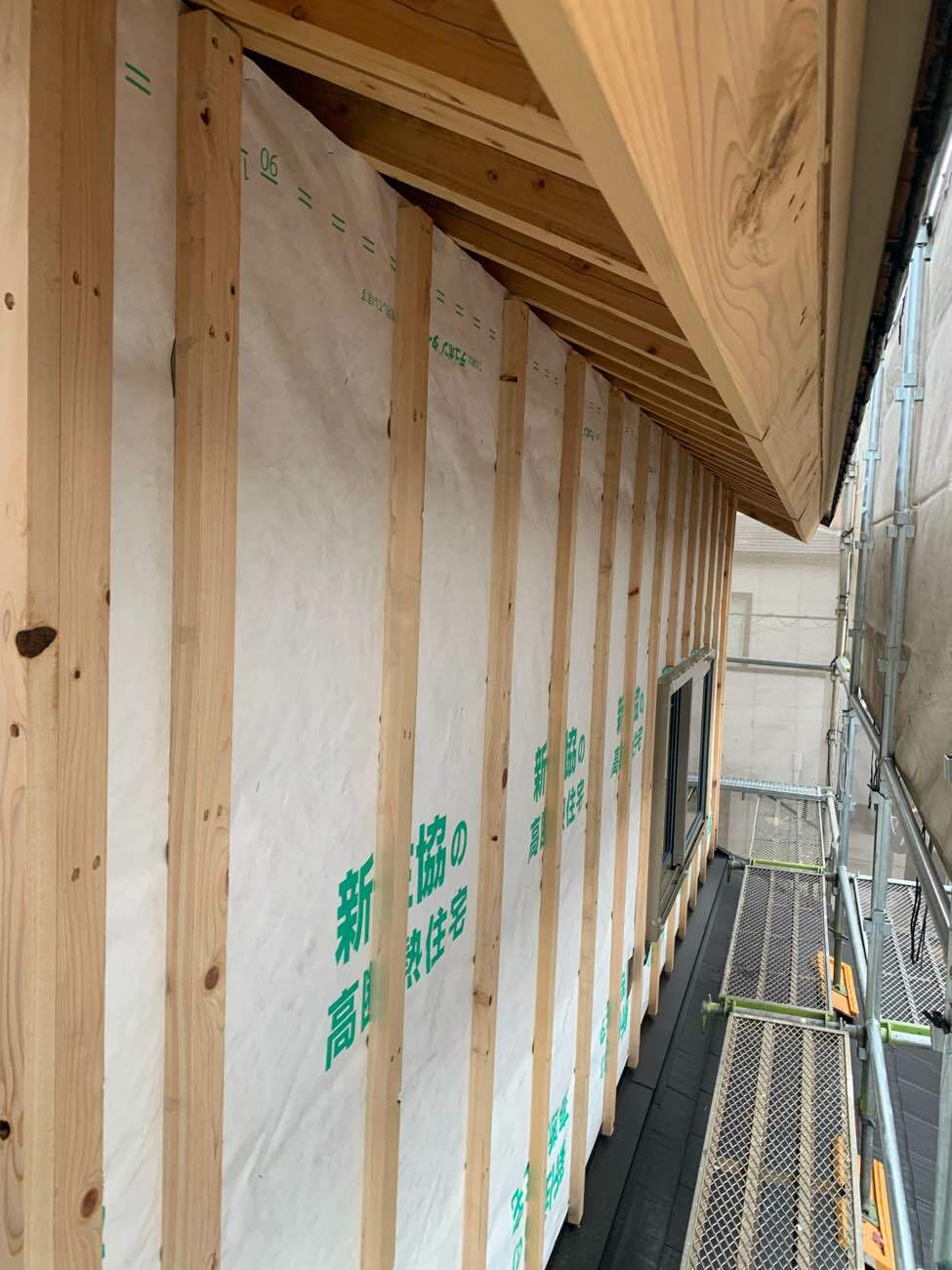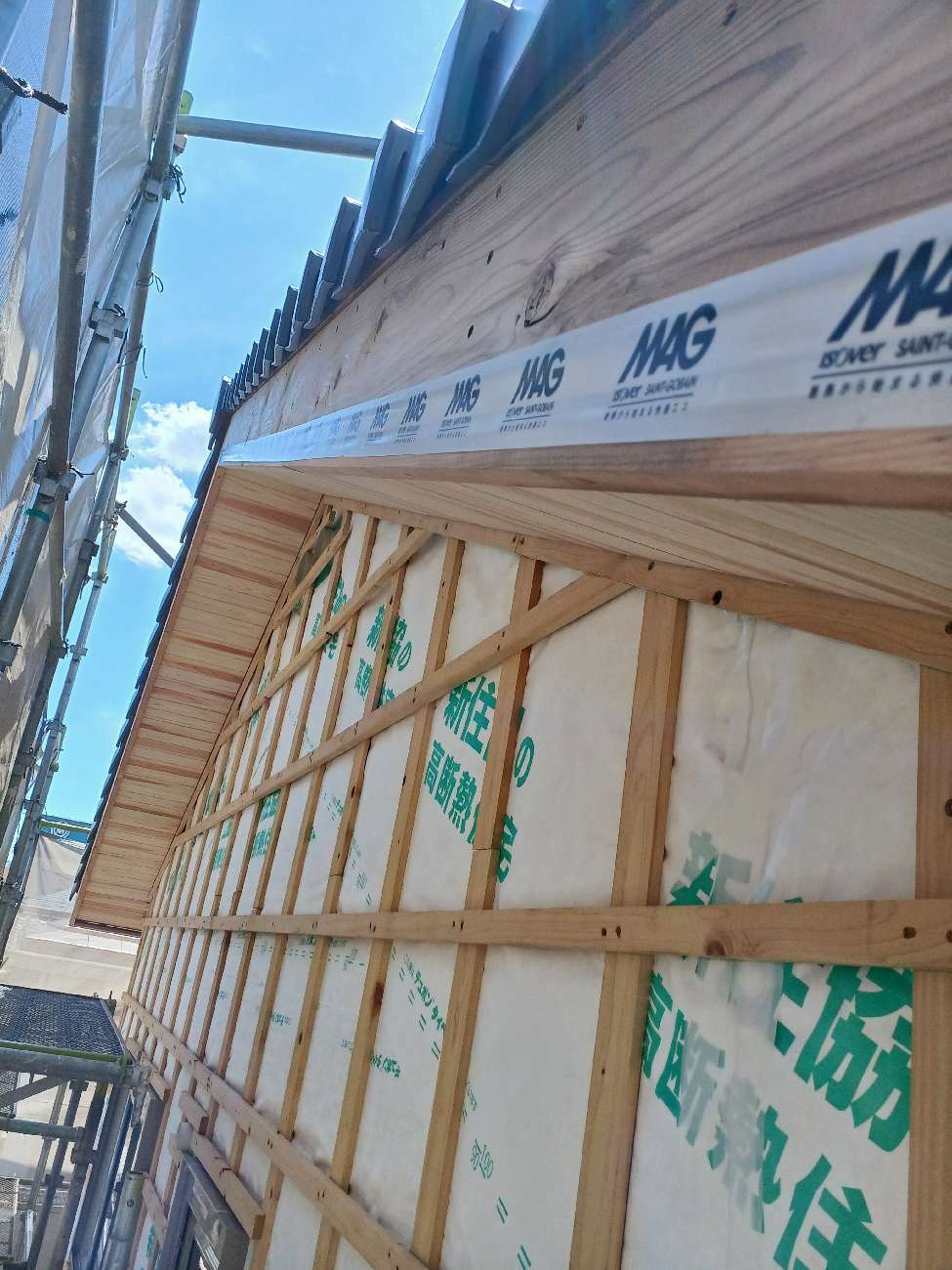 i井棟梁、1階の床断熱施工が途中ですが、梅雨が来る前に~と外の付加断熱工事に取り掛かっています。