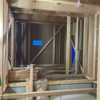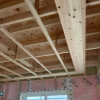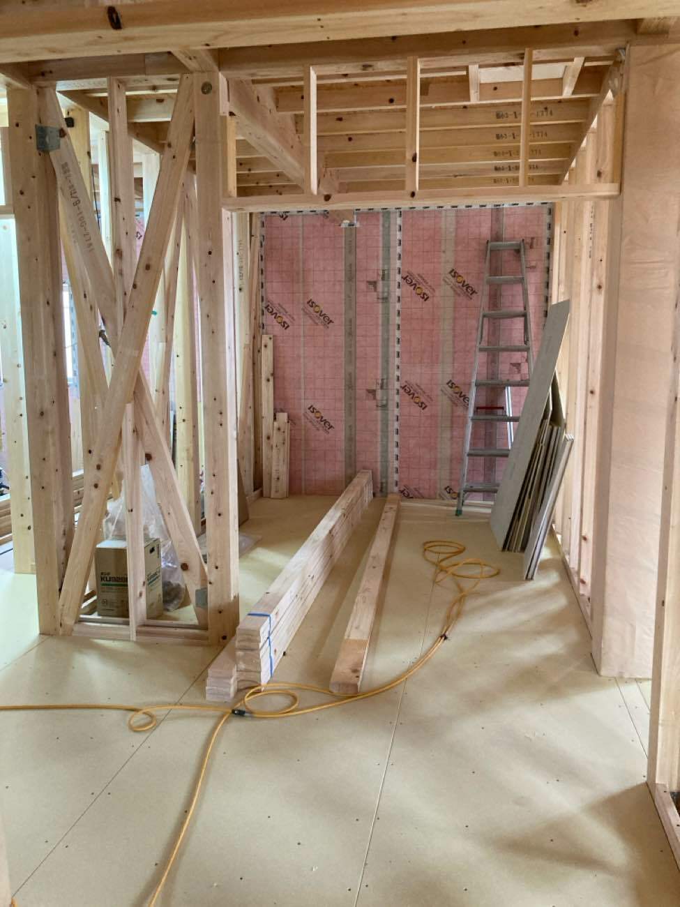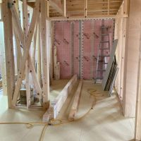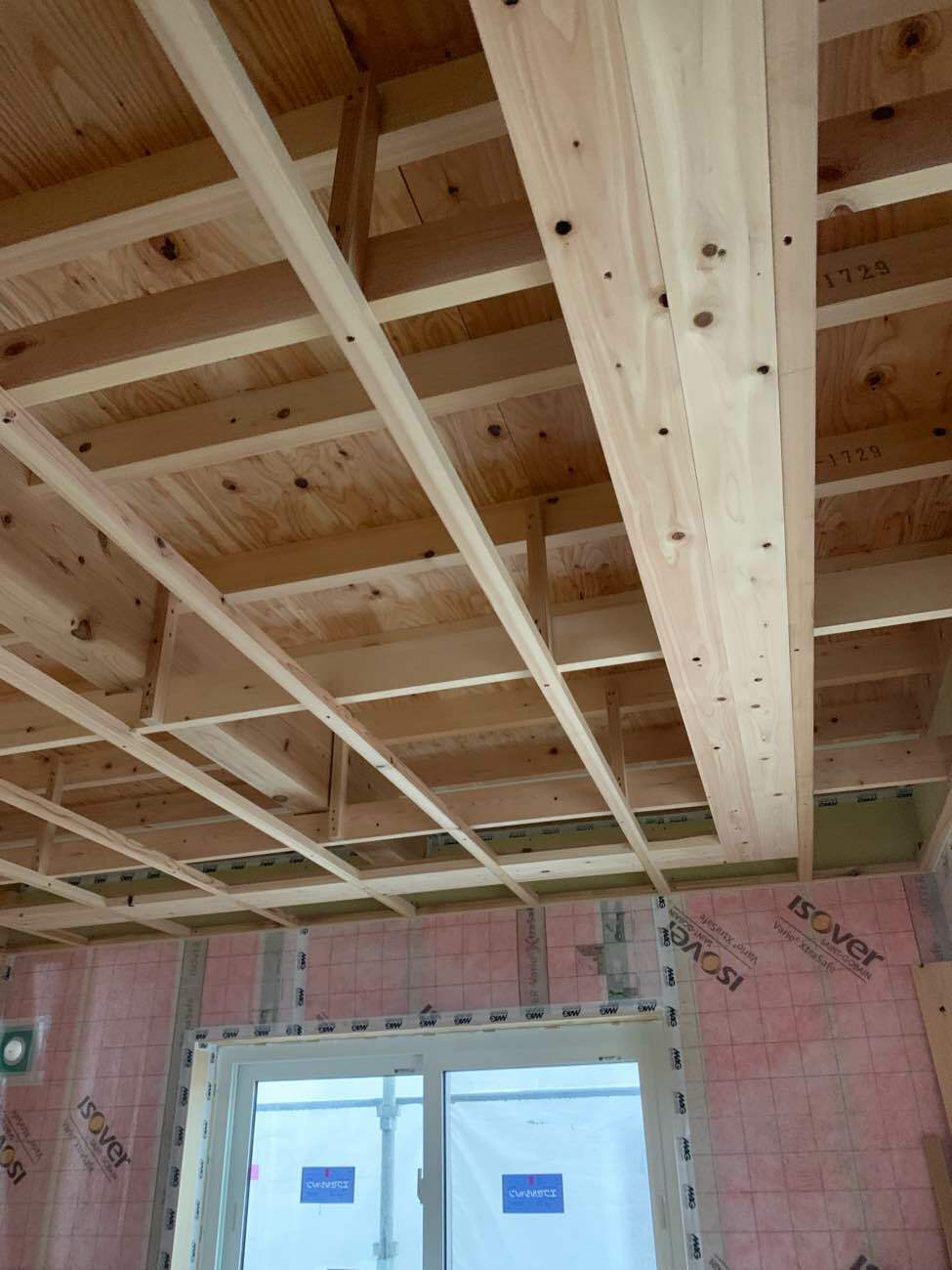 この上に気密シートを張り、構造用合板を張っていきます。根太間断熱工法で、剛床と比べて床が鳴る可能性が高くなるので、i井棟梁も慎重に施工中です。また、柱や間柱同様に、筋交いやホールダウン金物周りの気密工事を行いやすい様に工夫しています👍