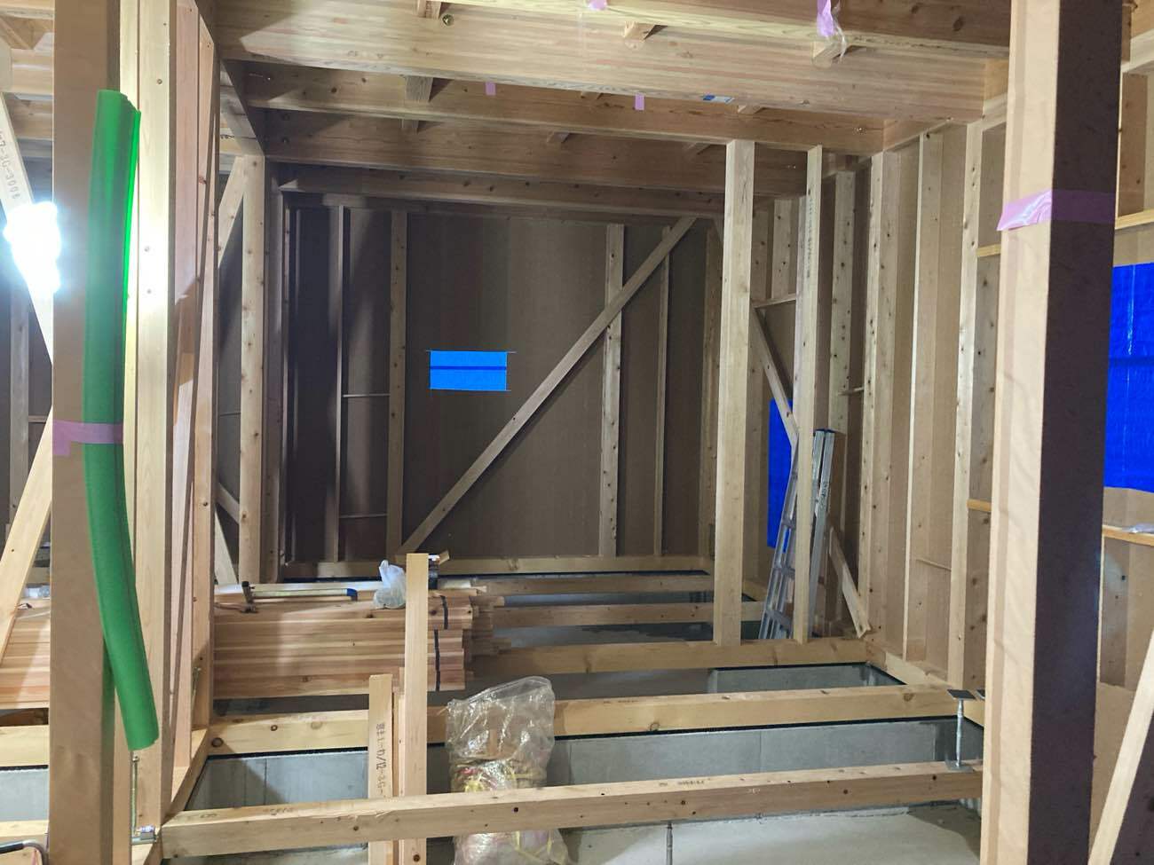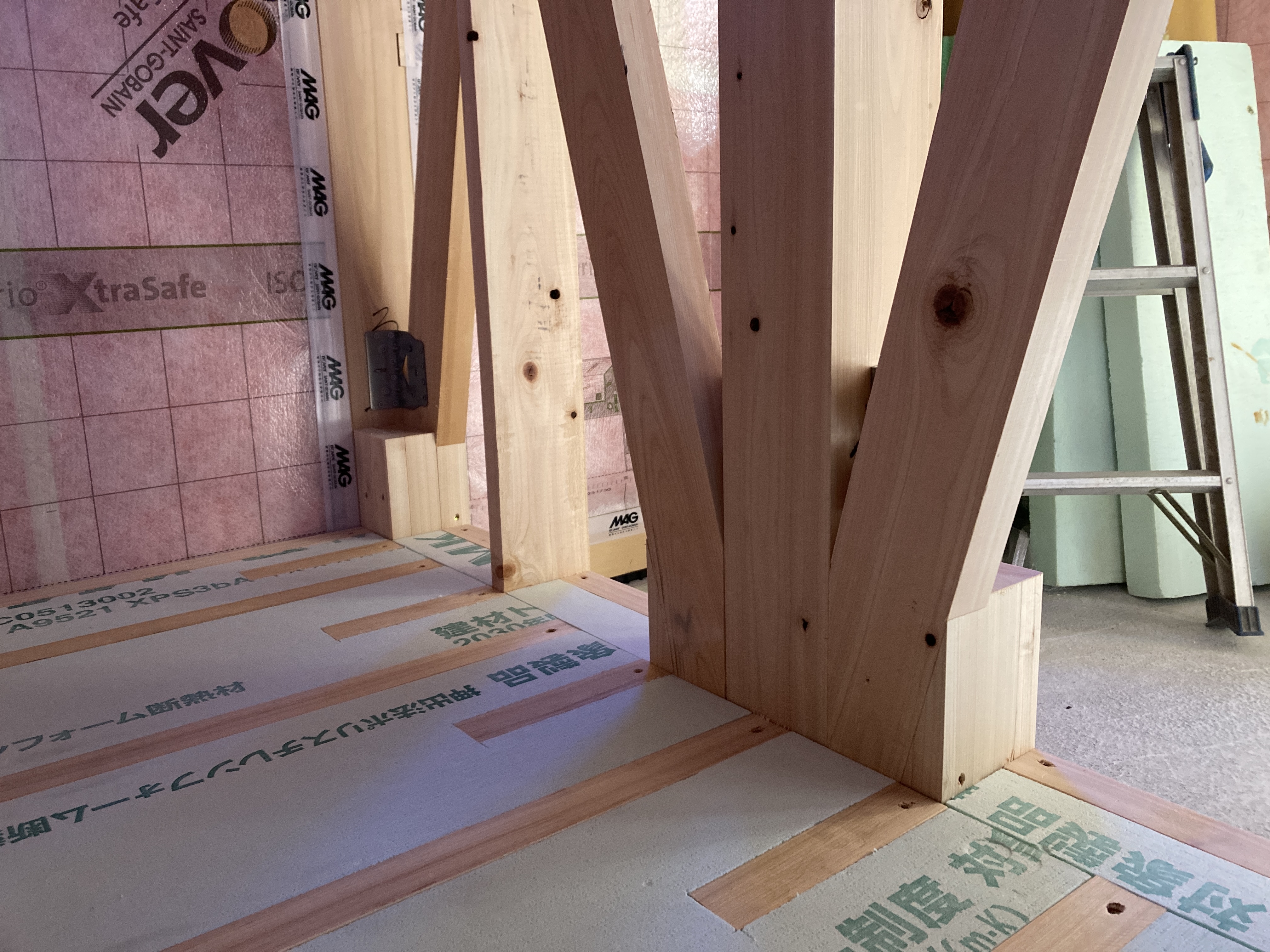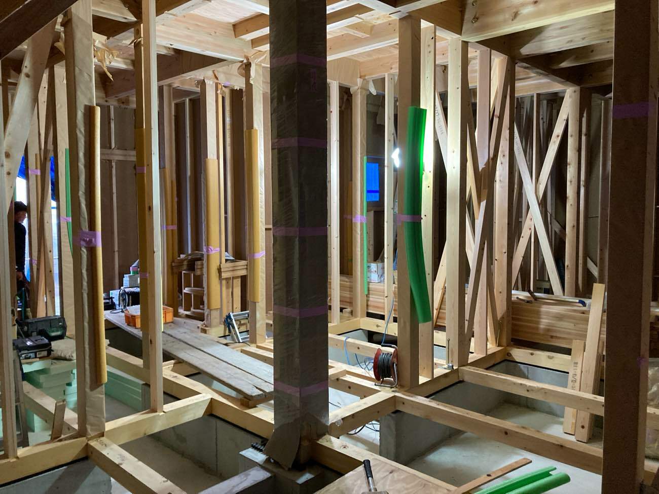 内部の様子です。基礎断熱仕様の事が多いので、土台や大引がこの時点で見えているのは懐かしい感じがします。和室に3本引きの建具が入るので、8寸(約24㎝)角の化粧柱が入っています。立派な大黒柱です👍