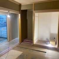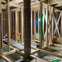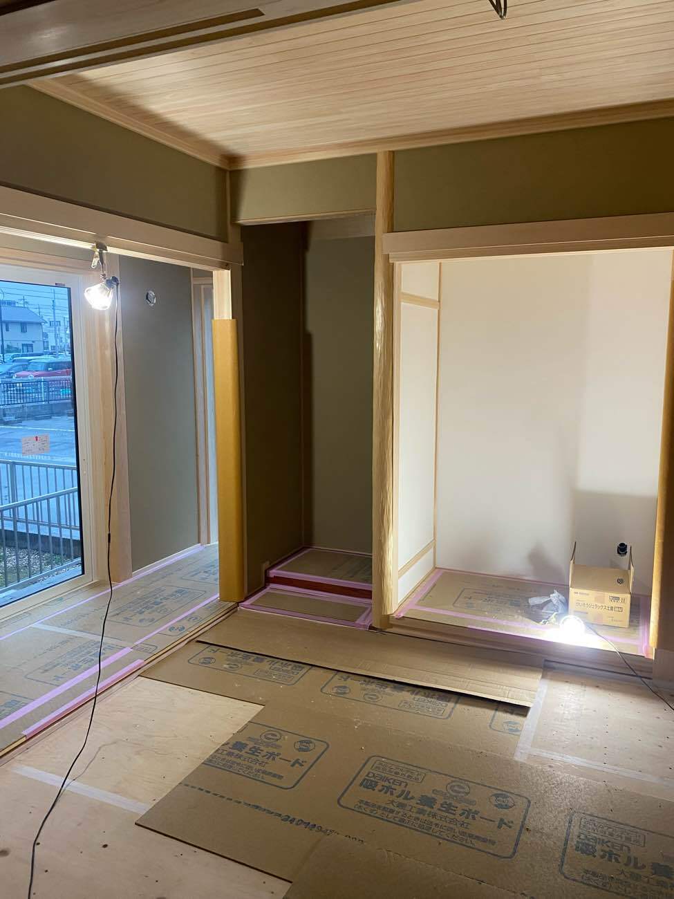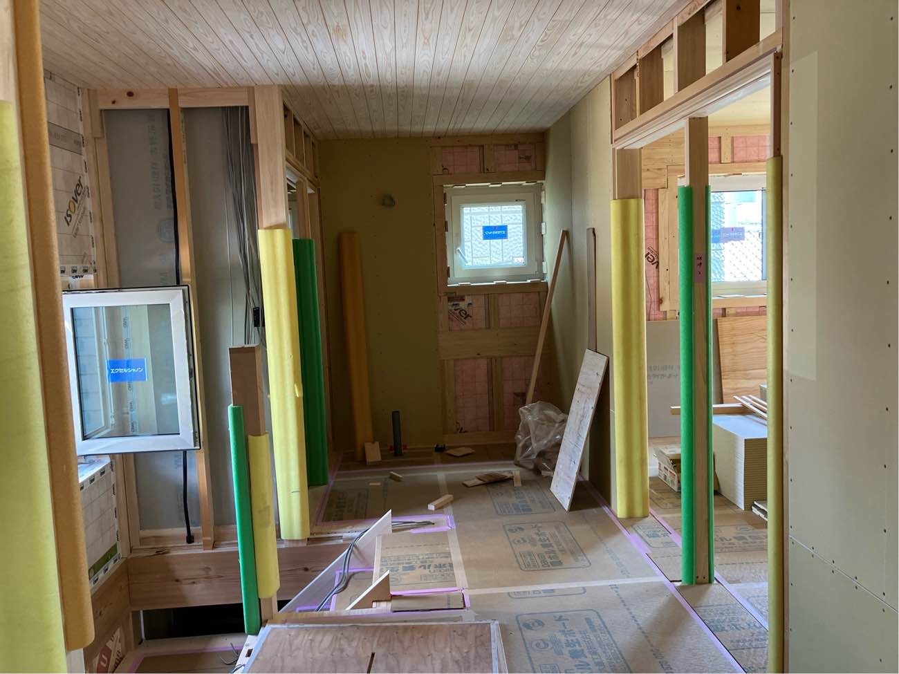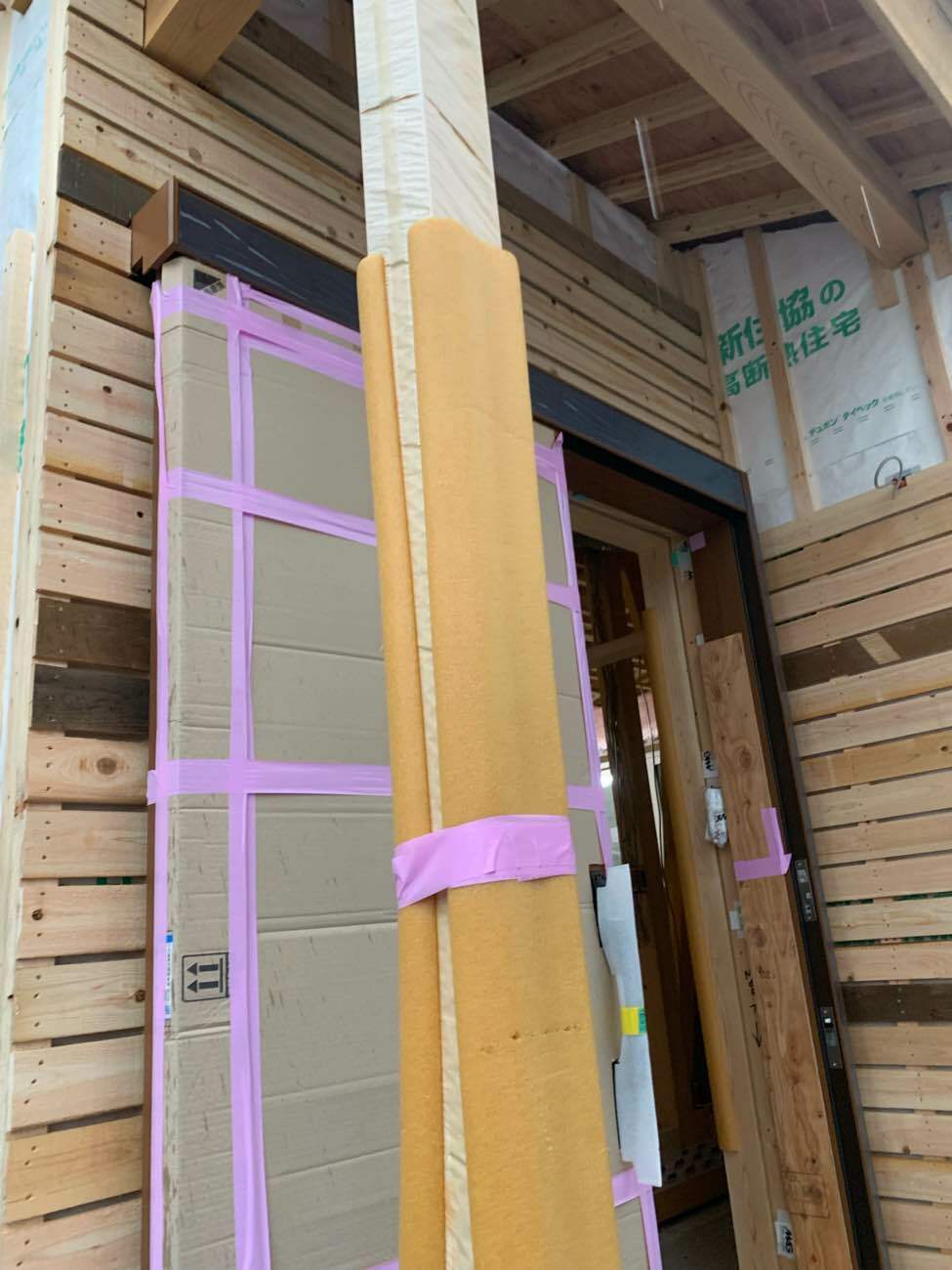 内部の様子です。基礎断熱仕様の事が多いので、土台や大引がこの時点で見えているのは懐かしい感じがします。和室に3本引きの建具が入るので、8寸(約24㎝)角の化粧柱が入っています。立派な大黒柱です👍
