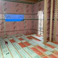 床断熱と基礎断熱、温暖地域のこのエリアでは、新住協ではどちらでも良いと言われています。床断熱は付加断熱をされれば、基礎断熱よりも表面温度は暖かく、温熱計算的にも有利ですが、配管等の気密が取りにくいなどの施工性が難点です。高断熱高気密住宅では、気密が大切なのでしっかり施工していきます。