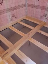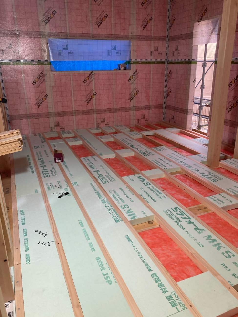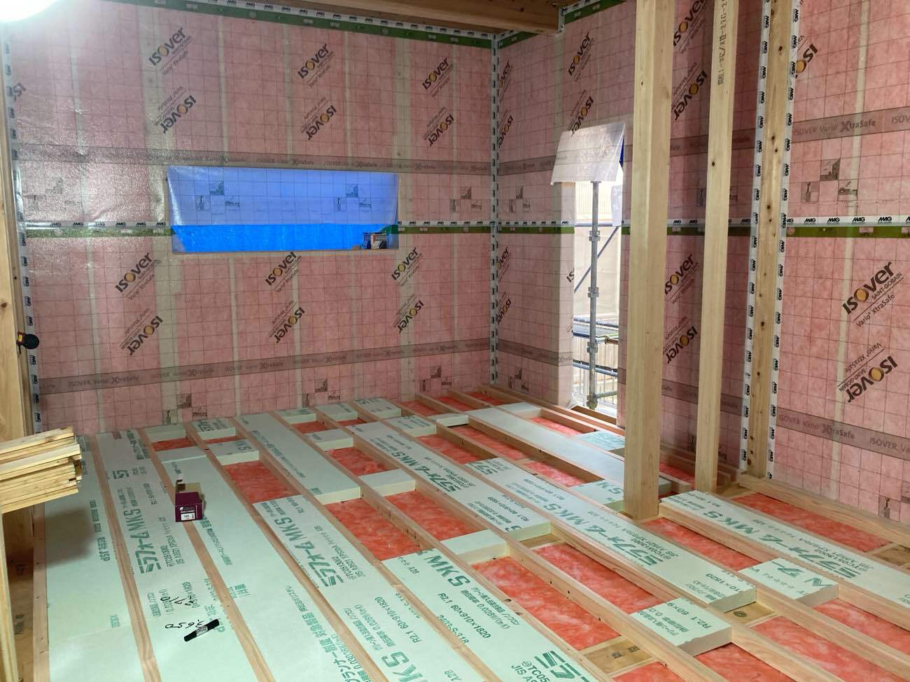 そして、床断熱も施し始めました。床下から外壁の内部に空気が入り込まない様に、気流止めも兼ねて可変性調湿気密シートを張り伸ばしています。大引き下に断熱材を受ける材料を取り付けて断熱材(高性能グラスウール105㎜)を敷き込み、大引きの上に根太を取り付けて、根太の間に断熱材(押出法ポリスチレンフォーム60㎜)を施しています。床断熱も付加断熱仕様です。