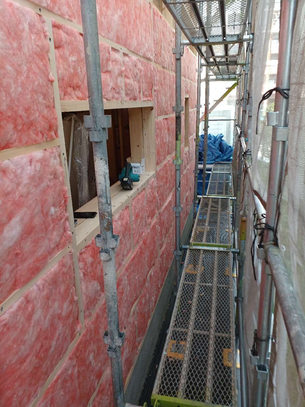 外壁の付加断熱工事の様子です。n様邸は、105㎜。以前は縦張りをしていましたが、最近は105㎜も横張りにしています。横張りにすることで柱や間柱部分も断熱材に覆われるので、より性能が良くなります。新住協のQPEX温熱計算ではこういった施工方法も加味された数値が出ますが、一般的なUA値計算では施工方法で数値が変わることはありません。恐るべし、流石、鎌田先生👍