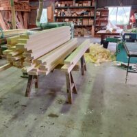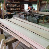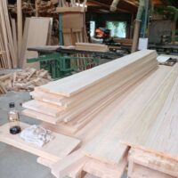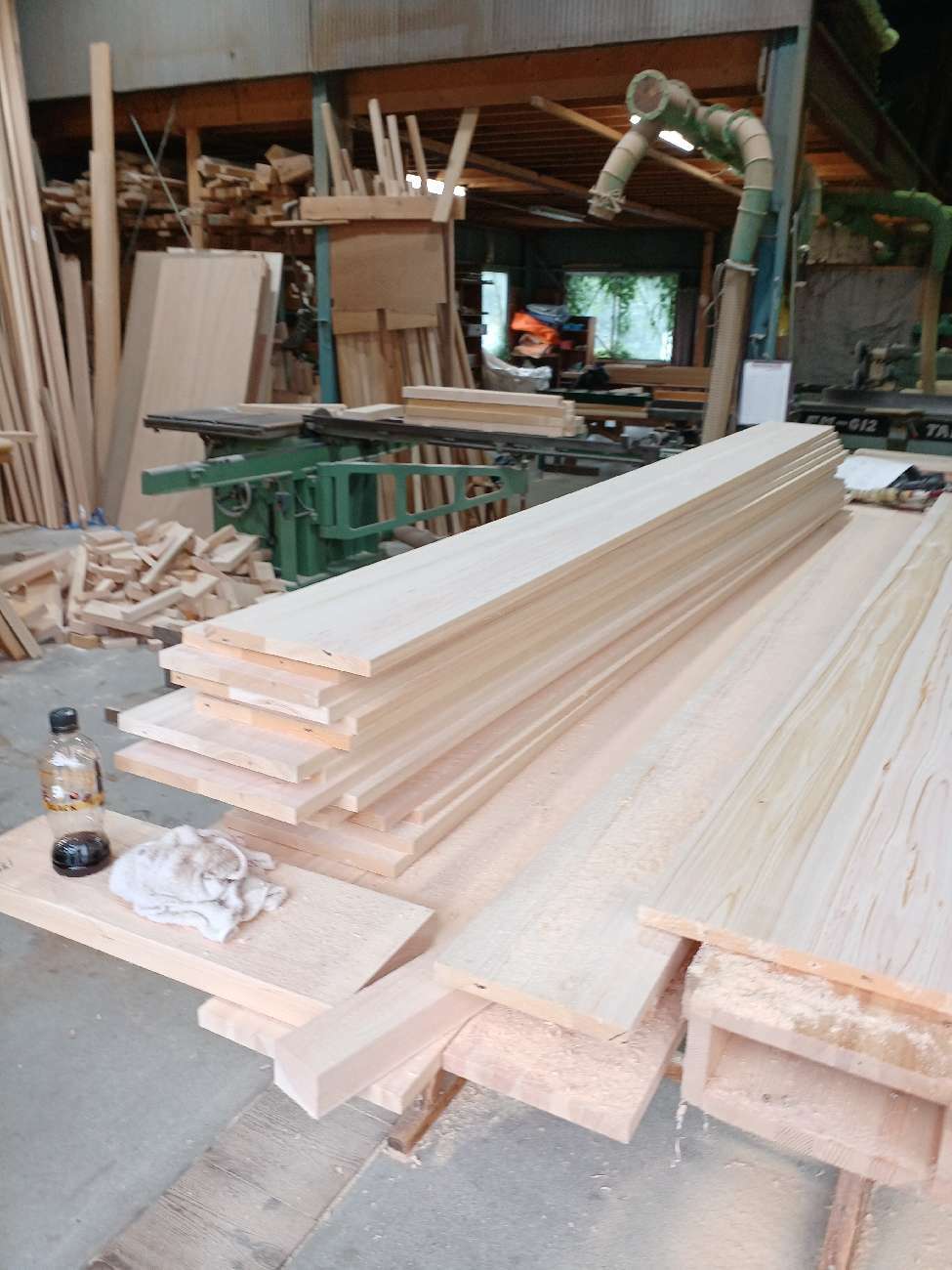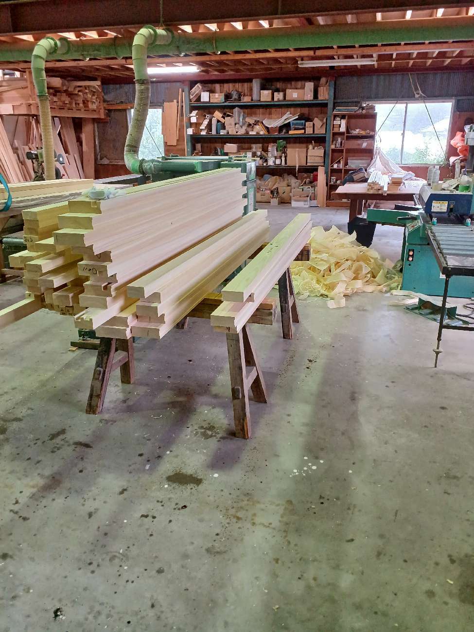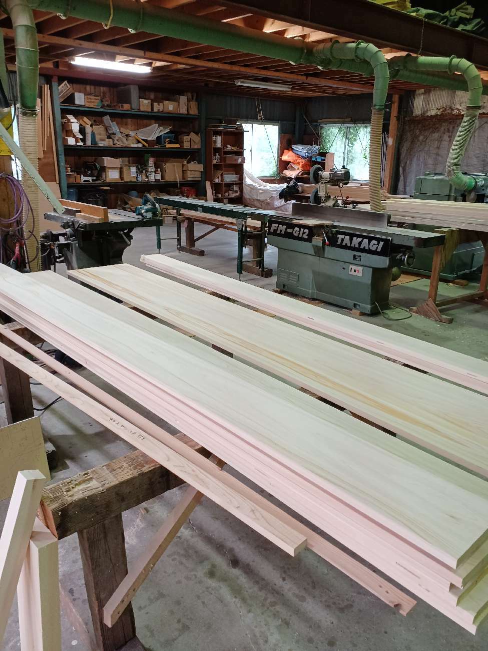今週、i井棟梁は山に柴刈りに~ではなく、黒川の工場にひきこもり、黙々と加工を行っていました。敷居や鴨居、窓枠など、既製品ではない部分は、工場で加工してます。ミノワの場合、ほとんど加工していますので、大工さん達は大変ですが、その分すごく良い仕上がりになるんですよね~