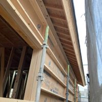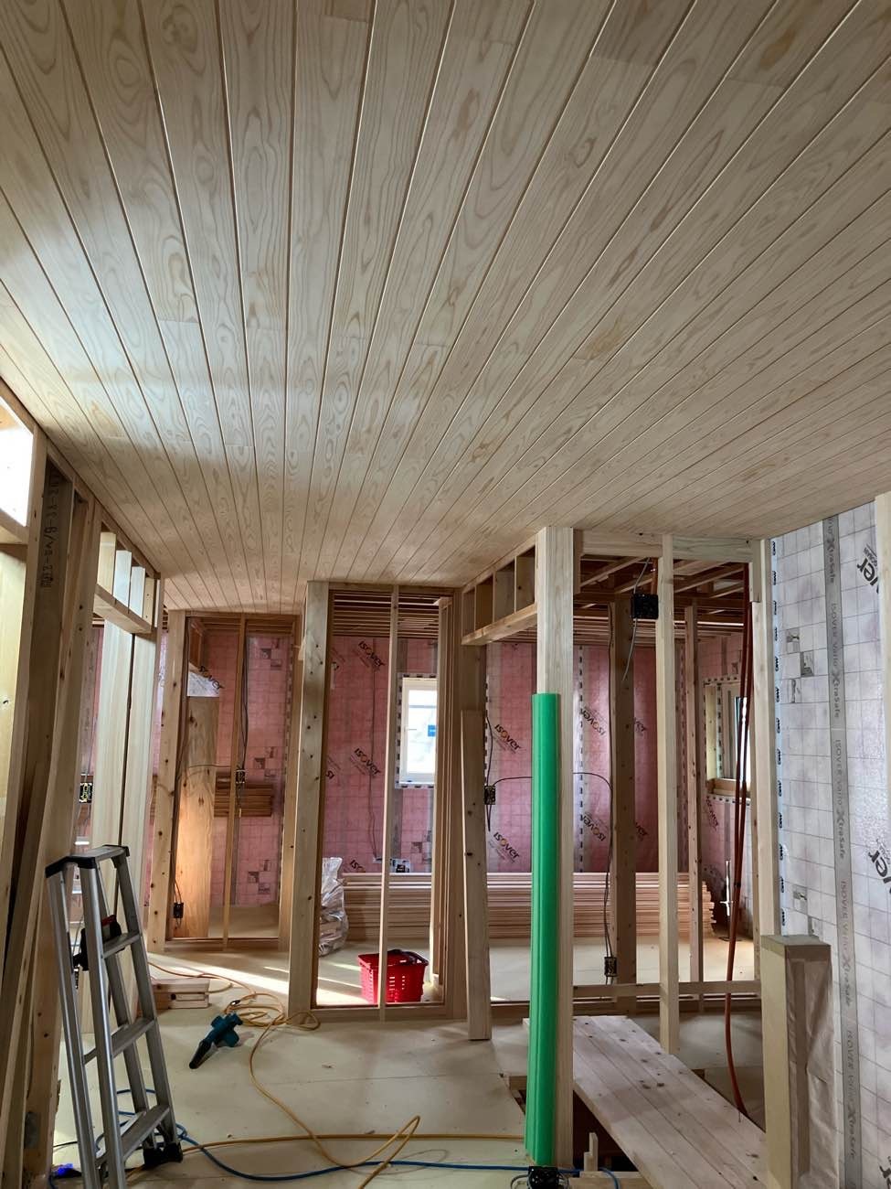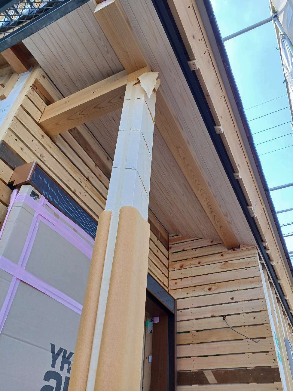 大屋根の軒裏(杉羽目板)を張っています。街中ですが準防火地域でない為、軒裏は防火構造にする規定がないので、羽目板が張れて良かったです。大工さん達には、外なので中とはまた違った気を遣うという事で不人気の材料です💦が、軒裏部分に板を張るとグッと木の家らしい雰囲気になりいいんですよね~👍