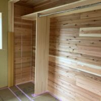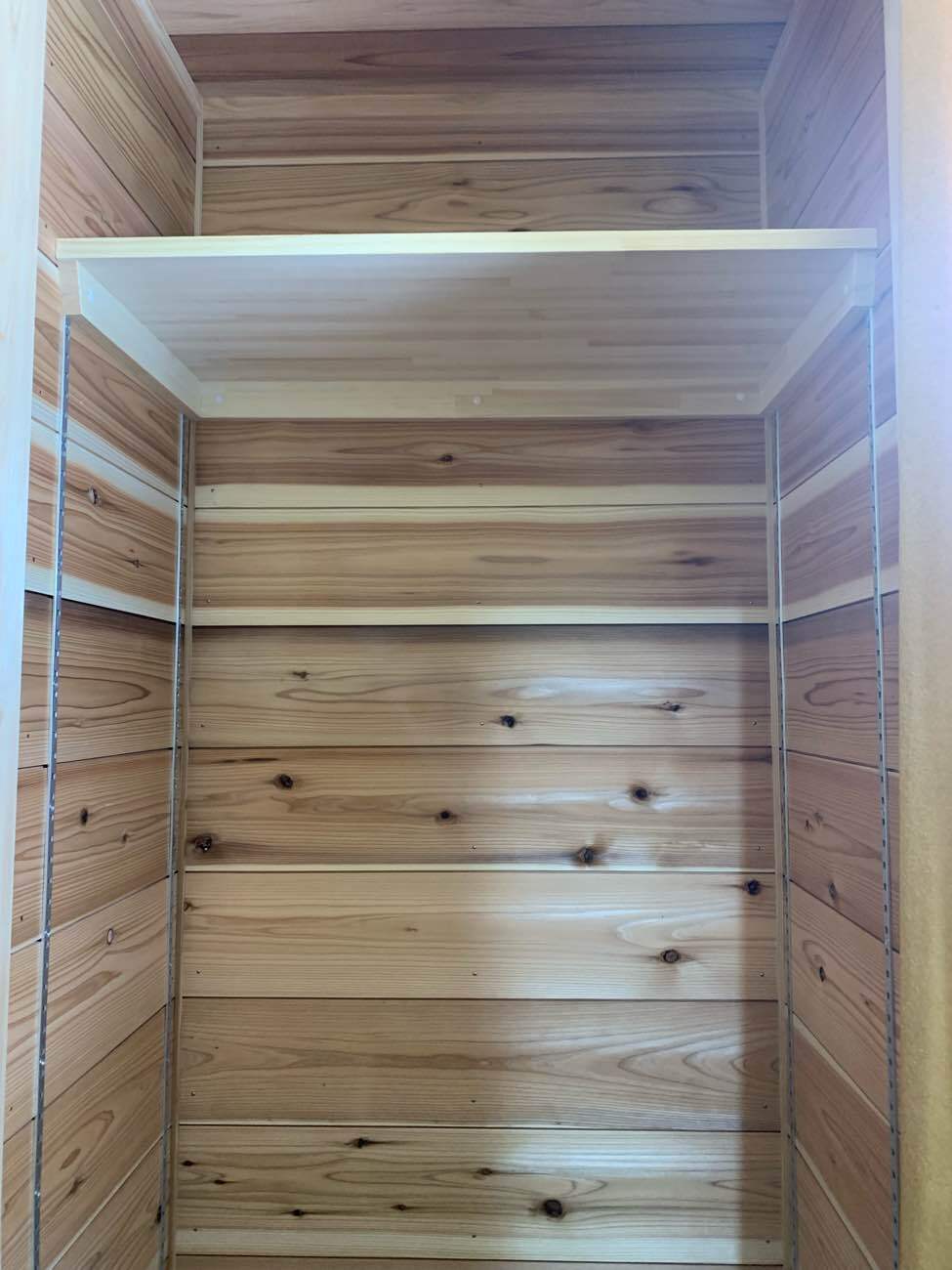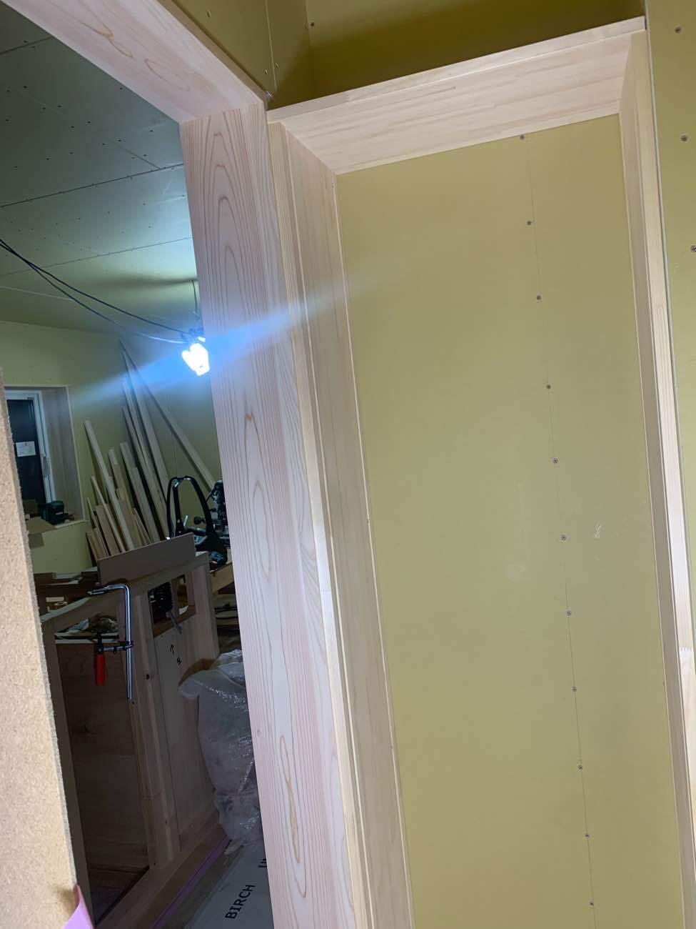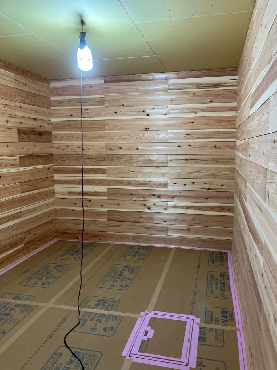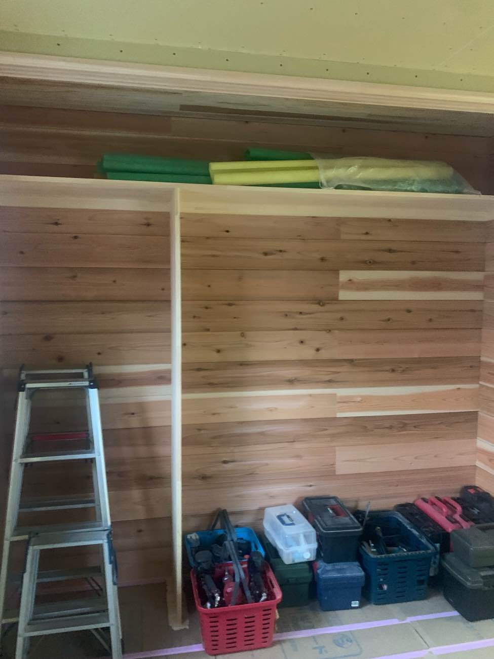 収納部分の見慣れた杉の相ジャクリ板も張り終えています。先日の見学会でも人気の材料。扉を閉めておくことが多い収納部。木を張ることで湿度をある程度調整してくれます。また10㎜の暑さがありますので、帽子掛けやポシェットなどを掛けておくフックを後からご自身でお好きなところに取り付けていただく事が可能です👍