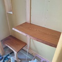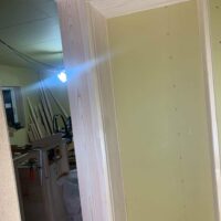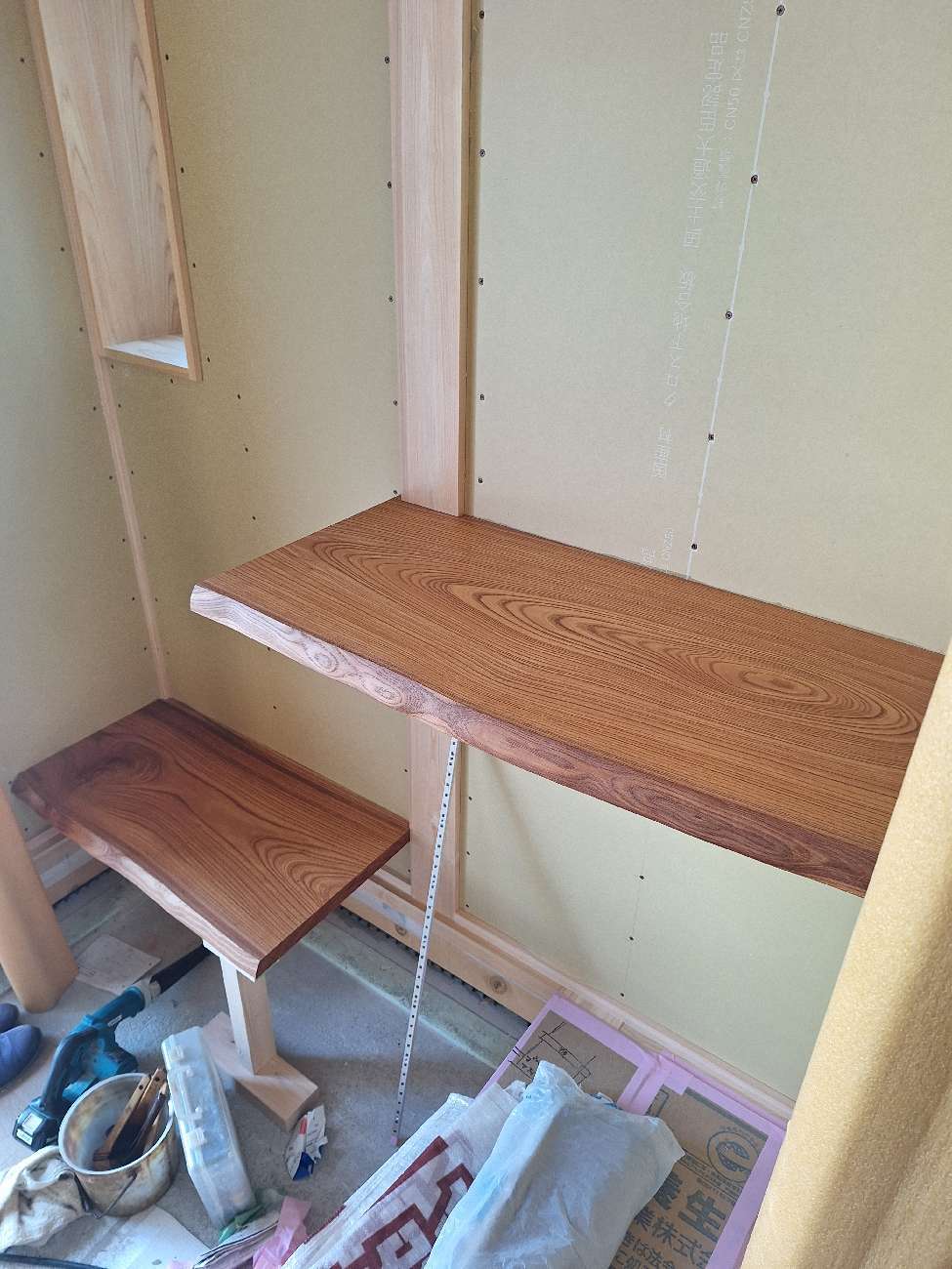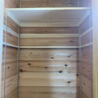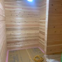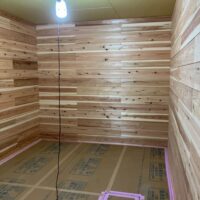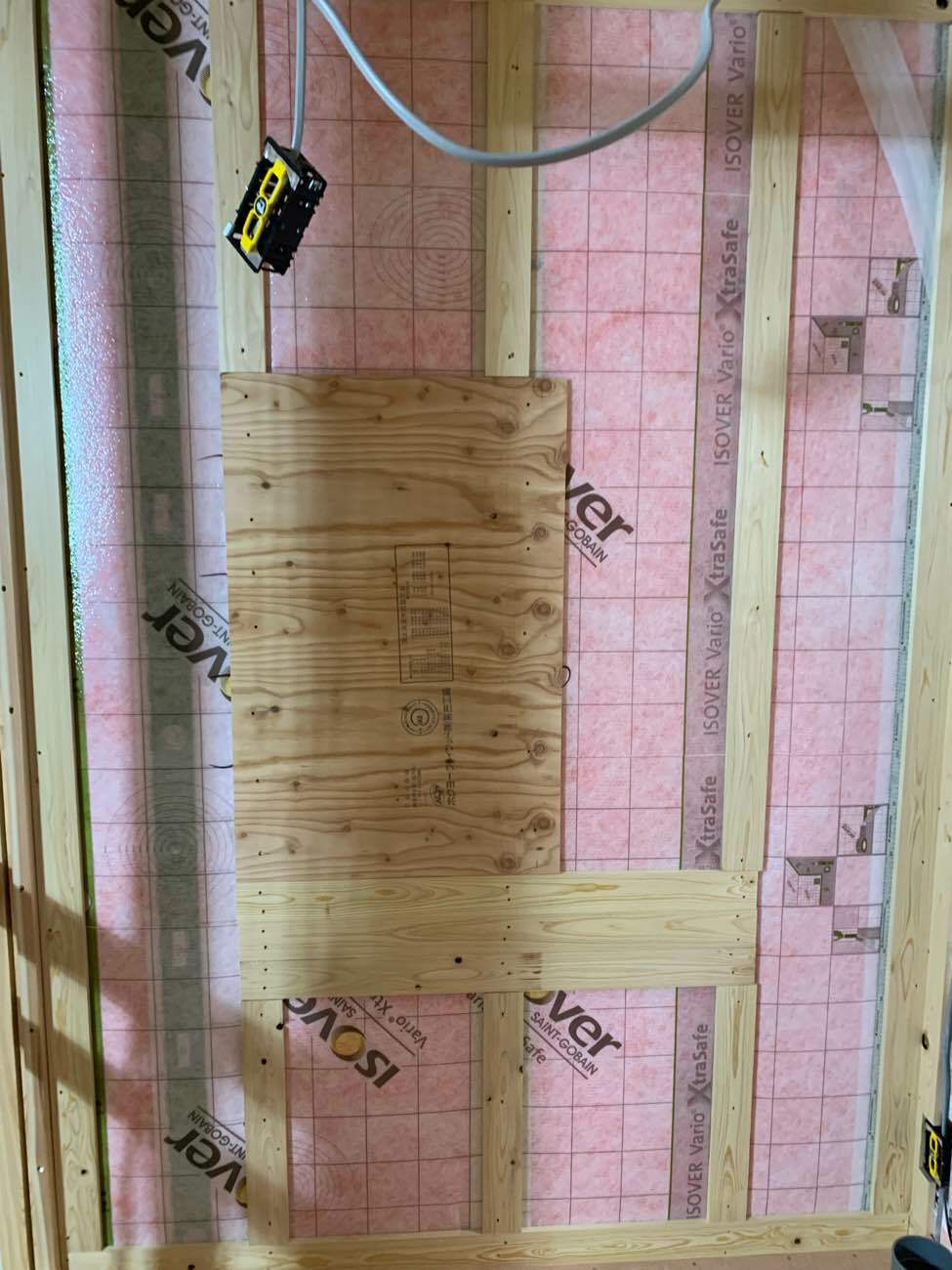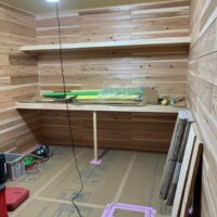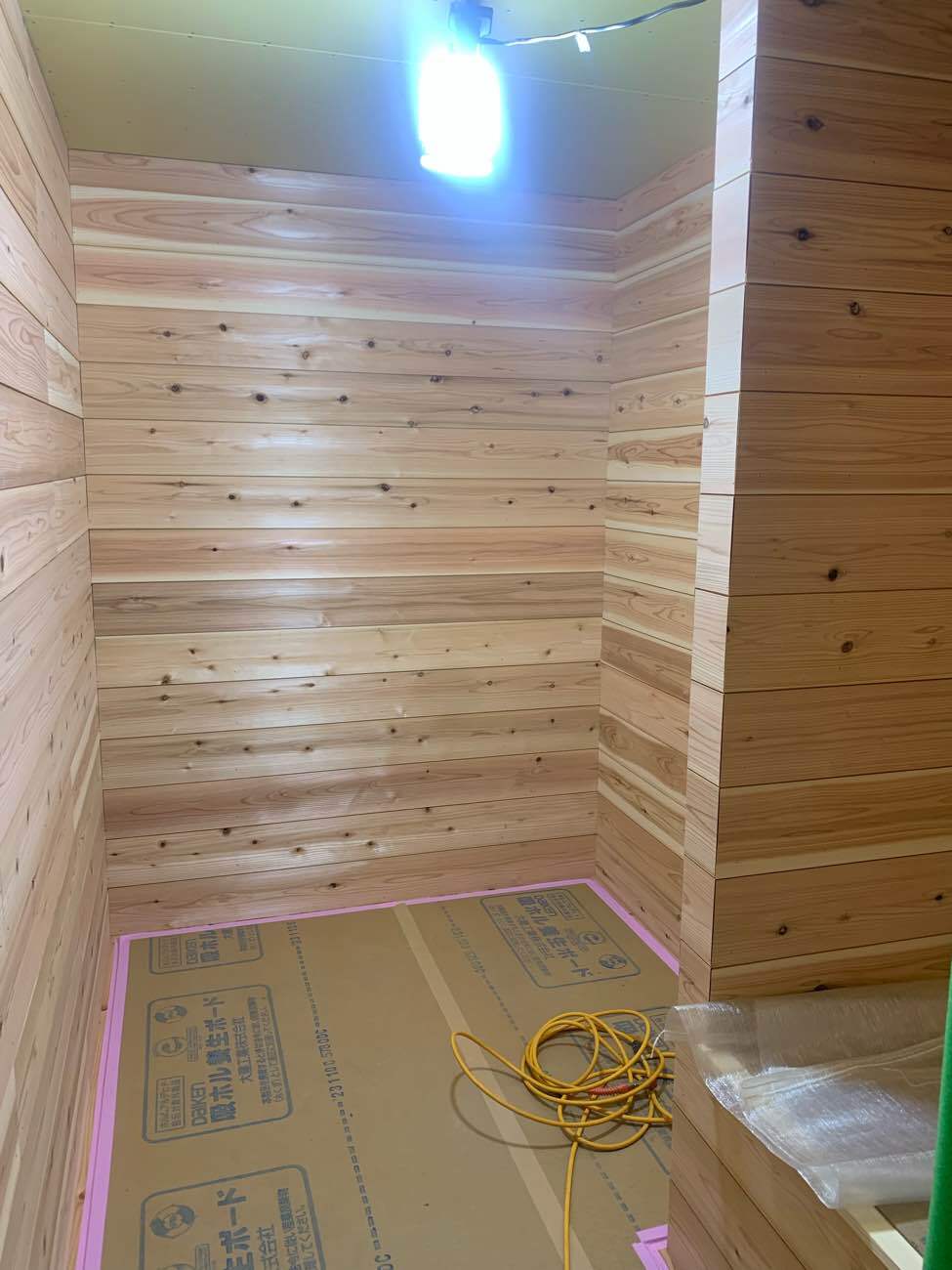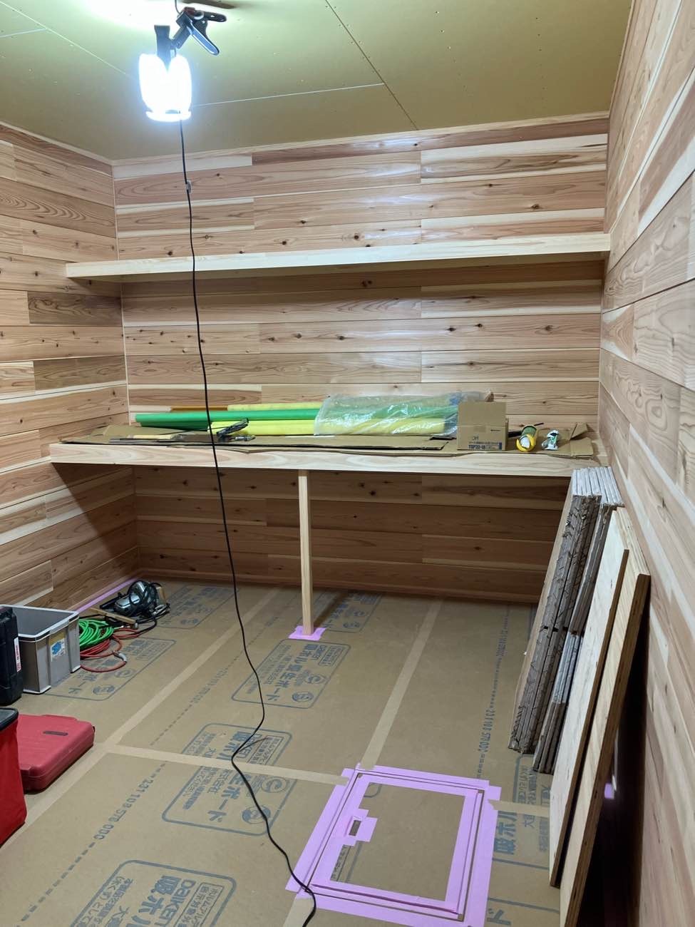 収納部分の見慣れた杉の相ジャクリ板も張り終えています。先日の見学会でも人気の材料。扉を閉めておくことが多い収納部。木を張ることで湿度をある程度調整してくれます。また10㎜の暑さがありますので、帽子掛けやポシェットなどを掛けておくフックを後からご自身でお好きなところに取り付けていただく事が可能です👍