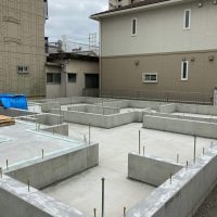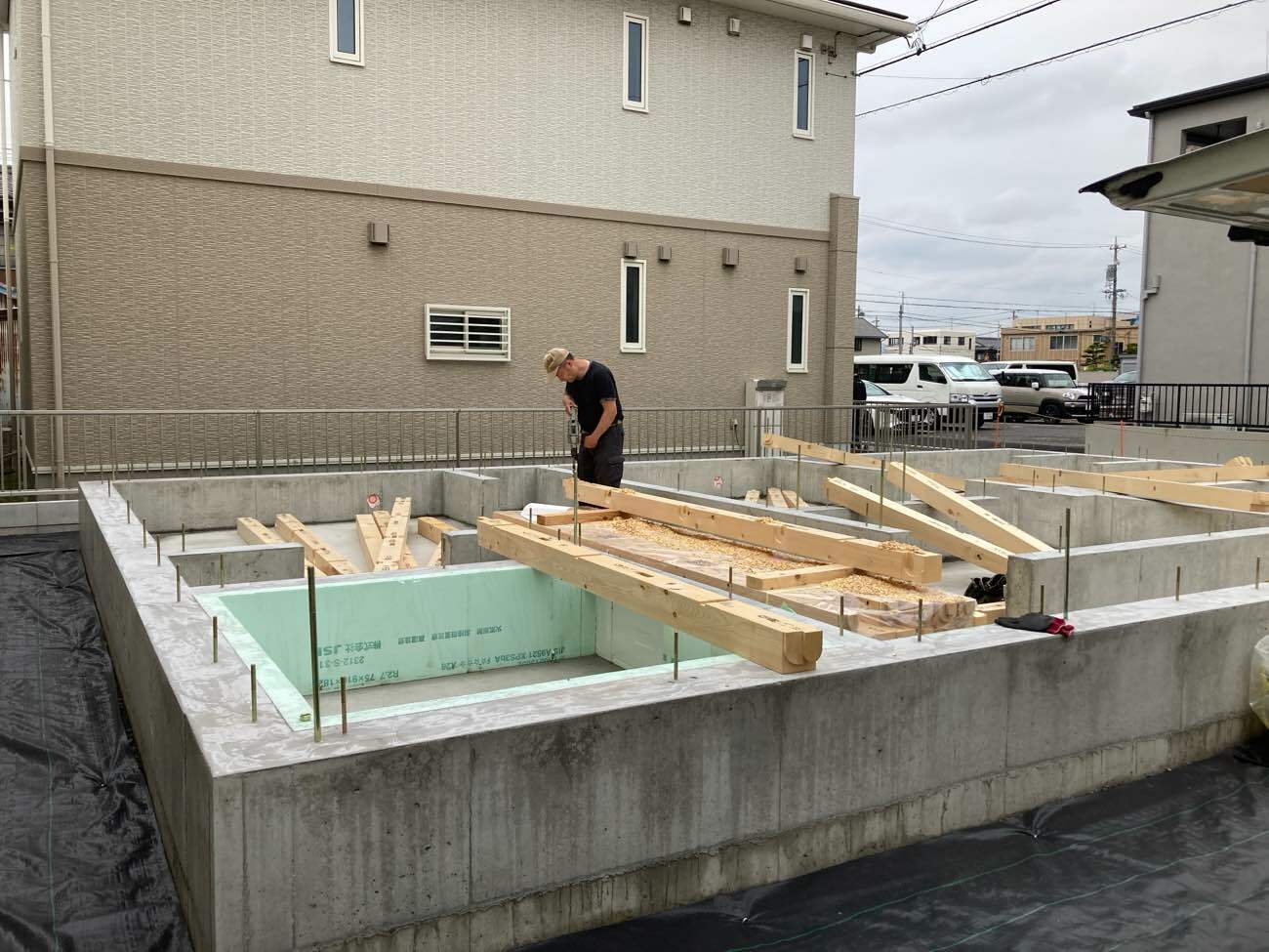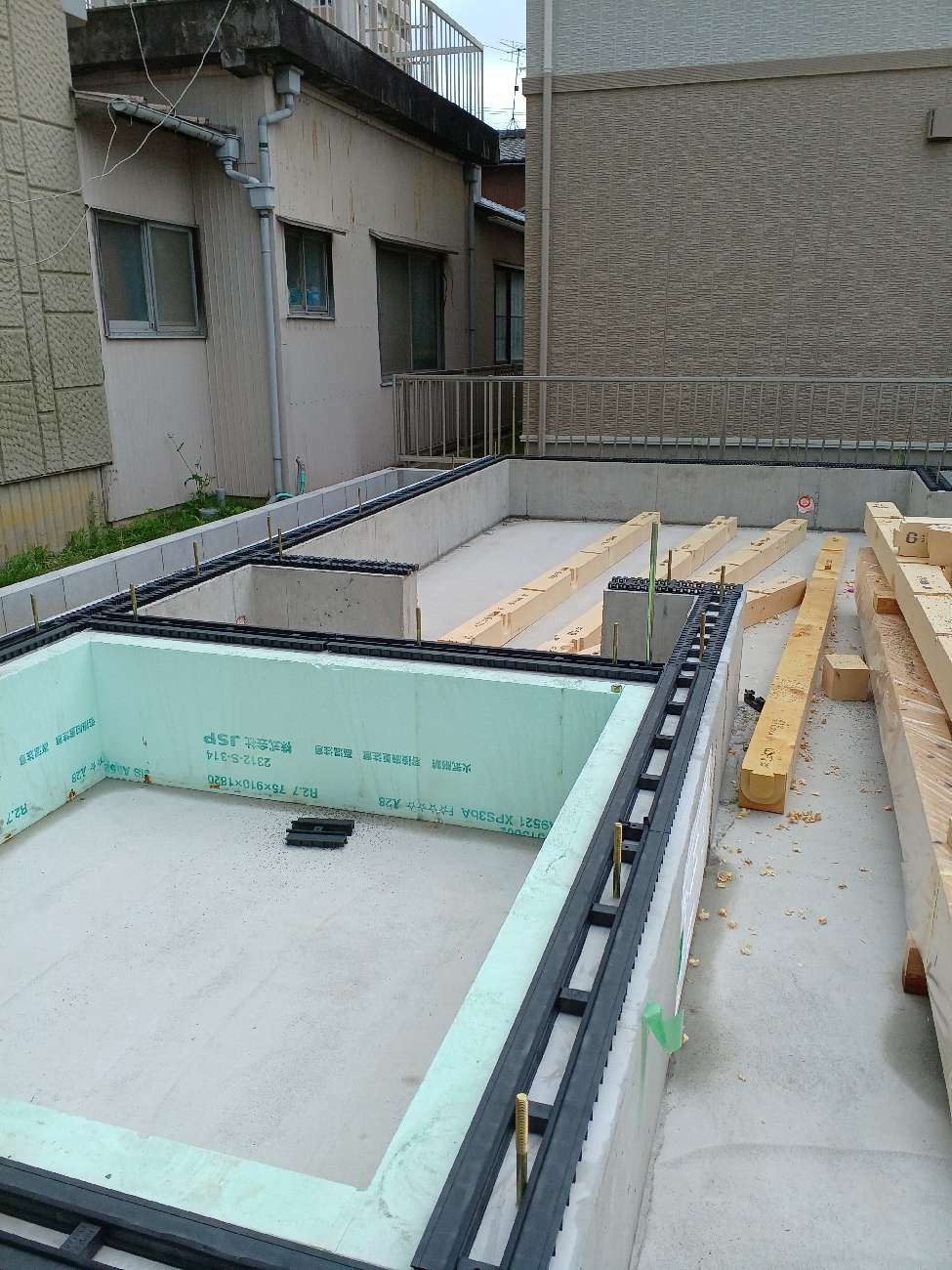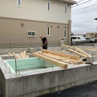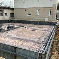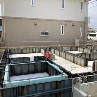 基礎の立ち上がり部分の型枠を組み、コンクリート打設も行いました。床断熱の為、ユニットバスや玄関土間の部分に基礎断熱を施しています。