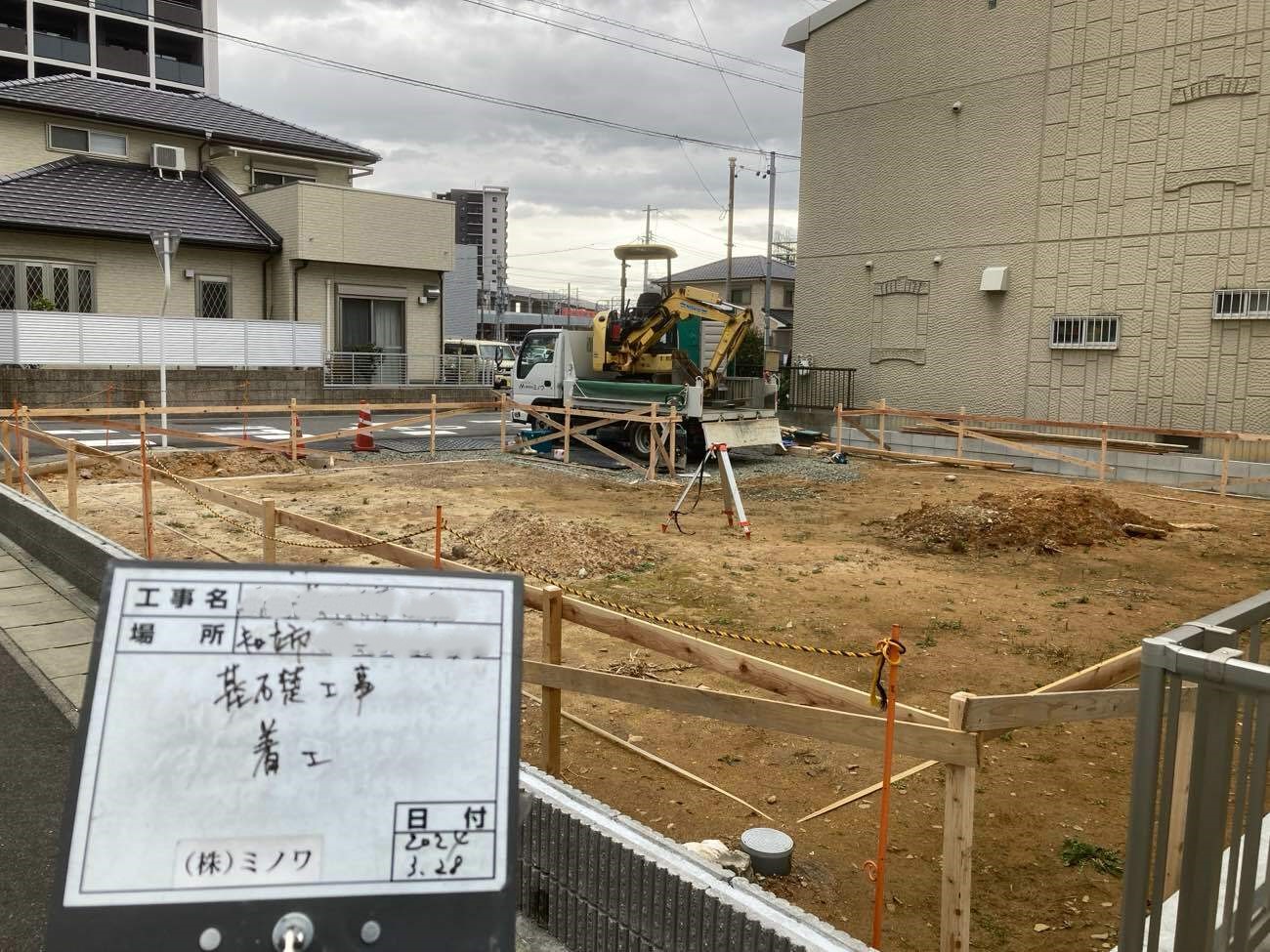 申請がやっと下りましたので、基礎工事に着手しました。首が伸び過ぎて地面に落ちるかと思いました💦水盛り遣り方で建物の位置を出し、掘方を行っている様子です。