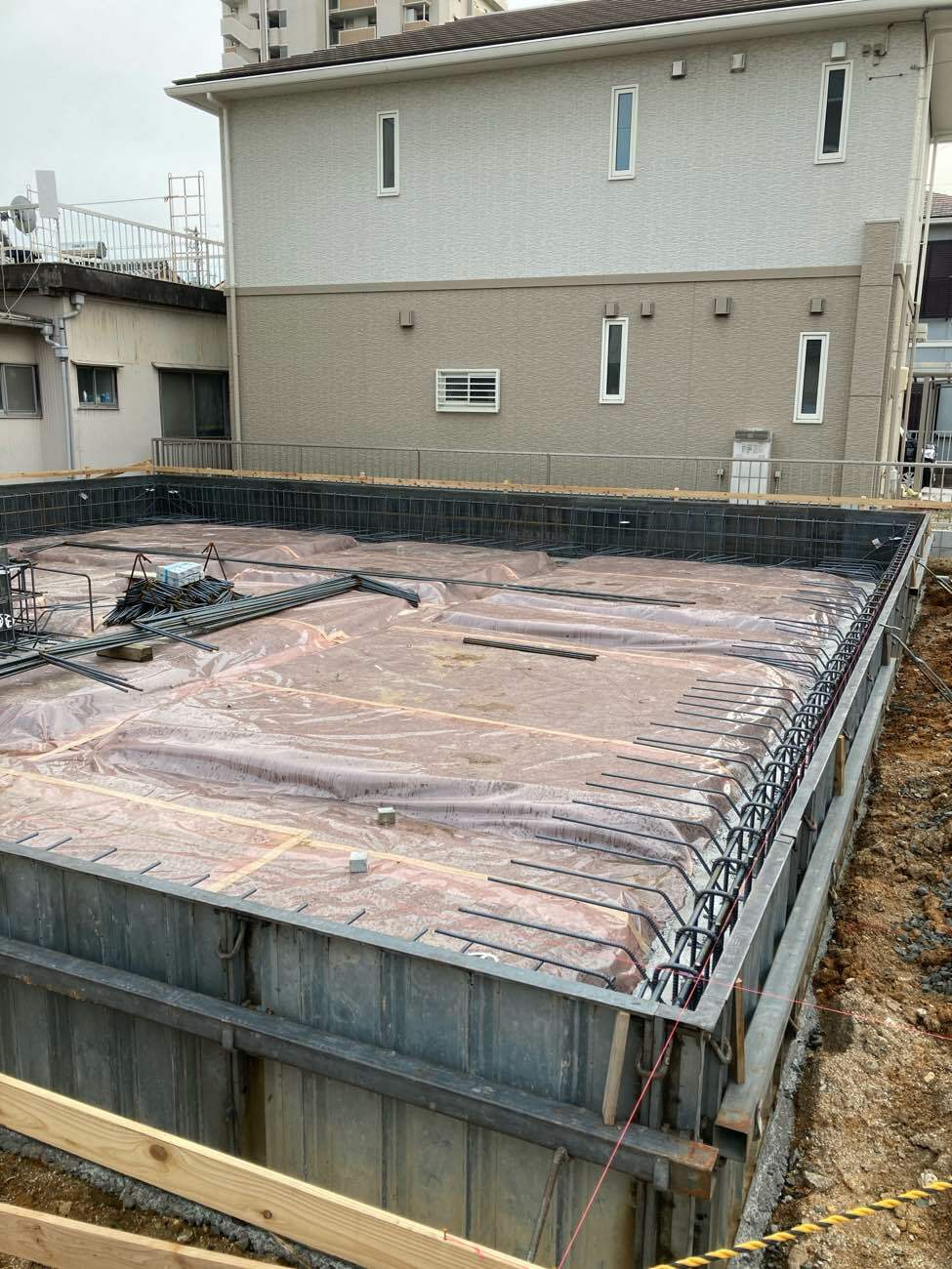 明日コンクリート打設をするため、江南事務所のhさんが配筋検査に行きましたが、明日はあいにくの雨予報。コンクリート打設は明後日に延期しました。
