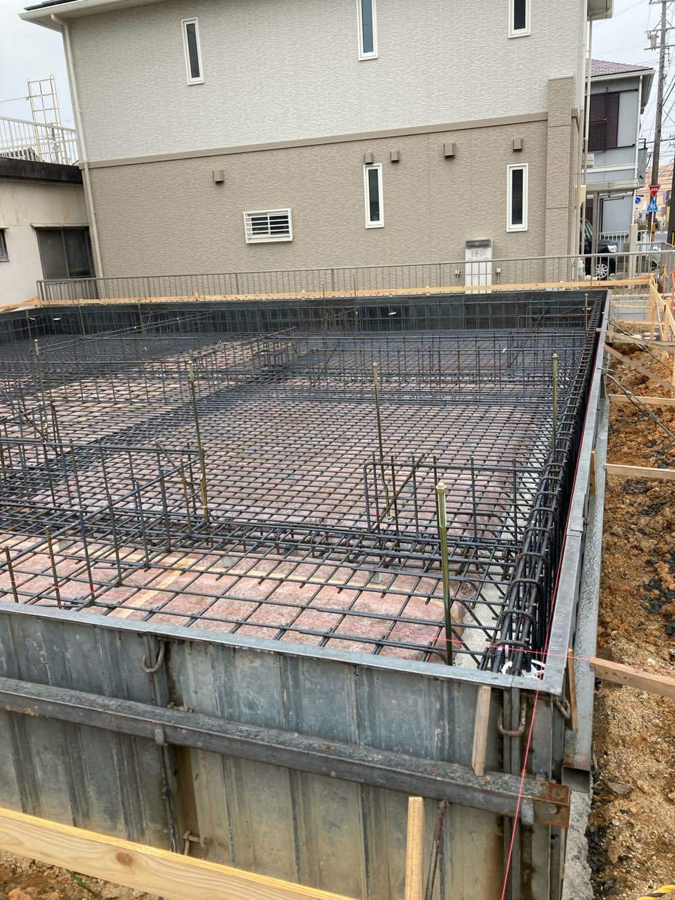 今回は、n様のご要望で床断熱の仕様になっています。また、外壁は付加断熱を施すので、基礎面から外壁面が随分出てくるのが気になるとの事で、立ち上がり基礎の厚みも厚くしています。その為ダブル配筋になったので、とても頑丈に見えます。(実際も丈夫ですね)