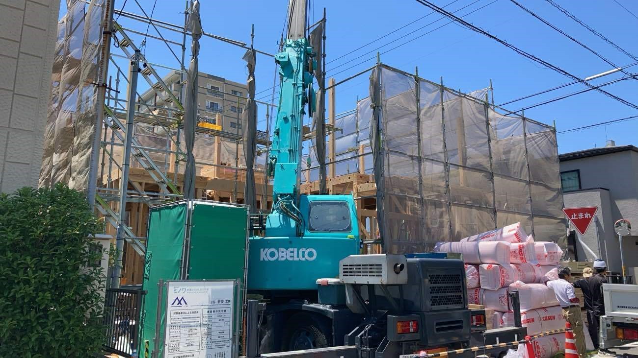 昨日、建て方が行われました。日差しは強いものの、気持ち良い風が吹いており、作業しやすい良いお天気でした。今回は、h喜大工さん、y貴大工さんに久しぶりに参加いただき、街中で作業しにくい状況でしたが、何とか2階の剛床まで施工することができました。夕方には恒例の上棟式も行われ、n様は大工さん達の『木遣りの唄』に感動されたそうです。