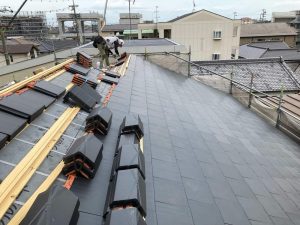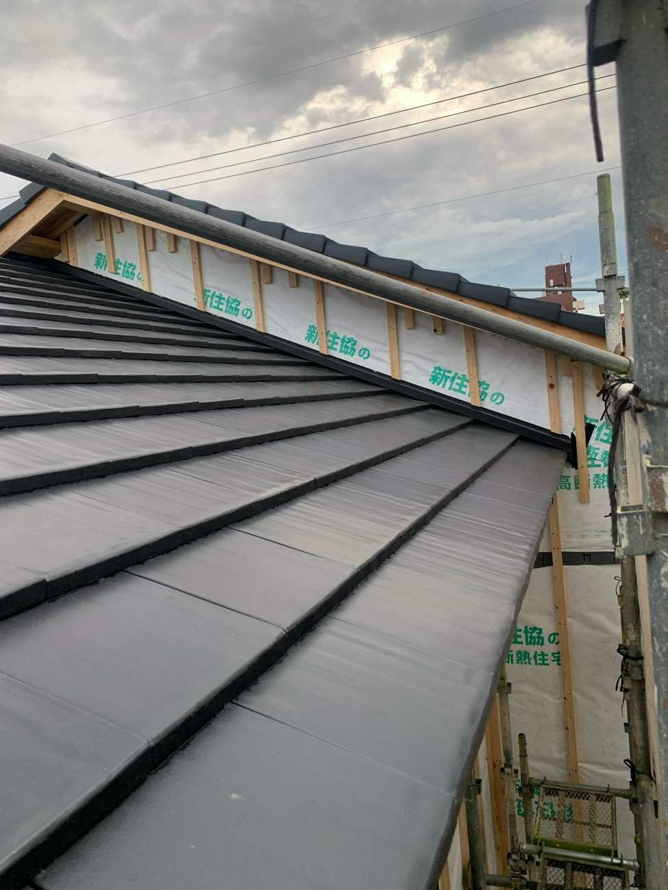 外部は、白川町からm濃屋さんが瓦を葺きに来ています。作業3日目、1階部分は葺き終わり、大屋根部分を施工中です。今日は少し風が強くて涼しいですが、いつもの癖で空調服を着て作業してしまっているのだそう(笑)けれど、曇っていても急に暑くなる事がありますもんね~『備えあれば患いなし』屋根の上は逃げる場所が無いので、重要です👍