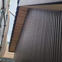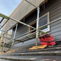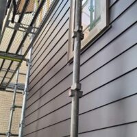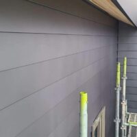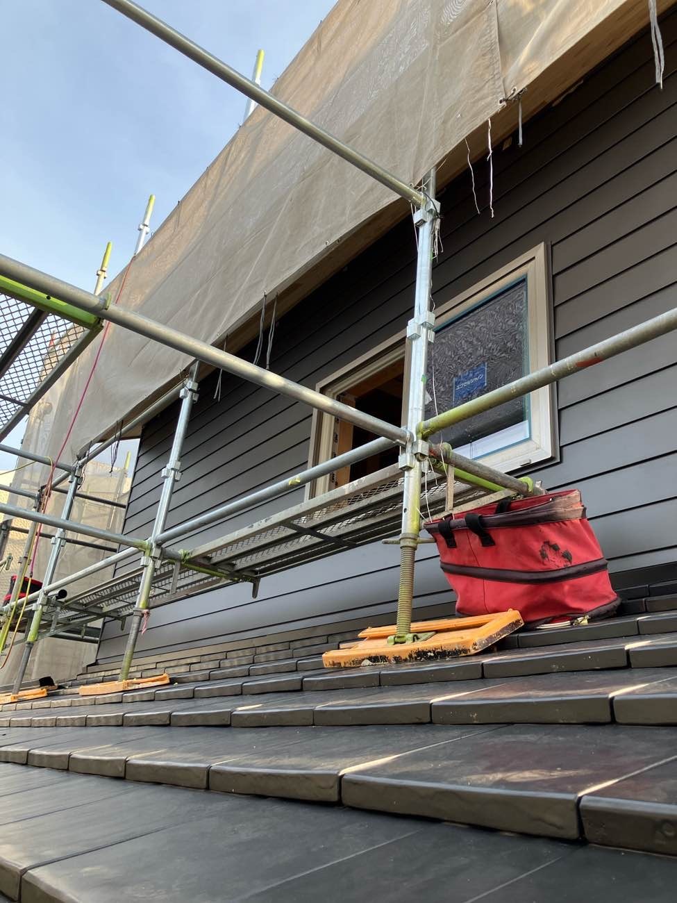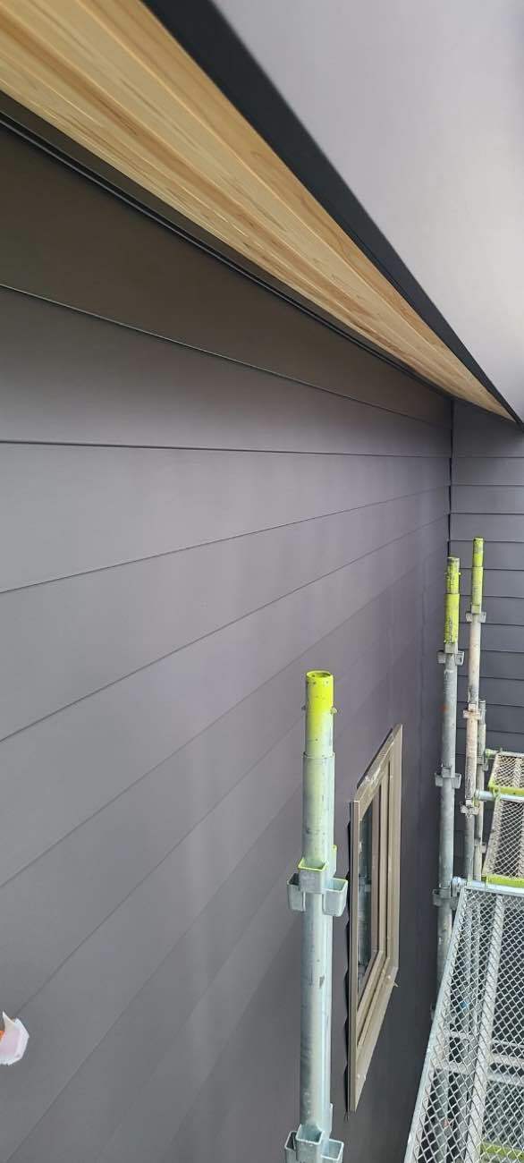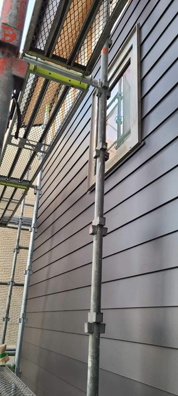 外壁の板金工事が行われています。通りからよく見えるところは横張り、あまり見えないところは縦張りです。コストが変わるので、よくこう言った張り分けを行います👍黒に近いグレー色は、カッコイイ印象になりますね。外壁の色は迷いますよね~いい感じです。