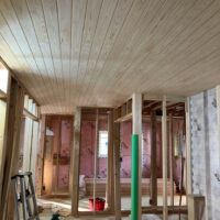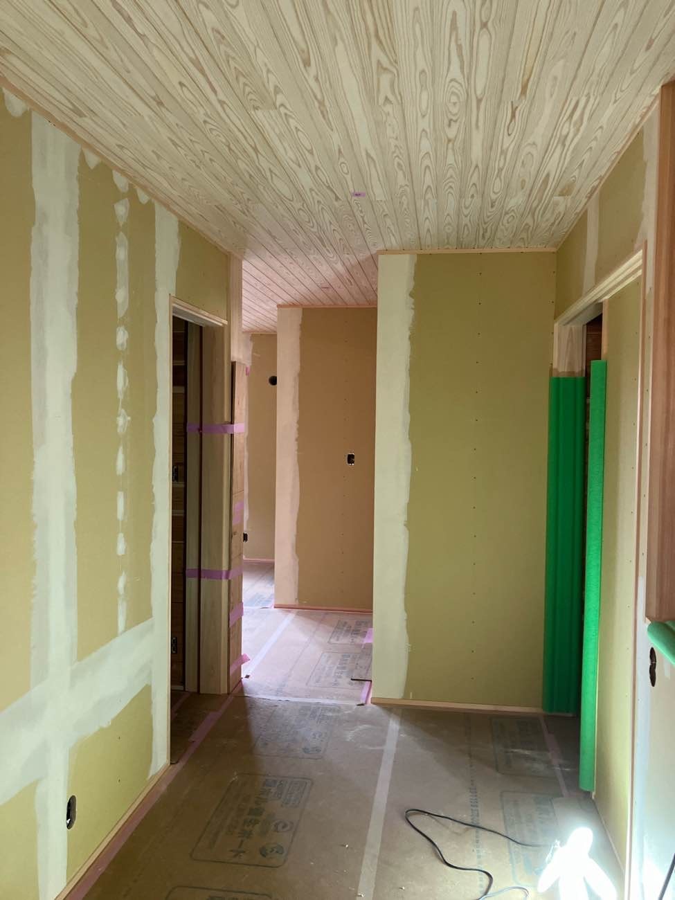 内部は、天井を張っています。玄関は壁が真壁で東濃ひのきの柱が現れ、天井は杉の羽目板です。玄関は滞在しない空間ですが、ファーストコンタクトの場所なので、やっぱりこだわりたいですよね。現場は、k保木君がまた応援に来てくれています。i井棟梁は、大型台風が来る前に稲刈りの仕事でちょっとだけ抜けています。