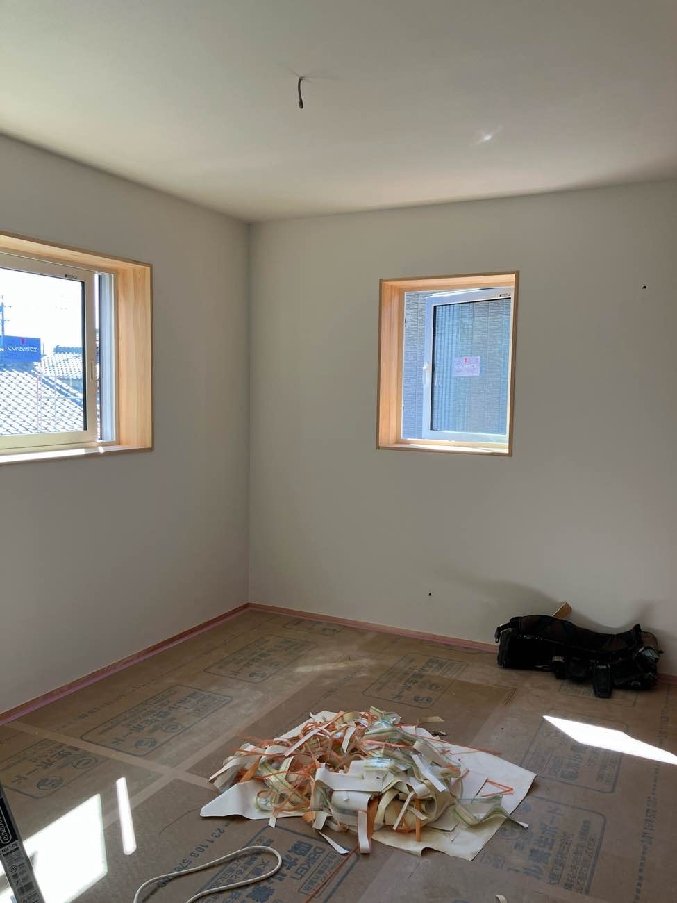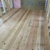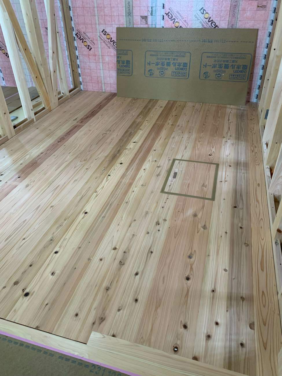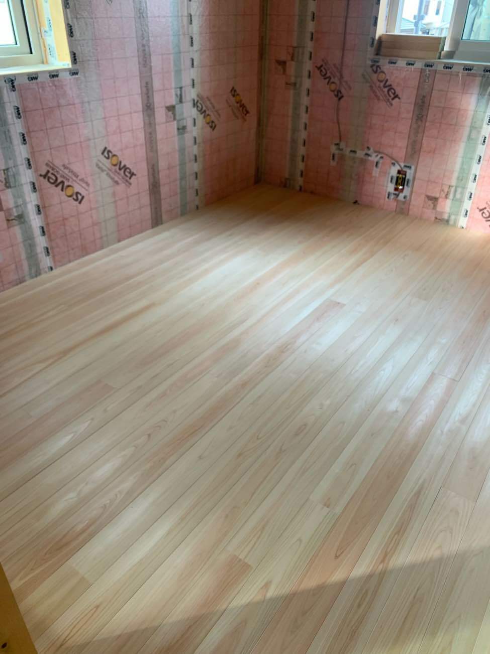 屋内は平和です。k保木大工さんが、床を張った様子を📸撮ってくれました。2階居室の床はヒノキの無節👍ヒノキ中毒の私は、写真を見るだけで良い香りがしてきます(笑)