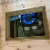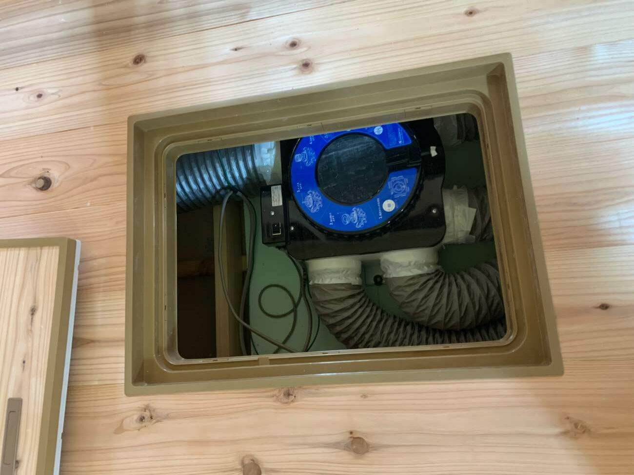 今回の換気扇は、排気がダクトの第三種換気扇です。本体を1、2階の間に設けますので、1階天井に点検口を設けるか、2階床に点検口を設けるかですが、今回は2階床にされました。こちらの方がメンテナンスや点検しやすいですし、照明器具にも干渉しないので良さそうです👍